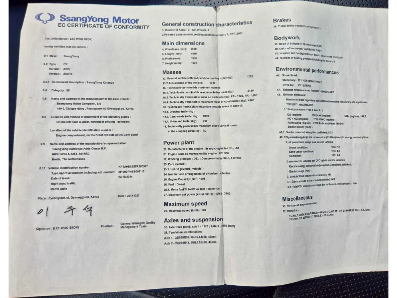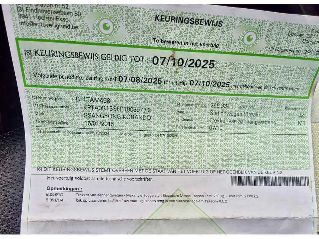 Motor stuk! Opgelet, deze auto zal niet worden gekeurd voor verkoop (van toepassing op Belgische particuliere kopers). Nee Merk: SsangYong Model: Korando Bouwjaar: 2015 Afgelezen kilometerstand: 276804km Cilinderinhoud: 1998cc Vermogen (kW): 109kW Brandstof: diesel Chassisnummer: KPTA0B1SSFP180397 Aantal zitplaatsen: 5 Emissieklasse: Euro5B Nationaliteit documenten: Belgisch Start en rijdt: NEEN Keuringsrapport geldig tot: 7/10/2025 startinformatie : Motor stuk Vavato voert geen technische keuring uit.: true Leder bekleed: true Inschrijvingsbewijs - deel 1 : Aanwezig Inschrijvingsbewijs - deel 2: Aanwezig