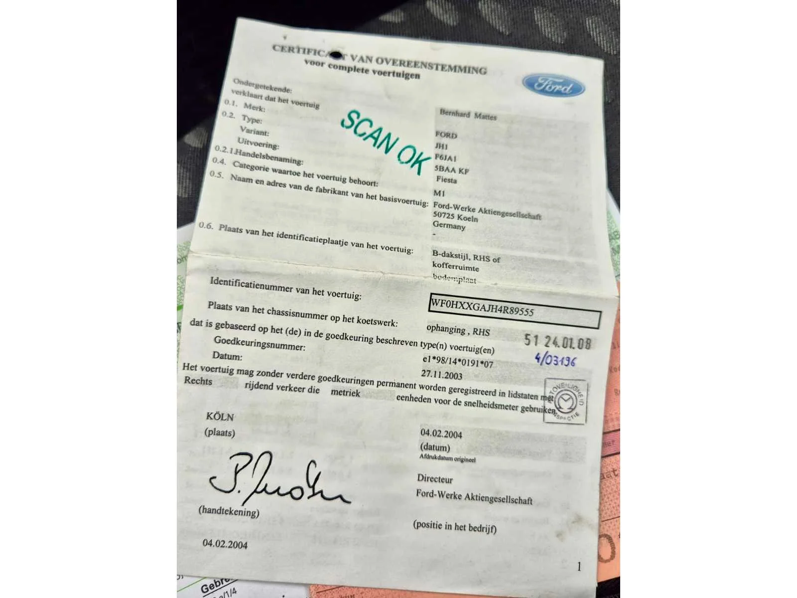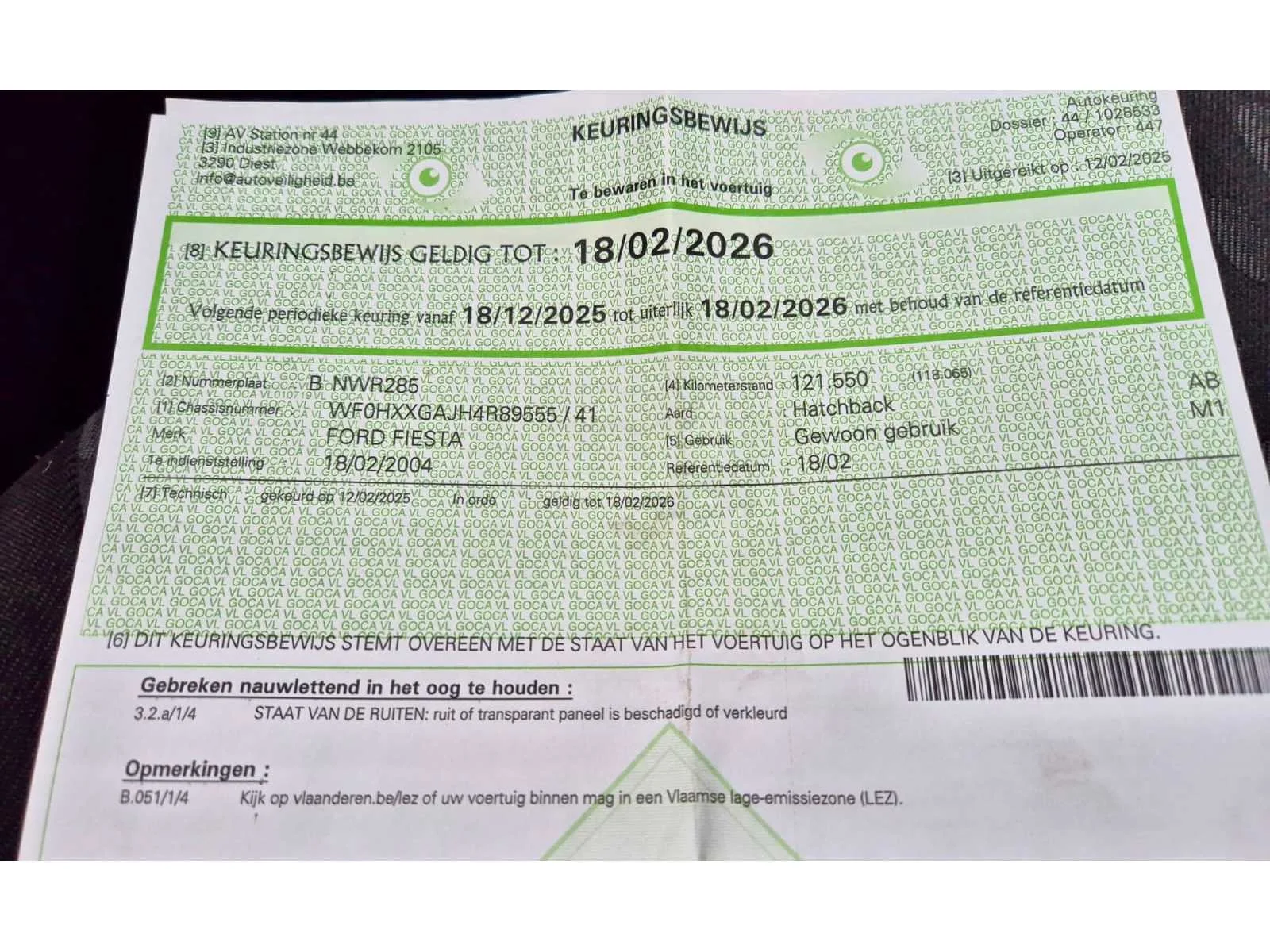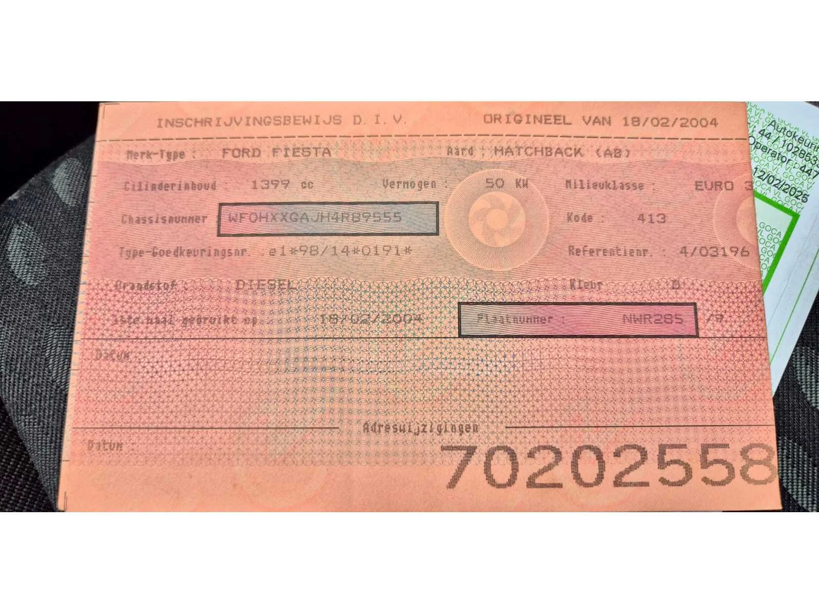 Opgelet, deze auto zal niet worden gekeurd voor verkoop (van toepassing op Belgische particuliere kopers). Nee Merk: Ford Model: Fiesta Bouwjaar: 2004 Afgelezen kilometerstand: 123454km Cilinderinhoud: 1399cc Vermogen (kW): 50kW Brandstof: diesel Chassisnummer: WFOHXXGAJH4RB9555 Emissieklasse: Euro 3 Nationaliteit documenten: Belgisch Keuringsrapport geldig tot: 18/02/2016 Vavato voert geen technische keuring uit.: true Inschrijvingsbewijs - deel 1 : Aanwezig Inschrijvingsbewijs - deel 2: Aanwezig