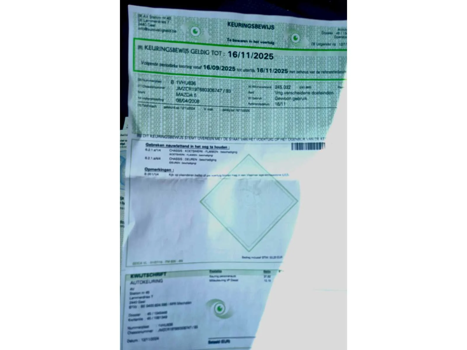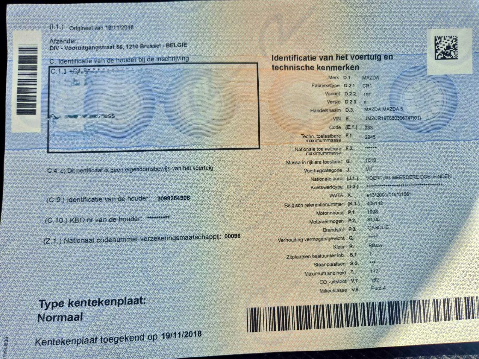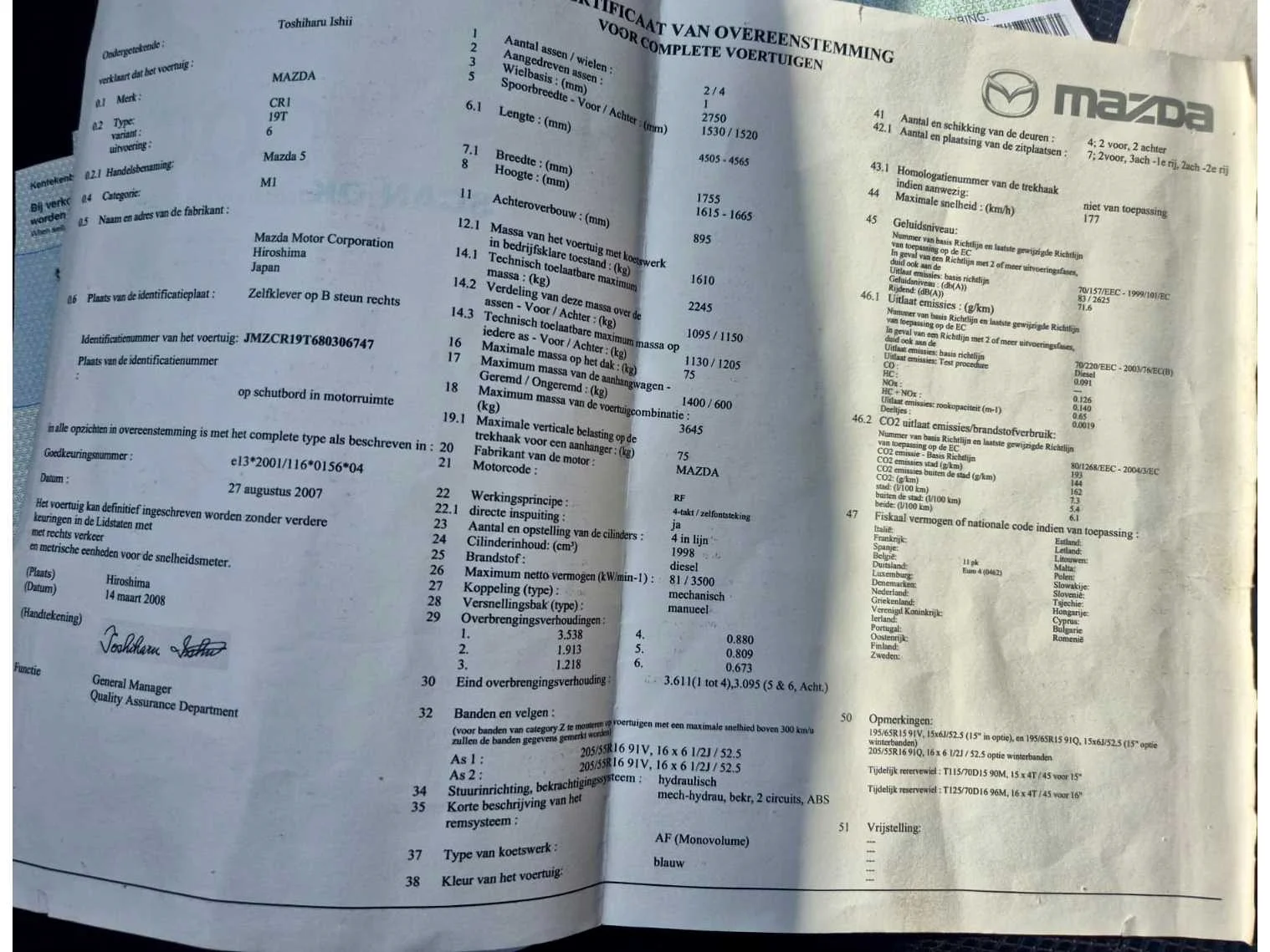 Opgelet, deze auto zal niet worden gekeurd voor verkoop (van toepassing op Belgische particuliere kopers). Nee Merk: Mazda Model: 5 Bouwjaar: 2008 Afgelezen kilometerstand: 245604km Cilinderinhoud: 1998cc Vermogen (kW): 81kW Brandstof: Diesel Chassisnummer: JMZCR19T680306747 Emissieklasse: Euro4 Nationaliteit documenten: Belgisch Keuringsrapport geldig tot: 11/2025 Zichtbare schade: Zie foto’s. Vavato voert geen technische keuring uit.: true Inschrijvingsbewijs - deel 1 : Aanwezig Inschrijvingsbewijs - deel 2: Aanwezig