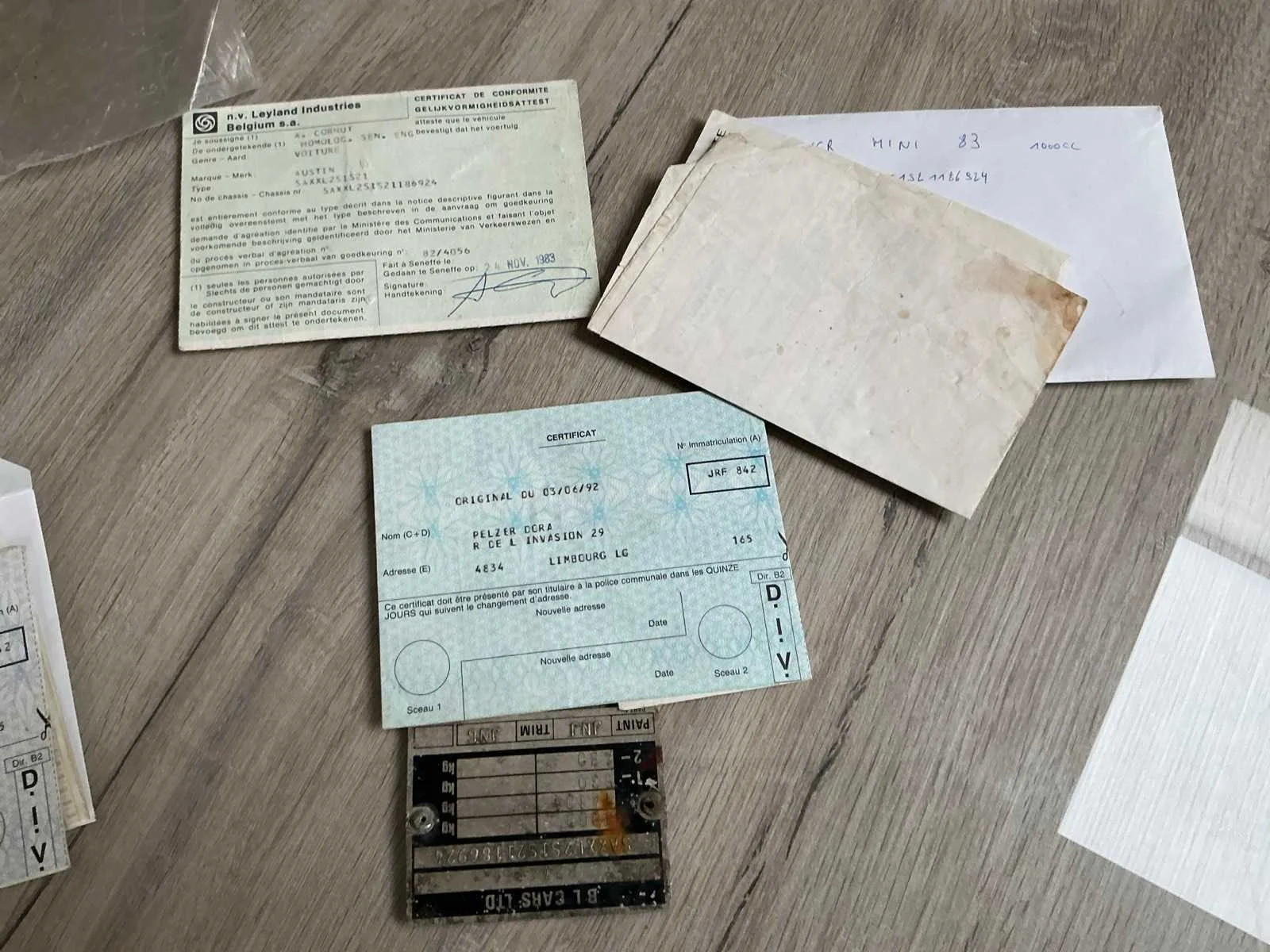 Identificatiepapier en plaquettes meegeleverd voor restauratie Nee Merk: Austin Type: Mini Inschrijvingsbewijs - deel 1 : Ok Inschrijvingsbewijs - deel 2: Ok Gelijkvormigheidsattest aanwezig: true