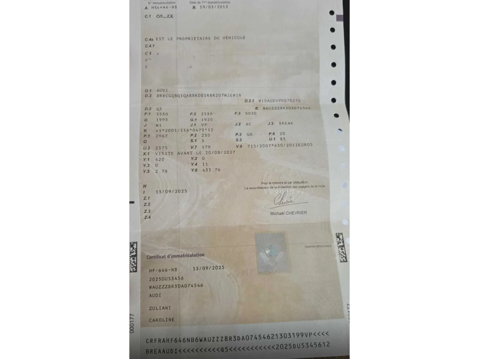 Audi SQ5 3.0 V6 BiTDI 8R Auto Leder/Alcantara bekleding met S Q5 logo Elektrische sportstoelen Multifunctioneel sportstuur met platte bodem MMI Navigatiesysteem Automatische klimaatregeling met twee zones LED-verlichting voor/achter Audi SQ5 20'' lichtmetalen velgen Afneembare trekhaak Cruisecontrol Audi audiosysteem Parkeer sensoren Inzetstukken van geborsteld aluminium Fout ABS-waarschuwingslampje CT OK Frans kentekenbewijs Non Merk: Audi Model: SQ5 Type: 3.0 V6 BiTDI 8R Bouwjaar: 2013 Afgelezen kilometerstand: 238000km Cilinderinhoud: 2967cc Vermogen (kW): 230kW Brandstof: diesel Chassisnummer: WAUZZZ8R3DA074546 Datum eerste toelating: 2013 Vermogen (pk): 313hp Aandrijving: Gauche Aantal zitplaatsen: 5 Kleur: NOIR Transmissie: Automaat Aantal deuren: 5 Aantal sleutels: 1 Velgmaat: 20 Aantal cilinders: 6 startinformatie : Demarre et roule Vavato voert geen technische keuring uit.: true Airconditioning: true Vierwielaandrijving 4x4: true