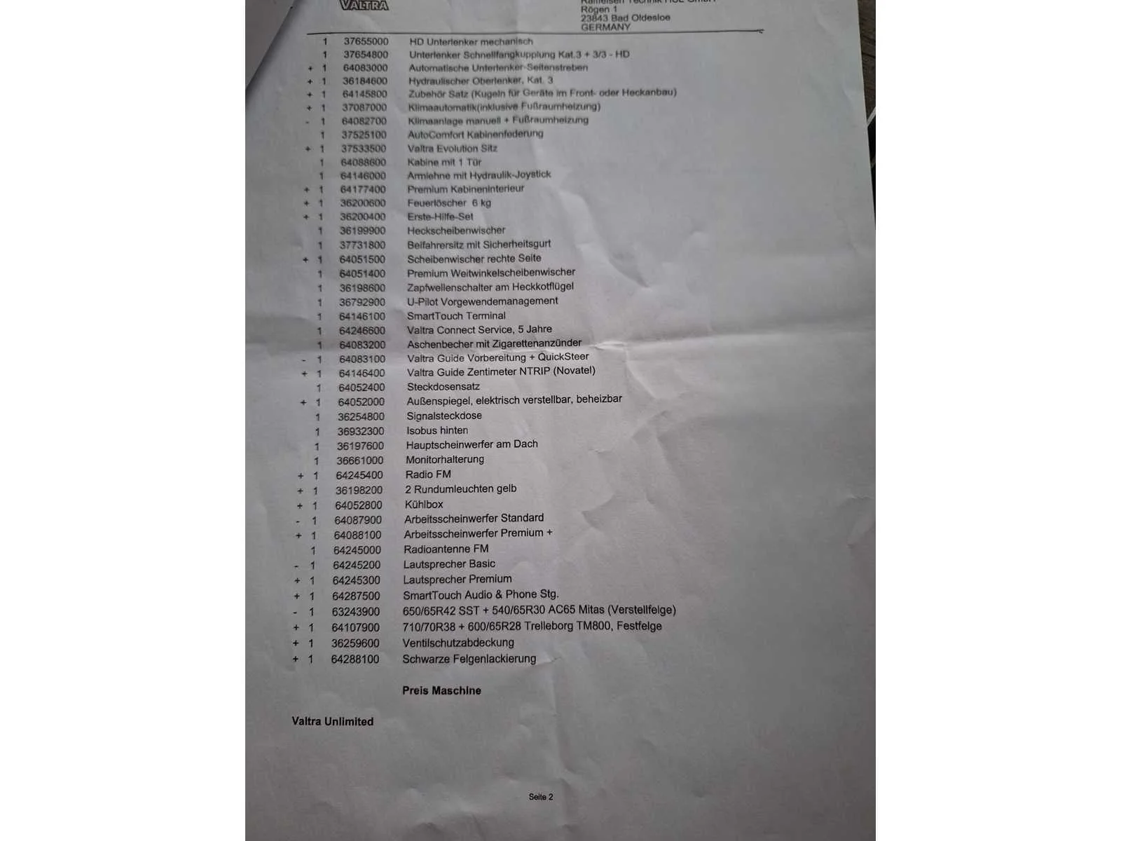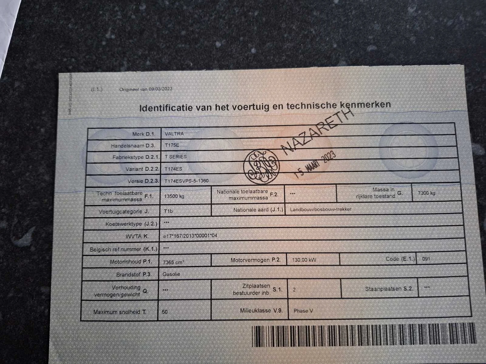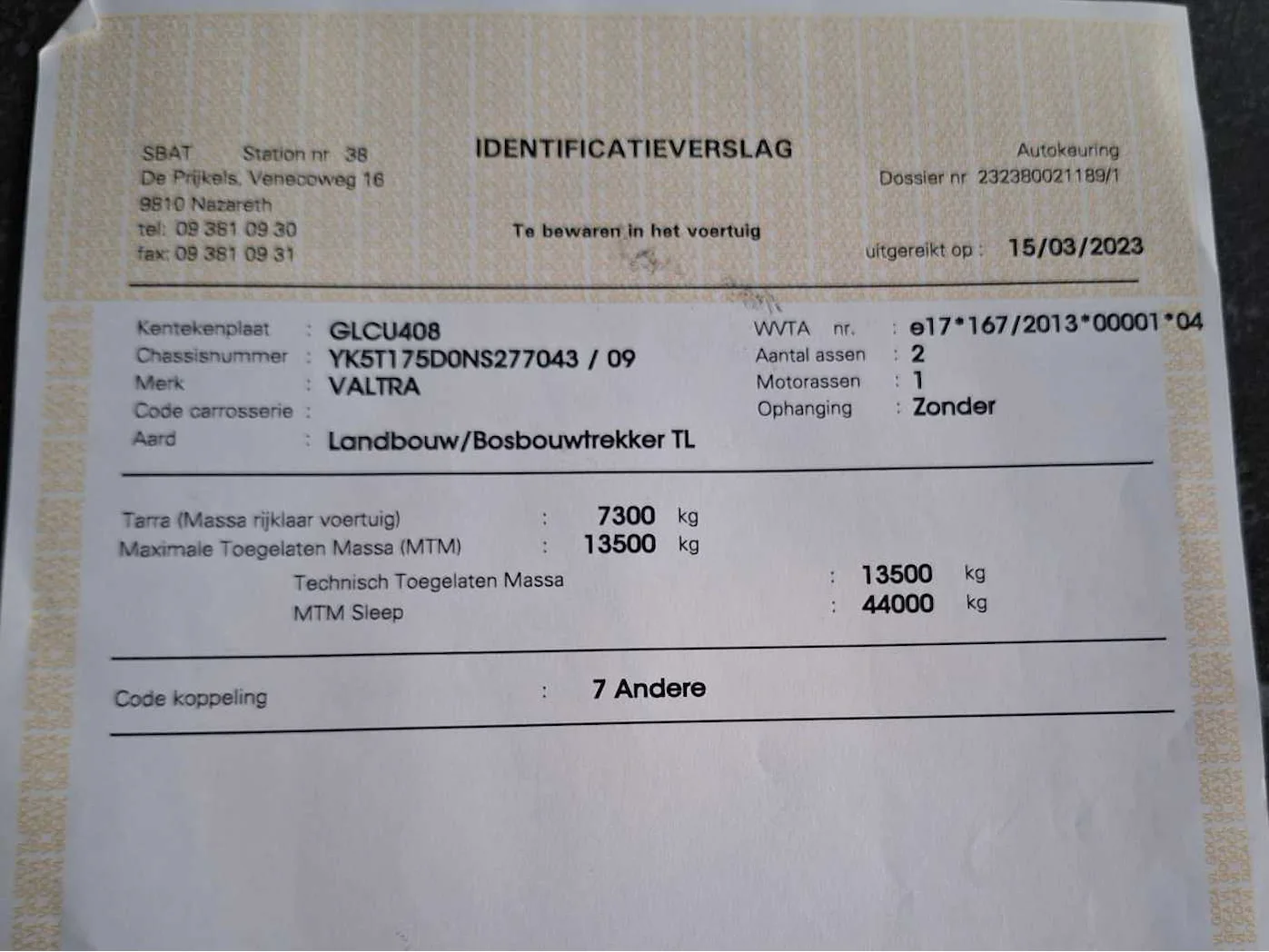 Nee Merk: Valtra Type: T175E Bouwjaar: 2022 Serienummer: 2238250AA Motorvermogen (kW): 130kW Afgelezen urenstand: 2250 Versnellingsbaktype: Vario Aantal hydraulische ventielen voor: 1 Aantal hydraulische ventielen achter: 5 Bandenmaat voor: 600/65R28 Bandenmaat achter: 710/70R38 Fronthefinrichting: true Frontaftakas: true Cabine: true Luchtgeveerde stoel: true Eigen gewicht: 7300kg Chassisnummer: YK5T175D0NS277043 Datum eerste toelating: 15/11/2022 Nationaliteit documenten: Belgisch