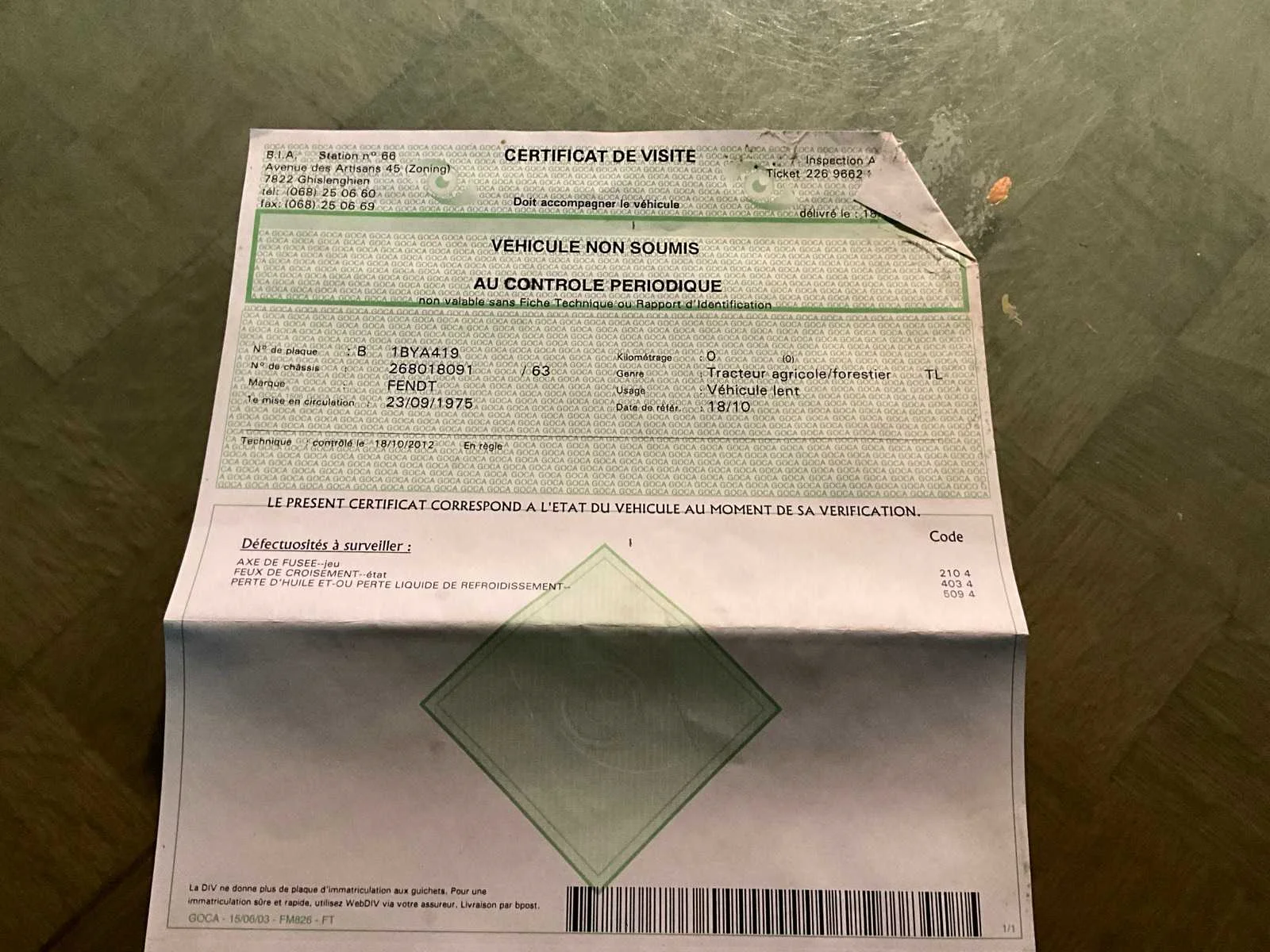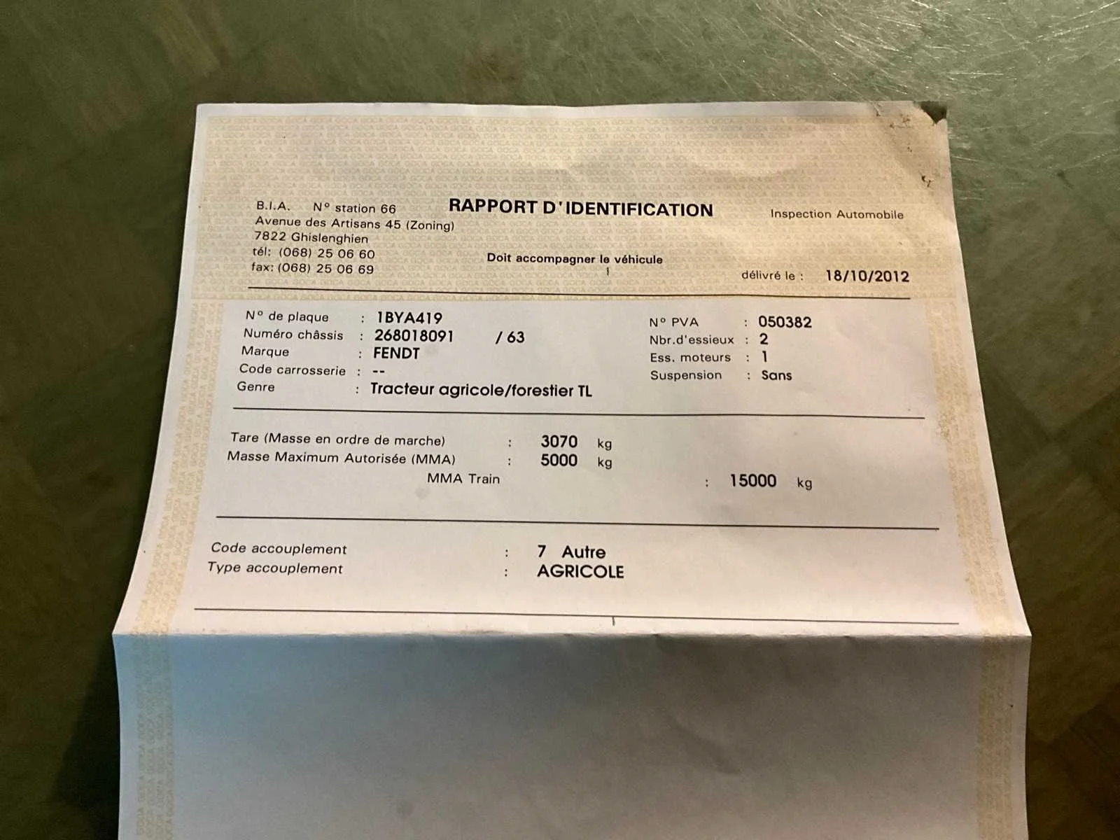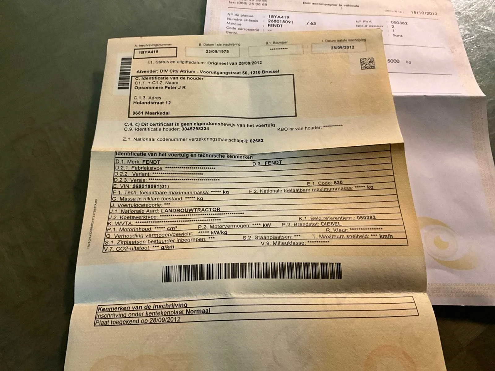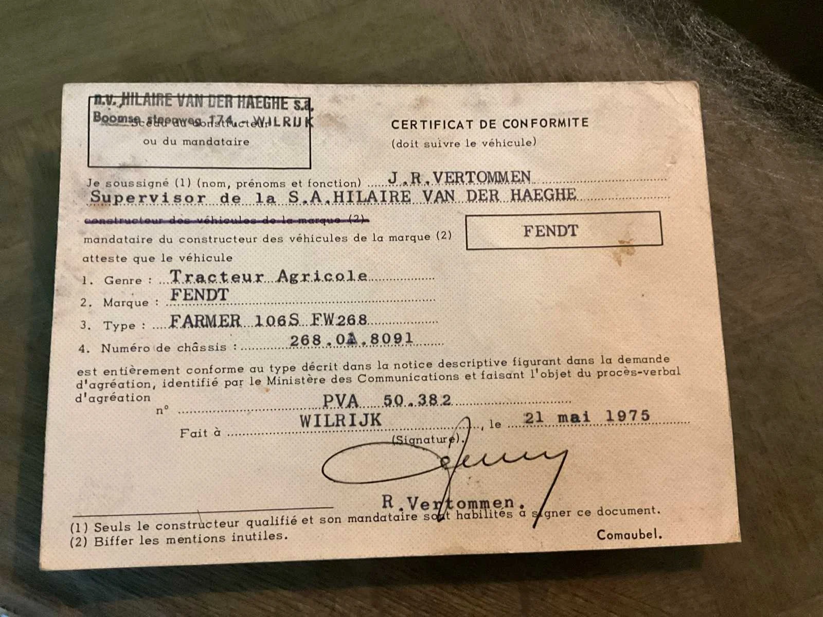 Merk: Fendt Type: Farmer 106S Turbomatik Bouwjaar: 1975 Serienummer / Chassisnummer: 268.04.8091 Kenteken: 1-BYA-419 Aandrijving: 2WD (achterwielaandrijving) Brandstof: Diesel Motor: Deutz F4L912 (4-cilinder luchtgekoelde dieselmotor) Motorvermogen: 100 pk → ≈ 74 kW Versnellingsbaktype: Handgeschakeld (12 vooruit / 4 achteruit met Turbomatik koppeling) Aftakastoerental (PTO): 540 / 1000 rpm Nee Merk: Fendt Type: Farmer 106S Turbomatik Bouwjaar: 1975 Serienummer: 268.04.8091 Motorvermogen (kW): 74kW Afgelezen urenstand: 943 Versnellingsbaktype: Handgeschakeld (12 vooruit / 4 achteruit met Turbomatik koppeling) Aftakastoerental: 5401000rpm Bandenmaat voor: 11.00-16 Bandenmaat achter: 16.9-34 Aantal hydraulische ventielen achter: 2 Voorlader: true Eigen gewicht: 3070kg Totale afmeting L: 3950mm Totale afmeting Breedte: 1950mm Totale afmeting Hoogte: 2600mm Chassisnummer: 268.04.8091