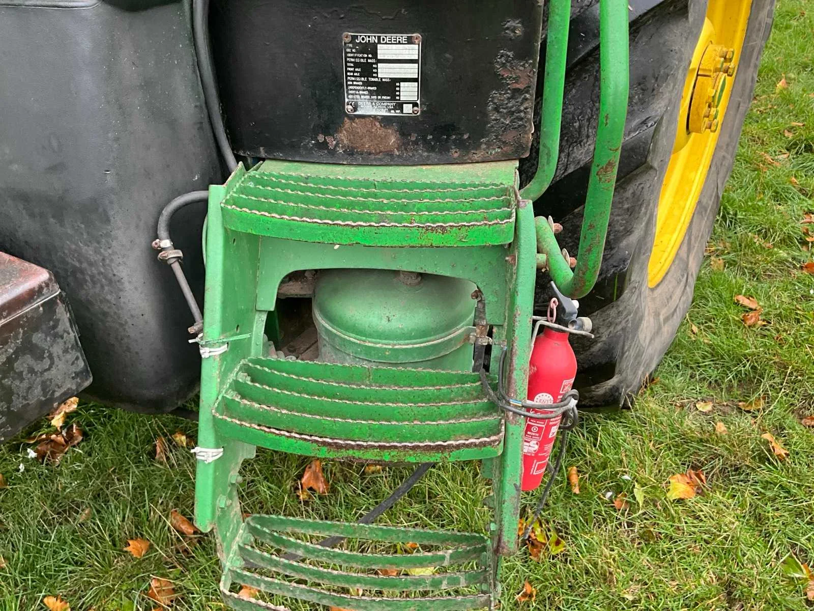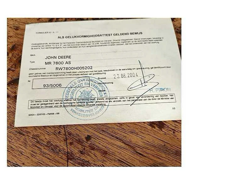 Merk: John Deere Type: 7800 AS Chassisnummer (VIN): RW7800H005202 Motorinhoud: 8.100 cc Vermogen: ± 107 kW (145 pk) Aandrijving: 4x4 (vierwielaandrijving) Versnelling: PowerShift-transmissie Eigen gewicht: 7.300 kg Toegelaten massa: tot 14.500 kg Voorasbelasting: 2.800–4.800 kg Achterasbelasting: 5.100–10.000 kg Trekvermogen toegestaan (geremd): 8.000 kg Kleur: Groen / Geel Nee Merk: John Deere Type: 7800AS Bouwjaar: 1993