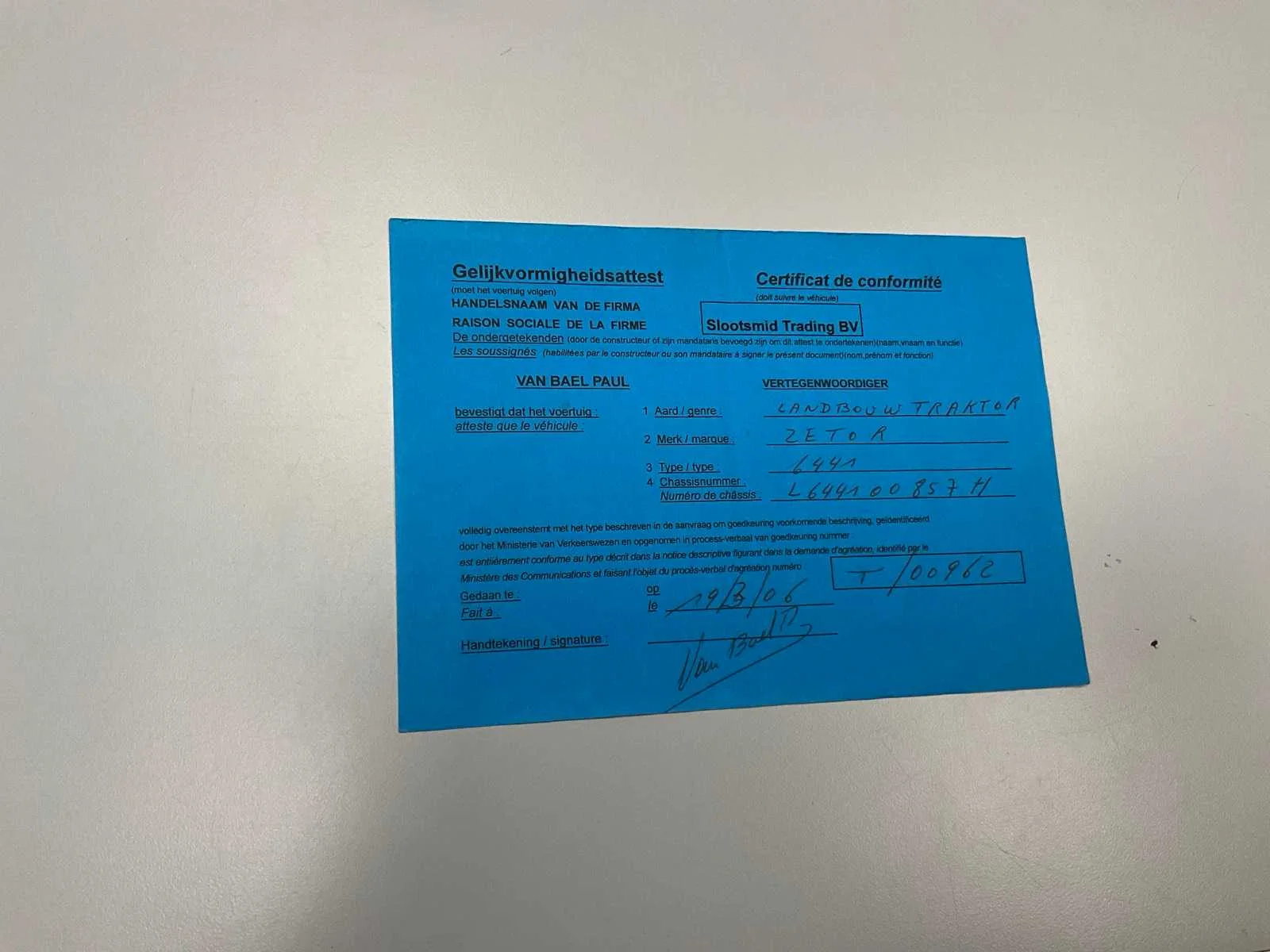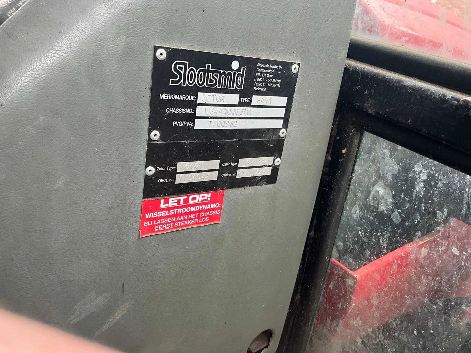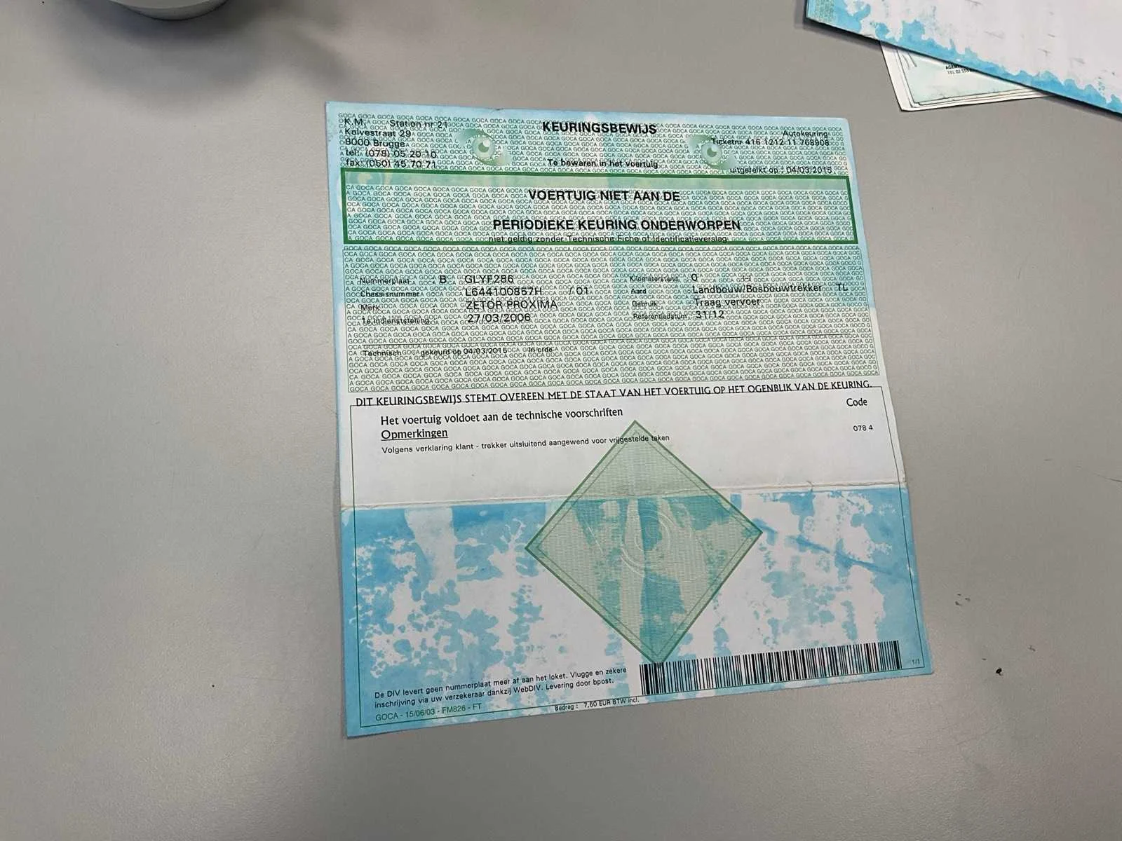 Tractor Zetor Proxima 6441: eerste indienststelling 27/03/2006, Tara 3870 kg, MTM 5400 kg, MTM 11800 kg. Eerste indienststelling: 27/03/2006 met frontlader voor Trac-Lift 220 SL, bouwjaar: november 2005 en aanbouwwerktuig: grondbak met klem, serienummer 532924921275: werkbreedte 185 cm. Werkurenstand: niet afleesbaar Alle documenten aanwezig No Merk: Zetor Type: Proxima 6441 Bouwjaar: 2006 Serienummer: 532924921275 Motorvermogen (kW): 55kW Eigen gewicht: 3870kg Kentekenpapieren compleet?: true Chassisnummer: L644100857H Datum eerste toelating: 27/03/2006 Nationaliteit documenten: BE