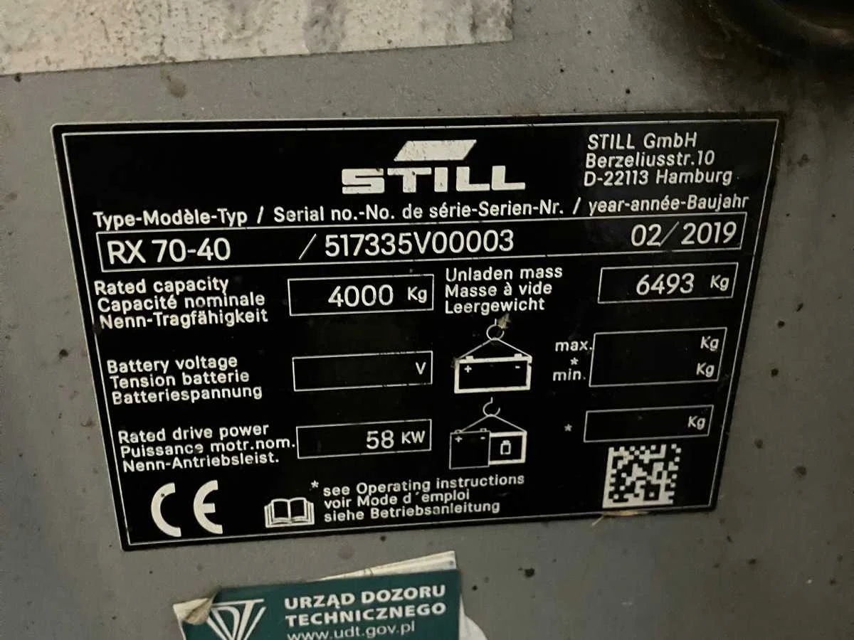 Nee Merk: Still Type: RX70-40 Bouwjaar: 2019 Serienummer: 517335V00003 Mast: duplex Soort band: full rubber Aantal wielen: 4 Afgelezen urenstand: 3700 Side-shift: true Duplex mast: true Eigen gewicht: 6493kg Hefvermogen: 4000kg Lepellengte: 3000mm Min. hefhoogte: 0mm Max. hefhoogte: 4500mm Hefhoogte: 4500mm Vol rubber banden: true Minimale doorrijhoogte: 0mm Totale afmeting L: 3000mm Totale afmeting Breedte: 1400mm Totale afmeting Hoogte: 2800mm LPG: true