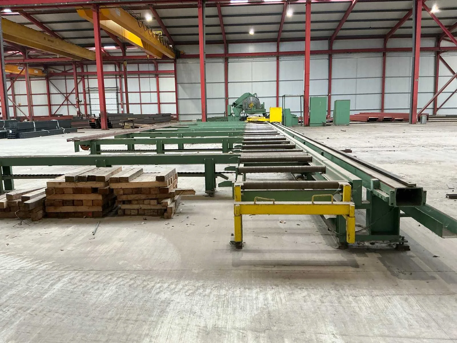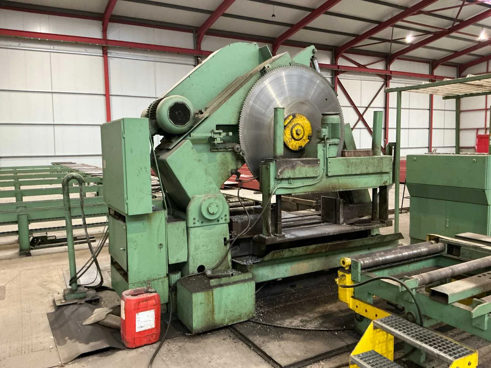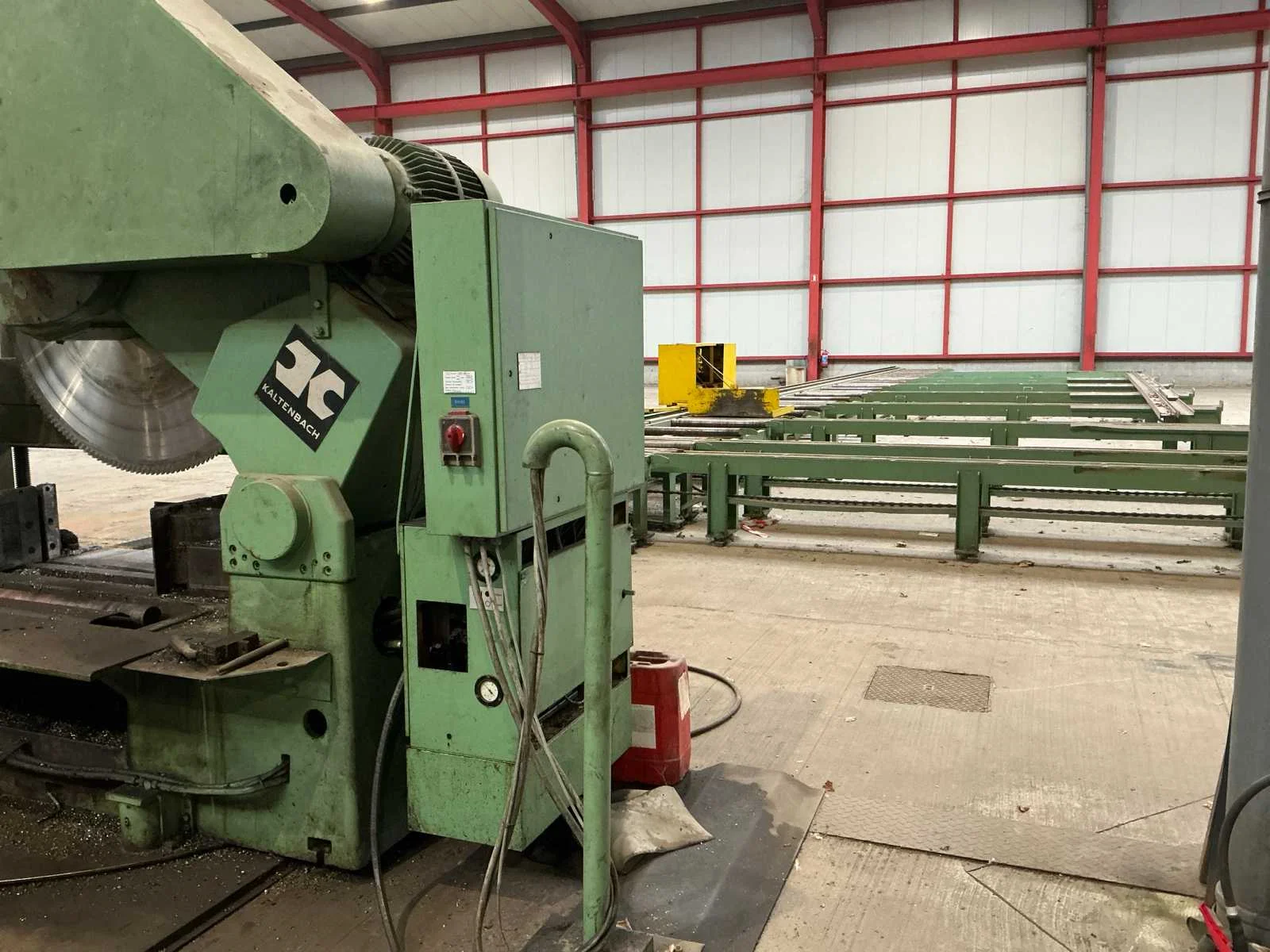 Cirkelzaagmachine in perfect werkende staat. Meetwagen in perfect werkende staat. 1 reserve zaagblad. Plus minus 50 meter rolbanen. Maximum staalbalk HEM 1000. Automatisch aanvoer en afvoer. Rolbaan 5 meter breed. 45 graden verstekzaag. Gedeeltelijk gedemonteerd. Rolbrug aanwezig. Nee Merk: Kaltenbach Type: HDM 1310 Bouwjaar: 1991 Zaagblad Ø: 1400mm Verstekhoek max.: 45° Machinegewicht: 7500kg