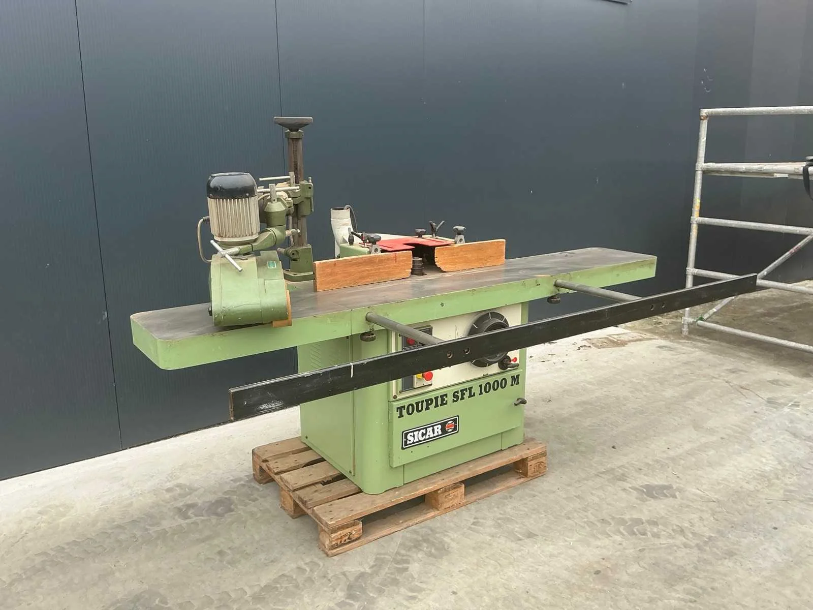 Sicar SLF 1000 M (ook wel spindelfreesmachine genoemd) is een machine waarbij een verticale as (spil) roteert met een frees- of profielkop. Hout wordt langs de spil geleid over een werktafel, waardoor het profiel of de vorm in het werkstuk wordt gefreesd. Lengte 2m50, breedte 90cm hoogte 1meter. Toupie as 50mm aanvoerapparaat met 4 rollen. 4 snelheden. Nee Merk: Sicar Type: SFL 1000 M Bouwjaar: 1991 Aansluiting: 380V Aantal snelheden: 4 Totale afmeting Breedte: 900mm Totale afmeting Hoogte: 1000mm Leveringsvoorwaarden: Heftruck aanwezig