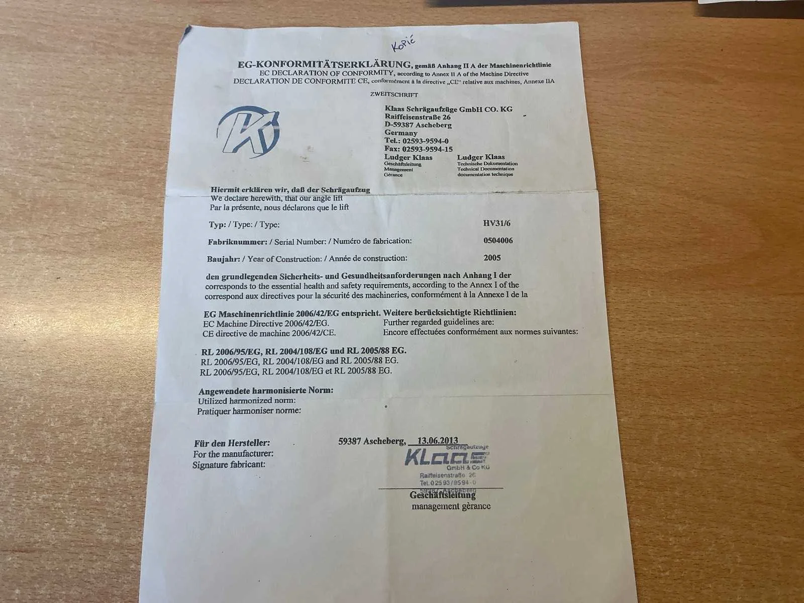 Afmetingen zijn in transportstand Nee Merk: Klaas Type: S1 Bouwjaar: 2005 Serienummer: 2716 Kenteken: 1QDO637 Max. platformhoogte: 21m Max. belasting: 300kg Eigen gewicht: 900kg Totale afmeting L: 5900mm Totale afmeting Breedte: 1350mm Totale afmeting Hoogte: 1500mm