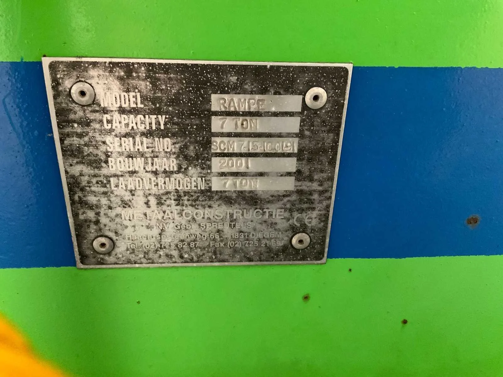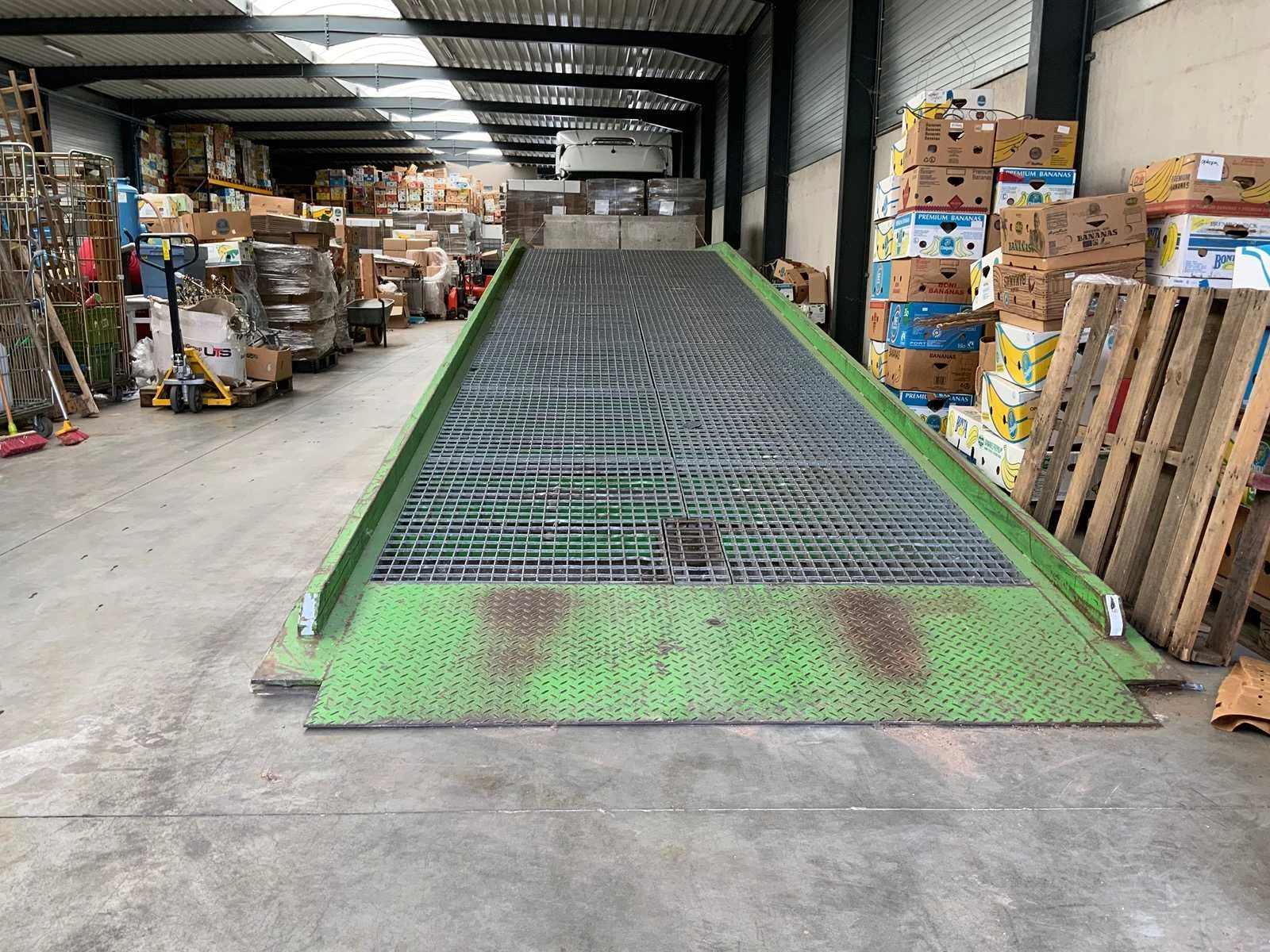 Laadbrug 8 ton – Gebroeders Spreutels, Diegem Volledig hydraulisch, verrijdbaar model op 380V. In zeer goede staat, recent onderhouden met vervanging van hydraulische olie. Degelijke industriële uitvoering, direct inzetbaar. Transport NL en B kan tegen kostprijs voorzien worden. Nee Merk: Spreutels Type: Rampe Bouwjaar: 2001 Serienummer: SCM715100191 Aansluiting: 380V Eigen gewicht: 2880kg Totale afmeting L: 10835mm Totale afmeting Breedte: 260mm