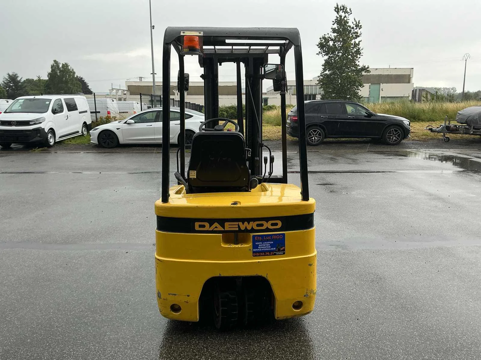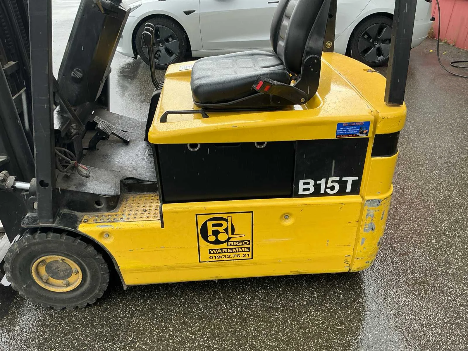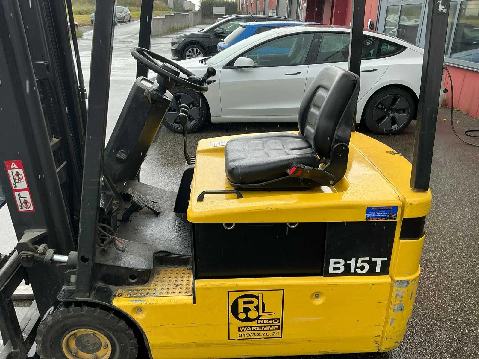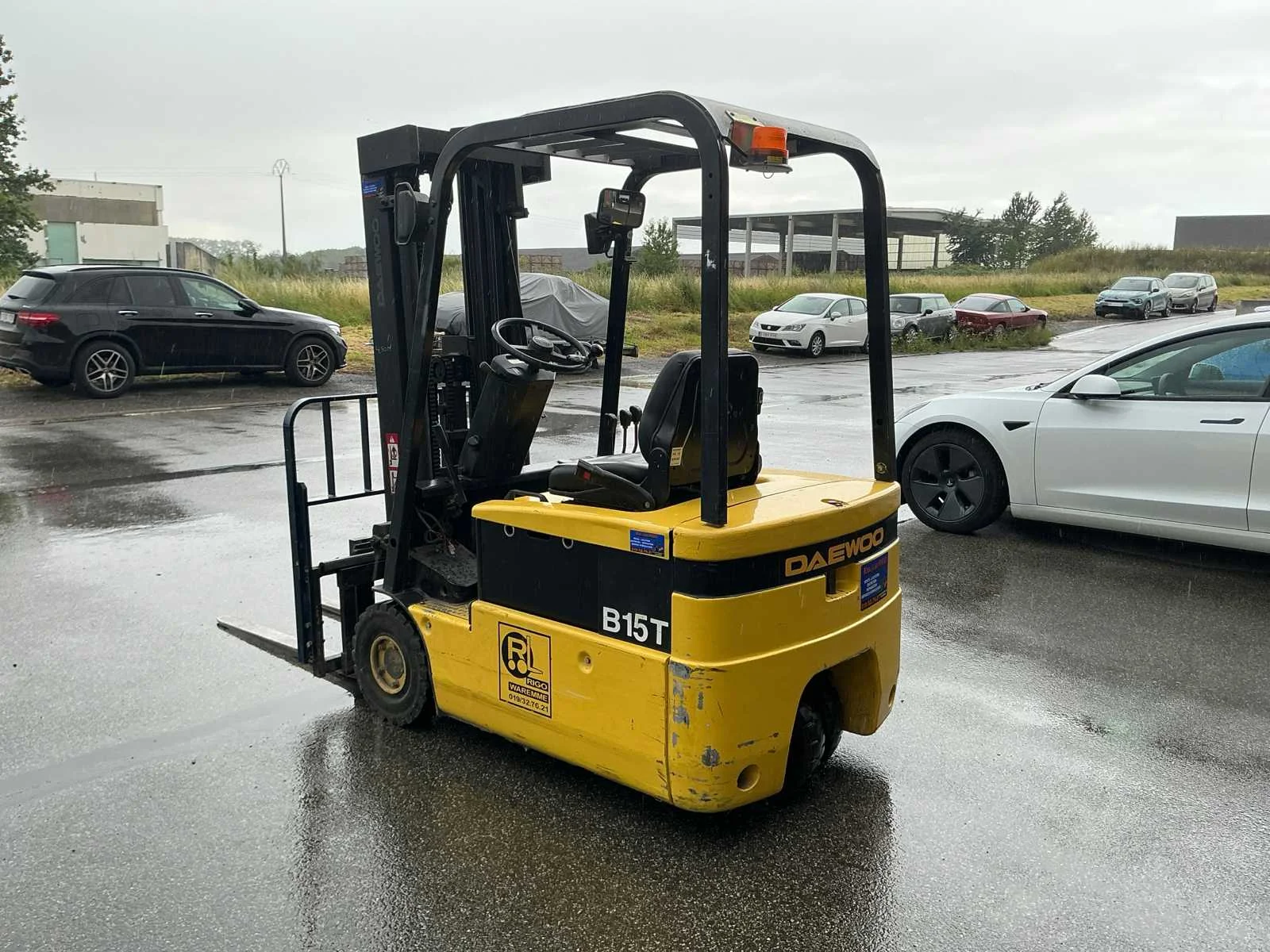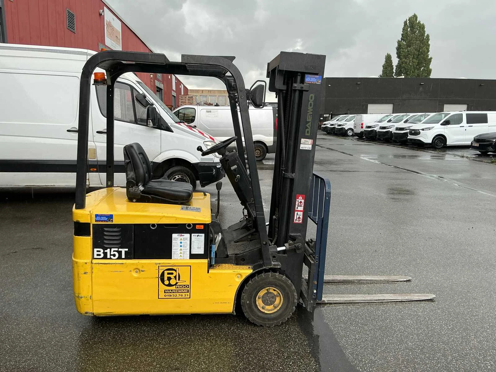 In gebruikte staat maar functioneel Non Merk: Daewoo Type: B15T-2 Bouwjaar: 1999 Serienummer: CG 00146 Brandstof: Elektrisch Soort band: Volrubber banden Aantal wielen: 4 Afgelezen urenstand: 8505 Hydraulisch verstelbare lepels: true Eigen gewicht: 3050kg Hefvermogen: 1350kg Lepellengte: 700mm Max. hefhoogte: 4500mm Vol rubber banden: true Minimale doorrijhoogte: 2050mm Totale afmeting L: 3090mm Totale afmeting Breedte: 1093mm
