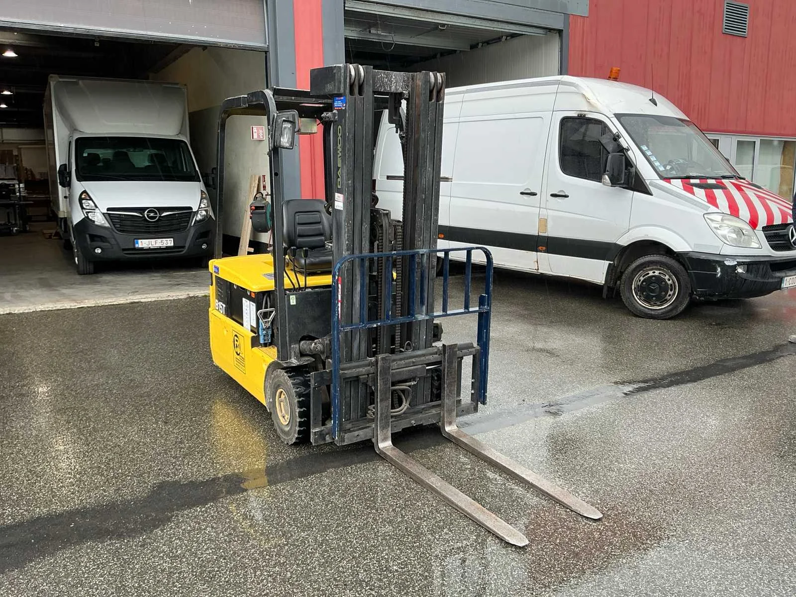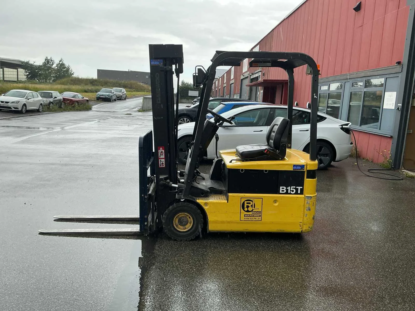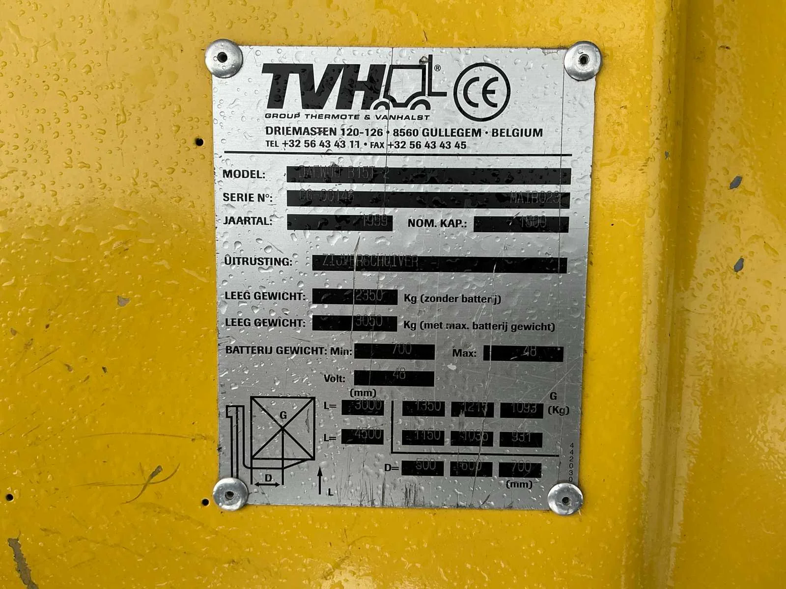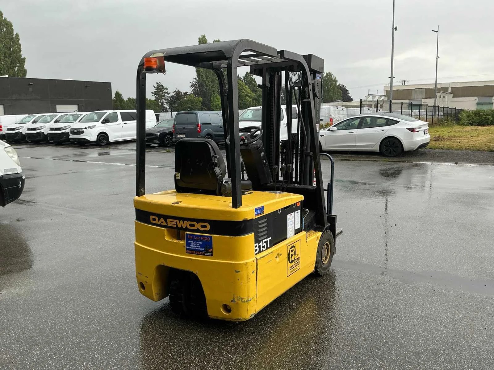 In gebruikte staat maar functioneel Non Merk: Daewoo Type: B15T-2 Bouwjaar: 1999 Serienummer: CG 00146 Brandstof: Elektrisch Soort band: Volrubber banden Aantal wielen: 4 Afgelezen urenstand: 8505 Hydraulisch verstelbare lepels: true Eigen gewicht: 3050kg Hefvermogen: 1350kg Lepellengte: 700mm Max. hefhoogte: 4500mm Vol rubber banden: true Minimale doorrijhoogte: 2050mm Totale afmeting L: 3090mm Totale afmeting Breedte: 1093mm