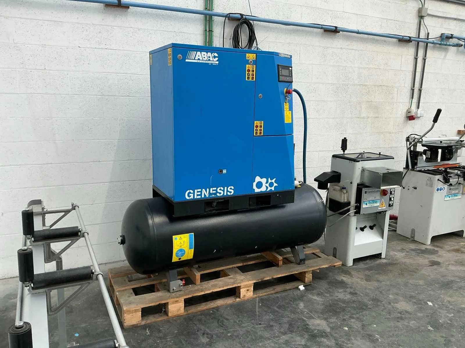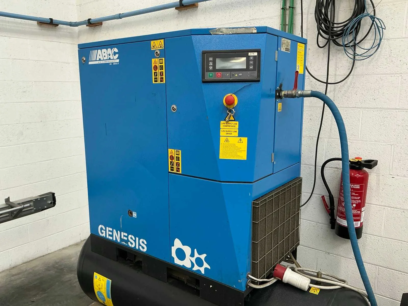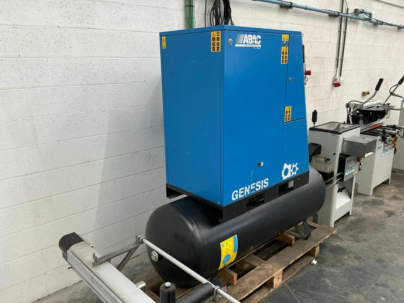 Compacte alles-in-één unit met 5,5 kW schroefcompressor, geïntegreerde luchtdroger en tank van 500 L. Werkdruk: 10 bar – 400 V driefasige voeding – R134a koelgas. In goede gebruikte staat, compleet en functioneel. Non Merk: ABAC Type: Genesis 5.5 500L Bouwjaar: 2013 Serienummer: CA1611436 Capaciteit.: 10bar Afgelezen urenstand: 3764 Aansluiting: 400V Eigen gewicht: 415kg