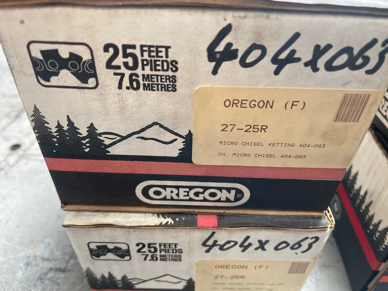 4 x Rollen 7.6 m Zaagketting 404" - 2 rollen 058" - 2 rollen 063". Incl schakels en verpakkingsdozen. Ongebruikt - rollen zijn compleet ongebruikt. Zaagketting 404" . Nee Merk: Oregon Type: 404