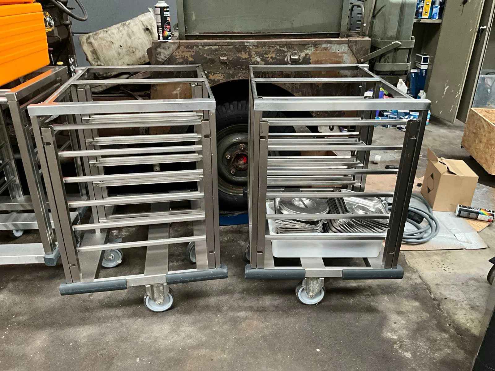Waaronder 3 mobiele onderstellen, een stoomoven, warm/koud hou machine, bordverwarmers met borden en diverse plateaus en 3 warmte houders. ( + diverse extra’s) Nee