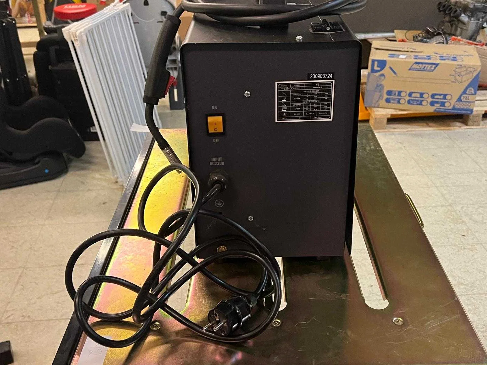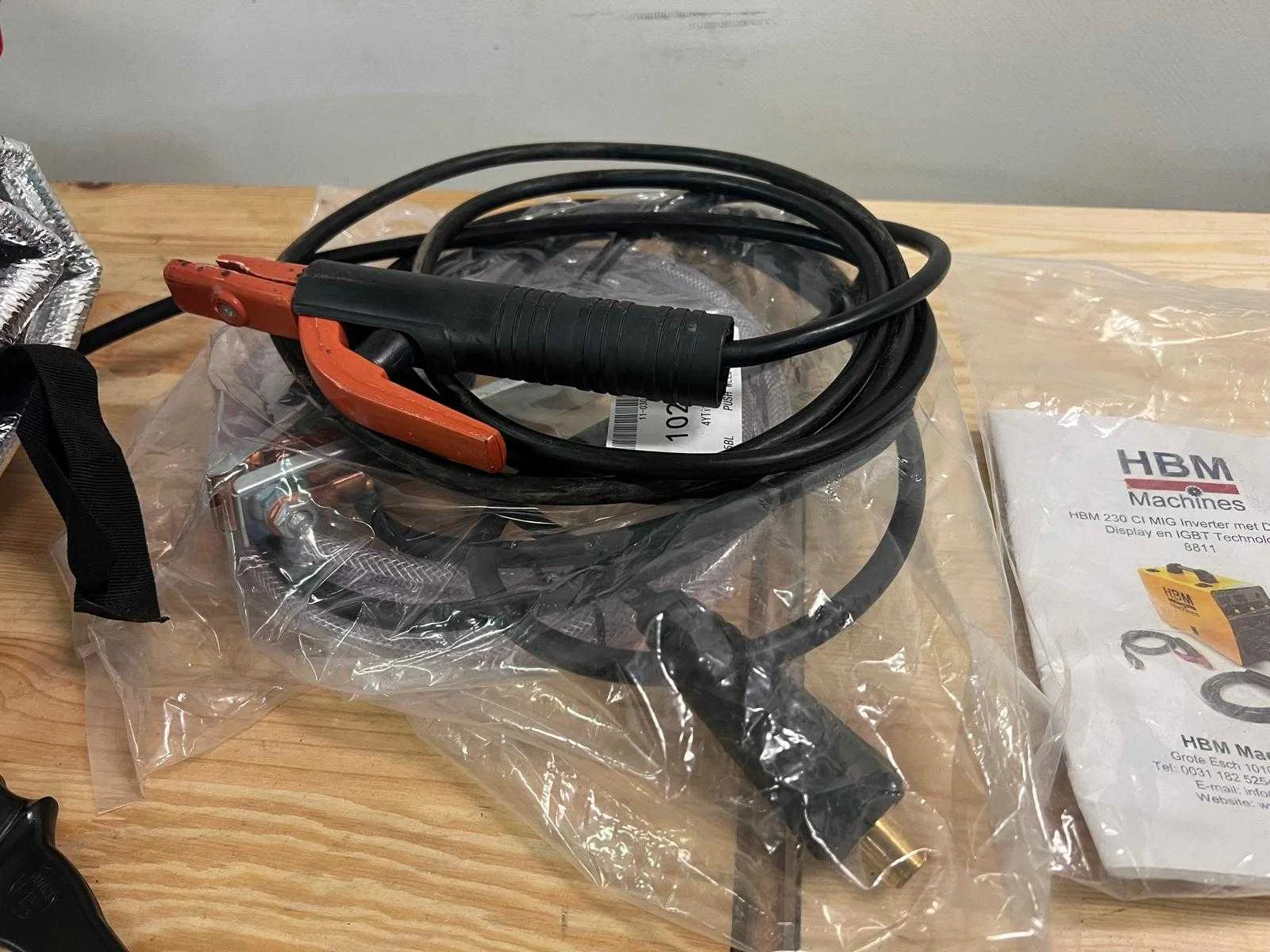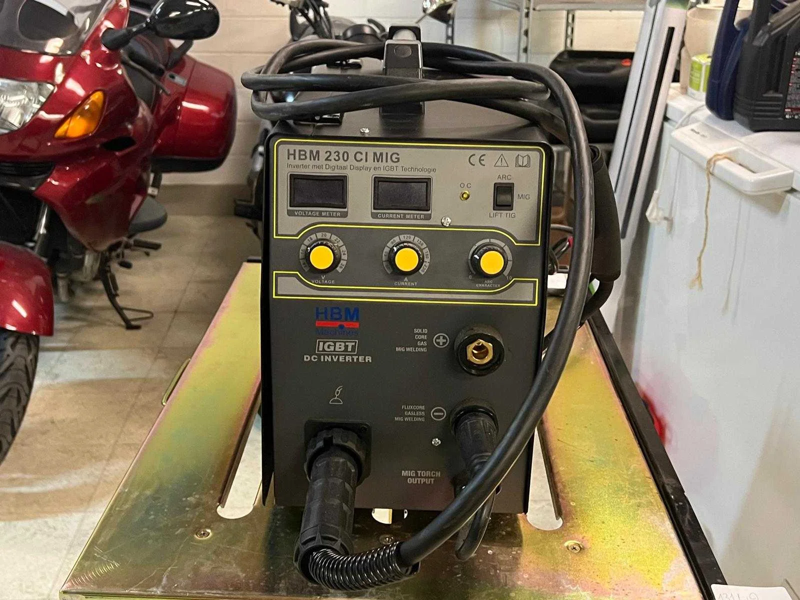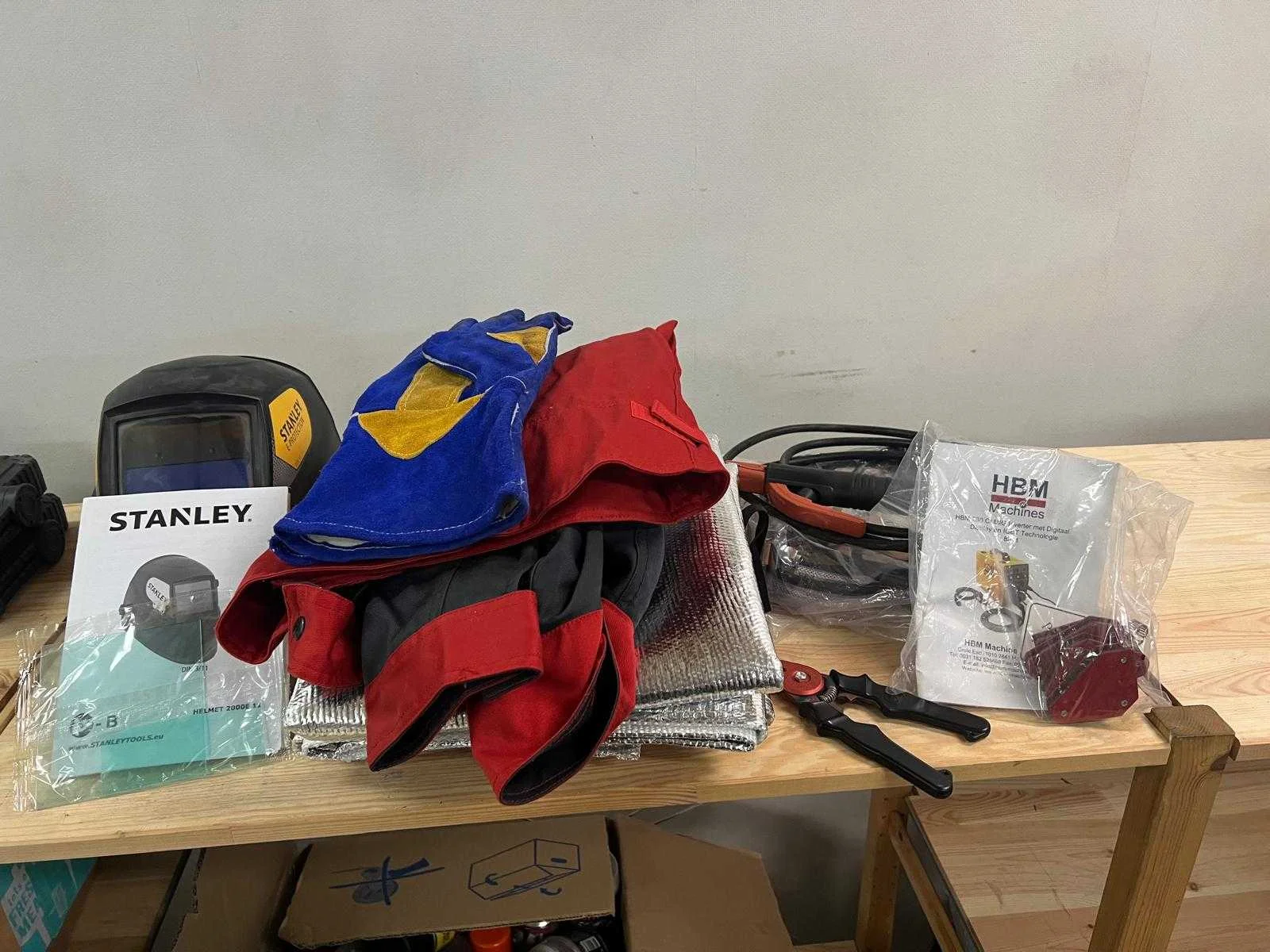 Volledige MIG lasuitrusting van HBM in zeer nette staat, inclusief veiligheidskleding, laskap, lasmagneten, handschoenen, tang en laswerktafel. Klaar voor gebruik. Deze set bevat: - HBM 230 CI MIG lasapparaat (IGBT DC Inverter, digitaal display) - MIG toorts en massakabel - Lasmagneten in originele verpakking - Laswerkhandschoenen (blauw, hittebestendig) - Stanley E-Protection 2000 E11 laskap met handleiding en extra vizierglas - Laswerktafel met verstelbaar frame op wielen - Laskleding (rode jas) - Warmtereflecterend lasdeken - Tang voor draadaanvoer (merk FIX) Nee Merk: HBM Machines Type: HBM 230 CI MIG Inschakelduur: 60% Max. lasvermogen: 230A Aansluiting: 230V Digitale uitlezing: true Draadaanvoerunit: true Machinegewicht: 12kg