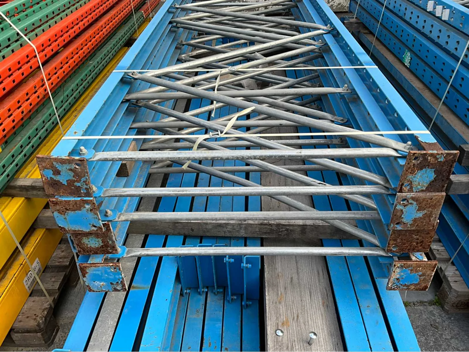 8 staanders van 310cm 22 leggers van 330cm 6 leggers van 270cm Volledig gedemonteerd en klaar gezet op pallets No Aantal secties: 6 Sectie afm. h: 2190mm Aantal staanders: 8 Aantal liggers: 28 Totale afmeting L: 2190cm Totale afmeting Hoogte: 310cm
