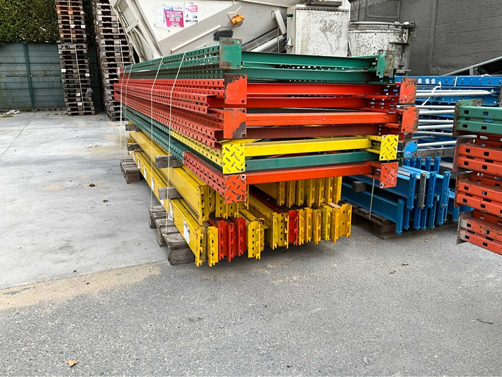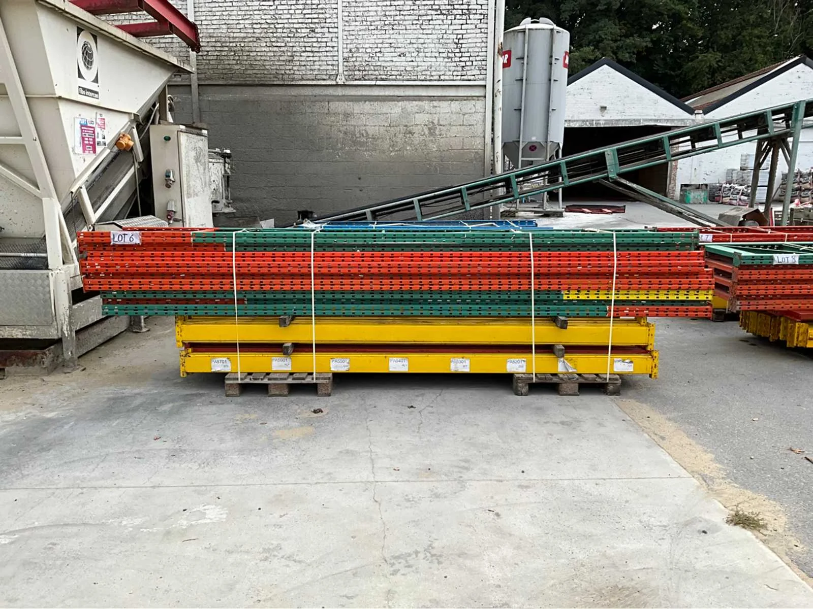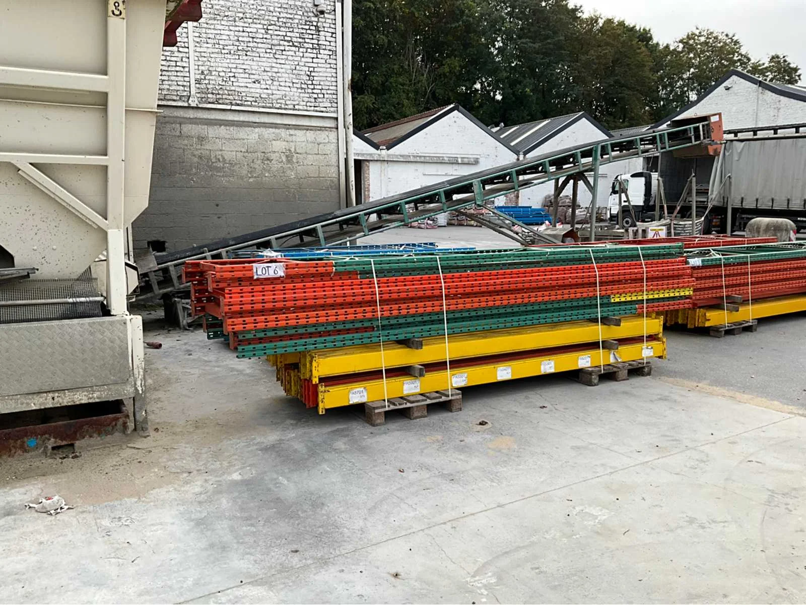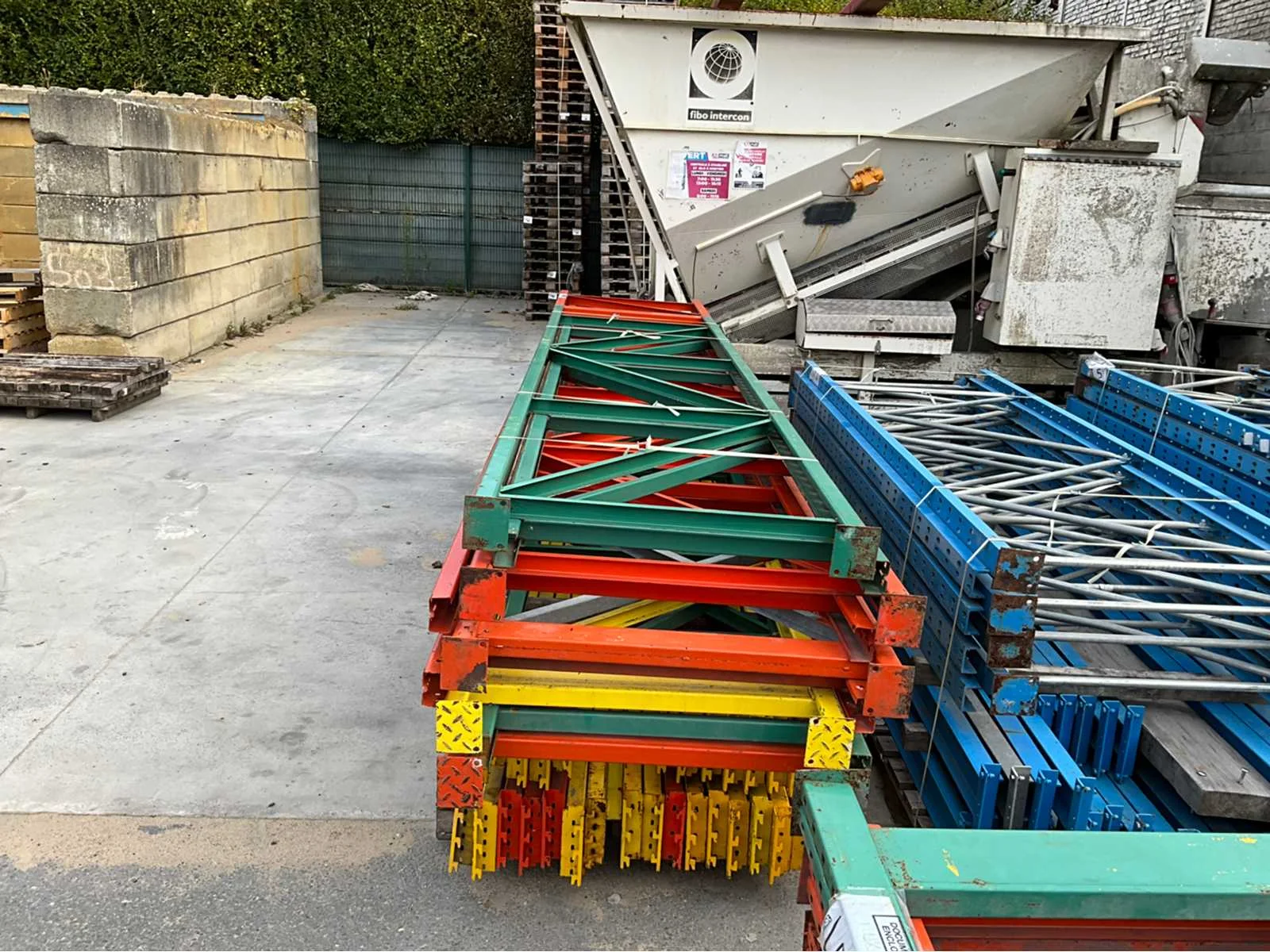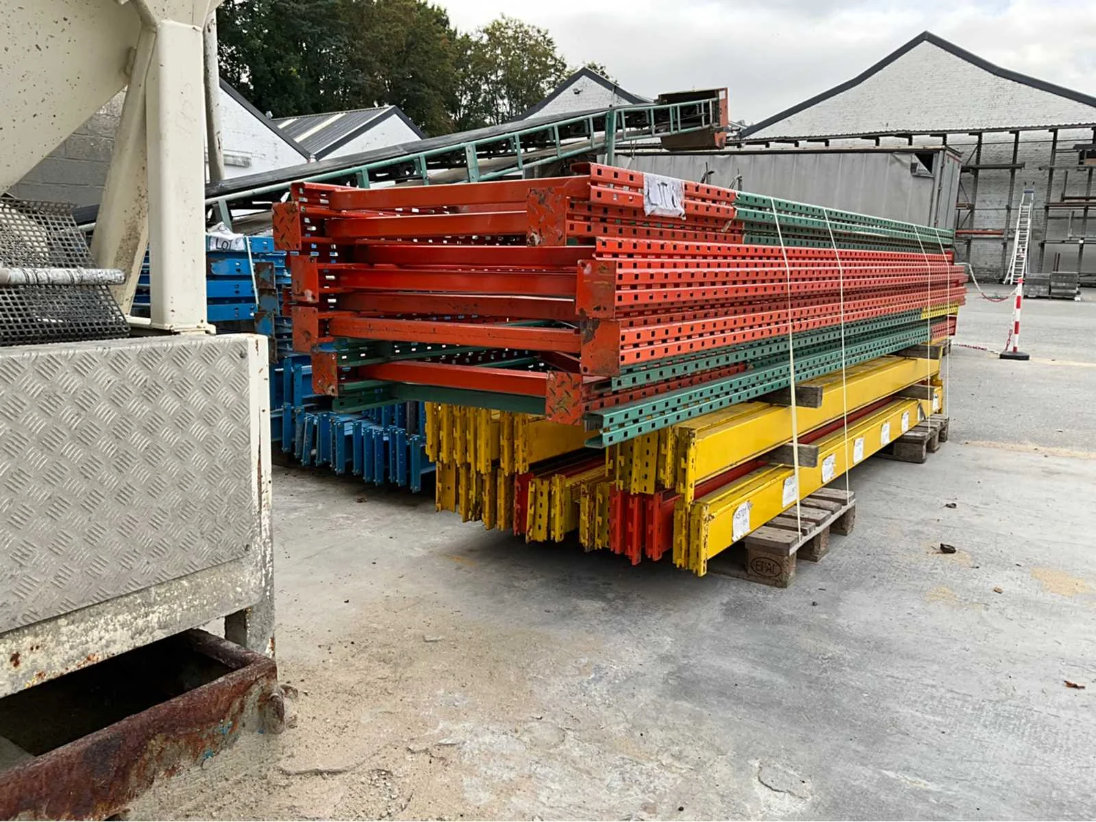 28 leggers van 355cm 5 staanders van 460cmx100cm 4staanders van 460cmx90cm volledig gedemonteerd en klaar gezet op pallets No Aantal staanders: 9 Aantal legborden: 28