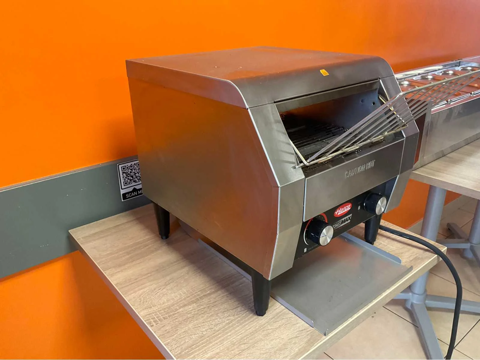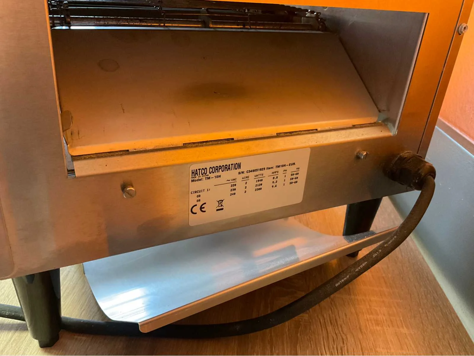 Hatco Toast-Max Professional Toaster, Model TM-10H, vervaardigd door Hatco Corporation Merk: Hatco Corporation Model: TM-10H (Toast-Max broodrooster met transportband) Type: Professionele broodrooster met transportband (voor hotels, restaurants, cafetaria's, enz.) Spanning: 220 – 240 V Vermogen: ca. 2,1 kW Materiaal: Roestvrij staal Bedieningselementen: Twee draaiknoppen aan de voorkant (tijd- en temperatuurregeling) Indicatielampje inschakelen Uitlaat aan de voorkant met uitlaatrooster Uitneembare lekbak aan de onderkant Non Merk: Hatco Type: TM-10H Model: TM10H-EUR Kleur: Inox Materiaal: Inox Aansluiting: 220