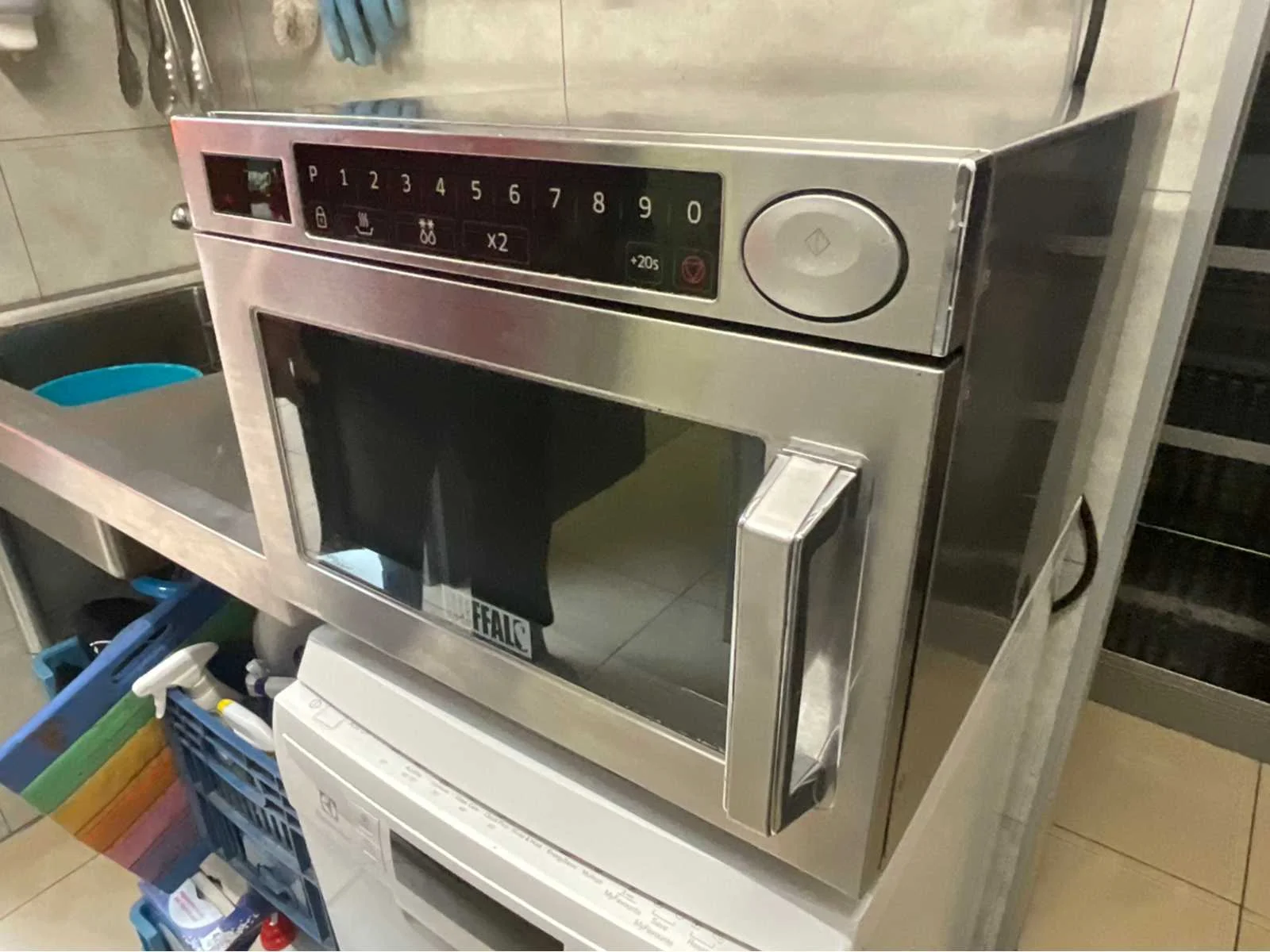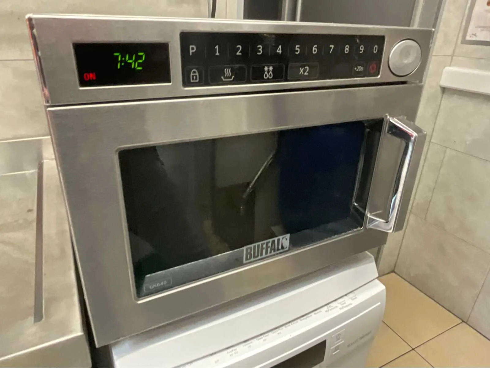 Volledig roestvrijstalen professionele magnetron, ontworpen voor intensief gebruik (restaurants, collectieve keukens, enz.). Gemakkelijk te reinigen roestvrijstalen holte zonder draaitafel. Programmeerbaar numeriek toetsenbord met 10 sneltoetsen + functies: Dubbele portie (x2) Snelle opwarming (+20 seconden) Ontgrendelen (hangslotpictogram) Interne inhoud: ca. 26 liter. Deur met stevige RVS handgreep. Automatische binnenverlichting in geopende toestand. Non Merk: Bullafo Model: GK640E Product type: Magnetron Maximaal vermogen: 1800W Vermogen: 900W Spanning: 230V Kleur: Edelstaal
