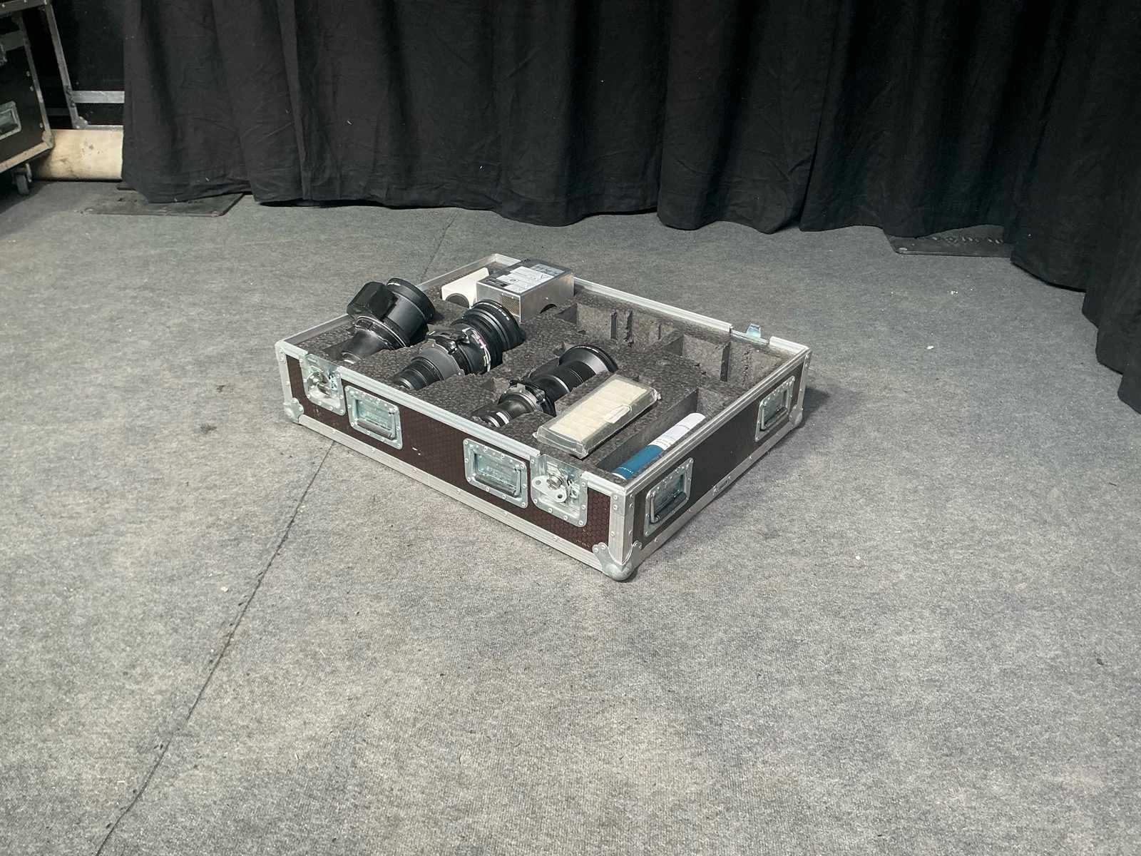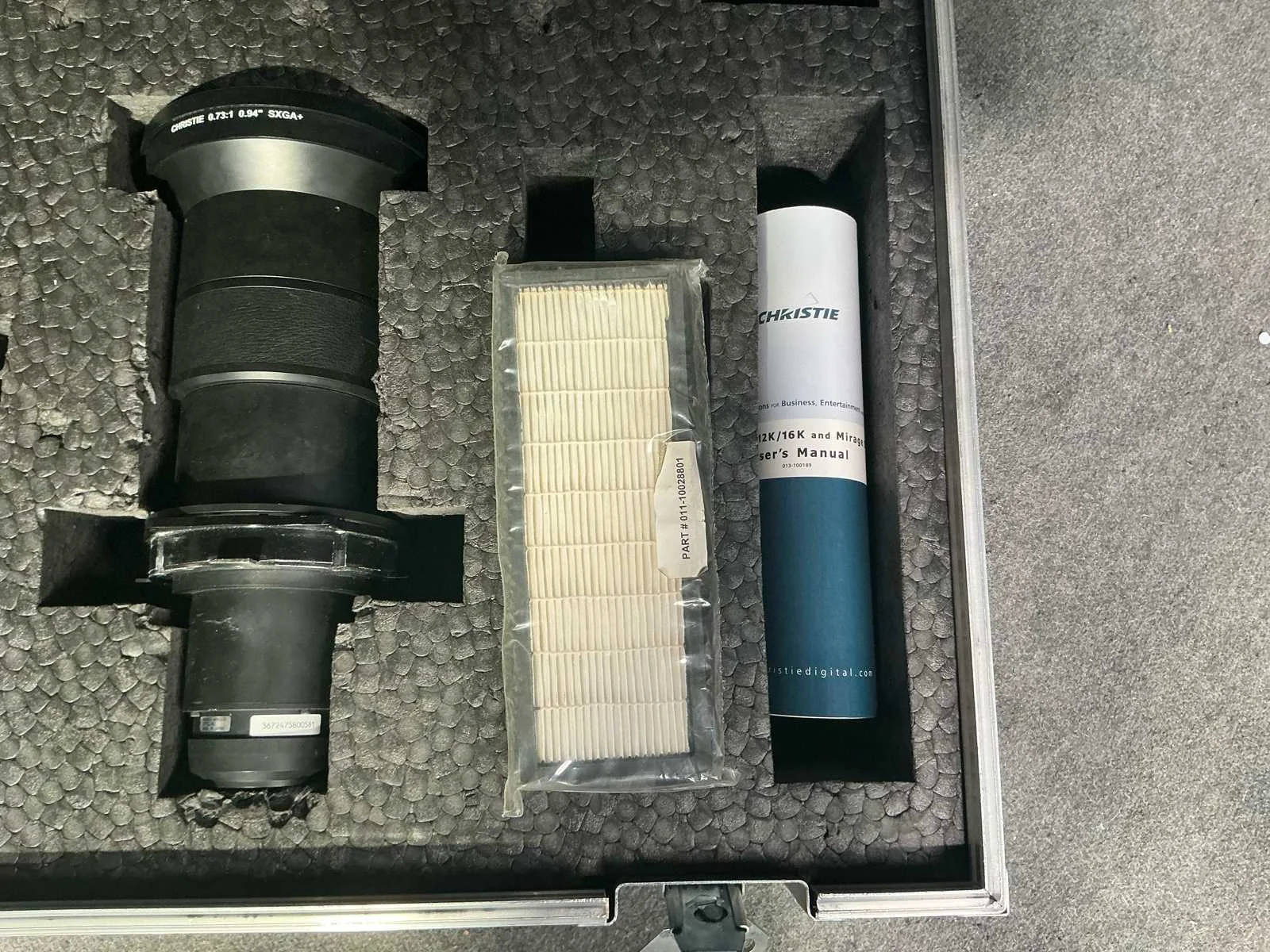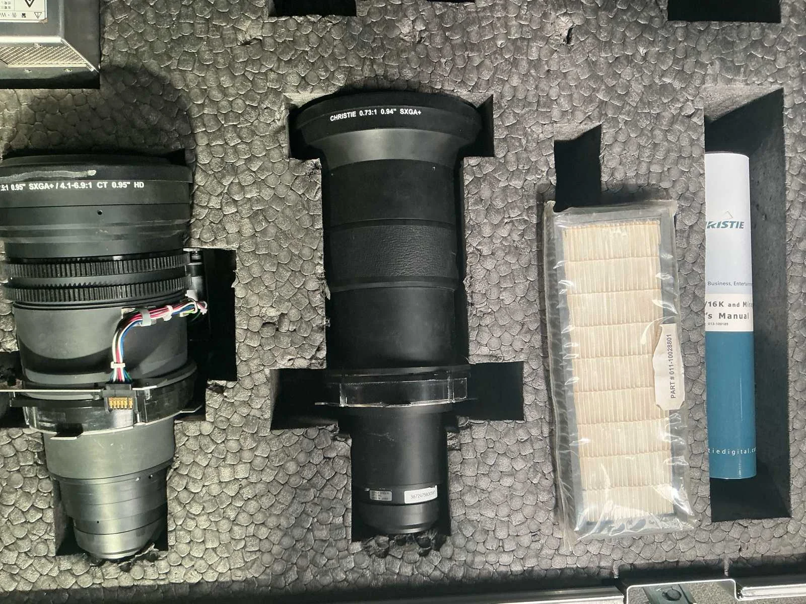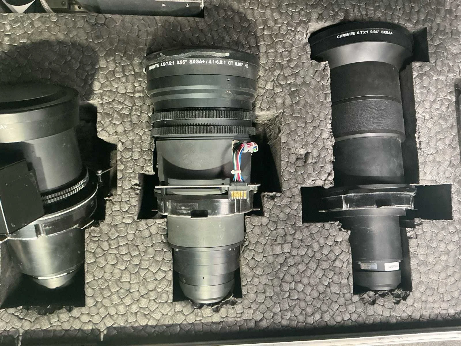 Partij van diverse lenzen van het merk Christie Met lamp. Verschillende maten beschikbaar. No Merk: Christie Type: Mirage S+ Met flightcase: true