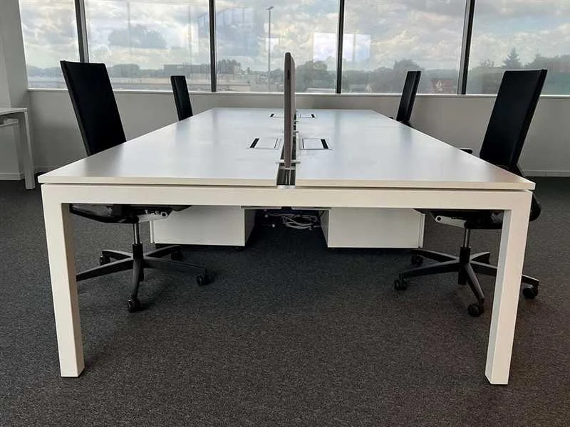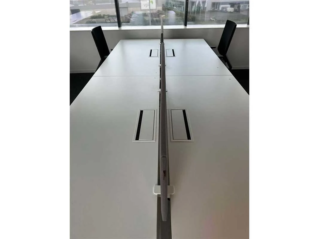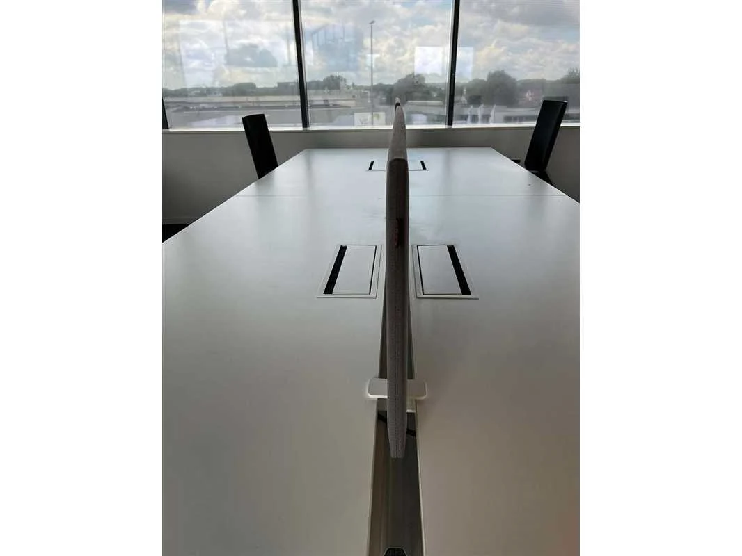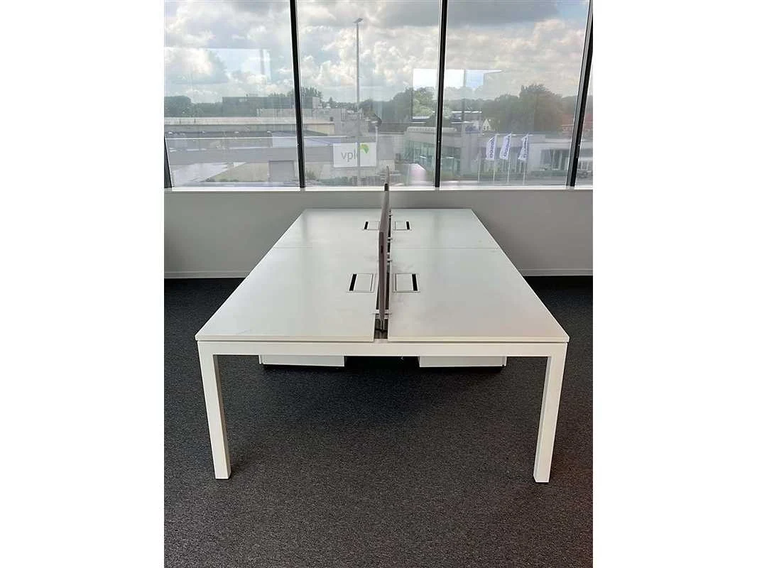 PAMI 4p Workbench B320xD160xH74 - wit melamine bovenblad / witte U-poot, normale gebruikssporen, zonder elektrificatie en stoelen/ladenblokken kleur paneel te kiezen volgens beschikbaarheid: rood, groen of paars kabelgoot niet beschikbaar Nee Merk: Pami Type: 4-persoons workbench Kleur: wit Gewicht: 80kg Breedte: 320cm Hoogte: 74cm Materiaal: melamine Diepte: 160cm