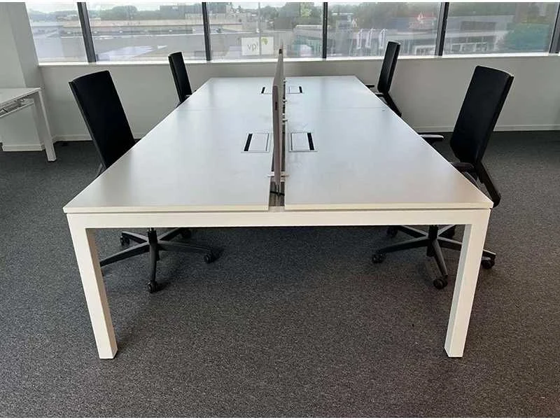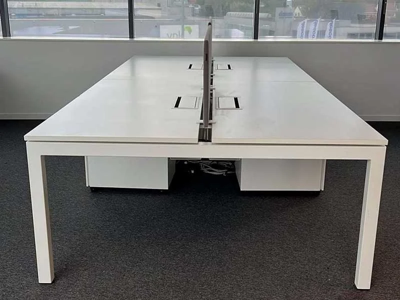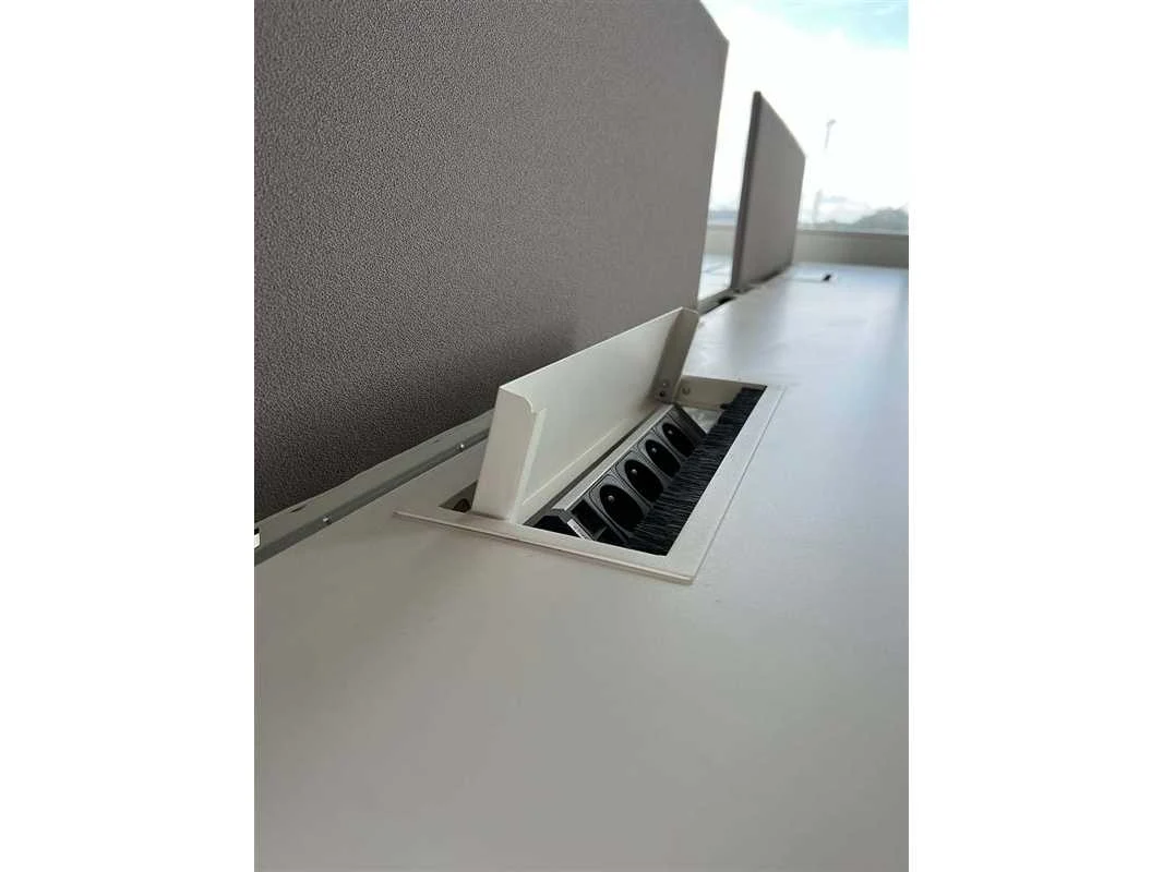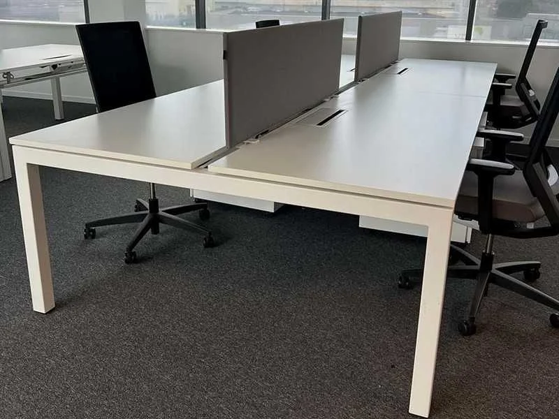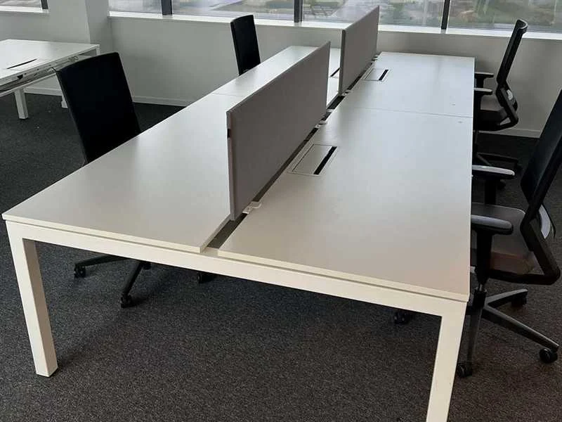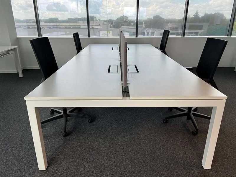 PAMI 4p Workbench B320xD160xH74 - wit melamine bovenblad / witte U-poot, normale gebruikssporen, zonder elektrificatie en stoelen/ladenblokken kleur paneel te kiezen volgens beschikbaarheid: rood, groen of paars kabelgoot niet beschikbaar Nee Merk: Pami Type: 4-persoons workbench Kleur: wit Gewicht: 80kg Breedte: 320cm Hoogte: 74cm Materiaal: melamine Diepte: 160cm