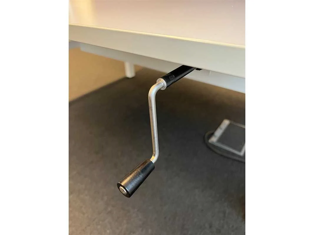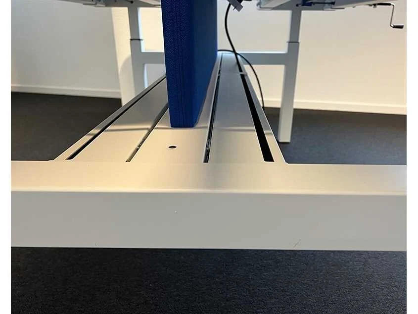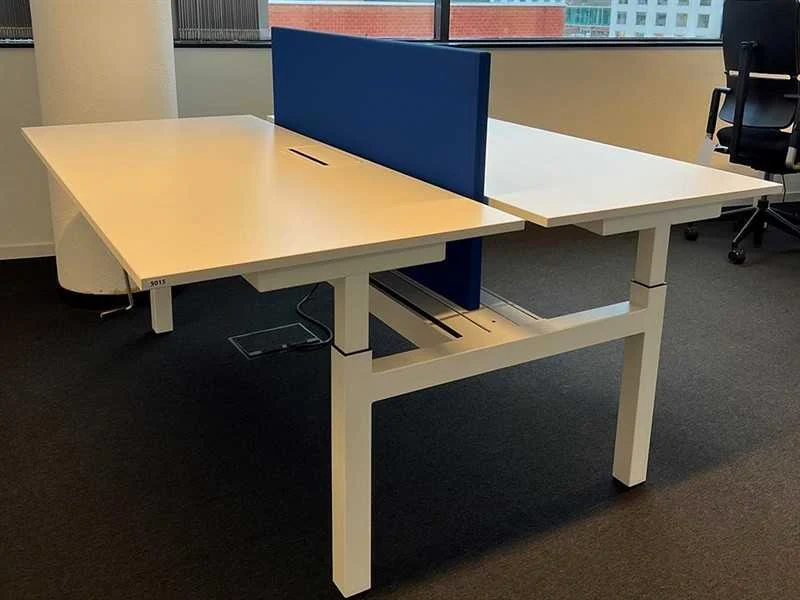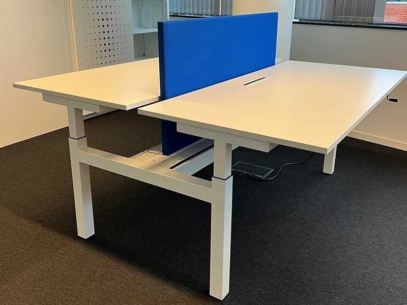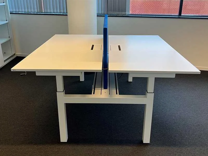 PAMI 2p Workbench, afm. B160xD160xH62-85, manueel op hoogte instelbaar, wit melamine bovenblad / witte metalen U-poot, zonder electrificatie, gebruiksporen aanwezig Nee Merk: Pami Type: 2-persoons workbench Slingerbureau: true Breedte: 160cm Hoogte: 62-85cm Materiaal: melamine Diepte: 170cm