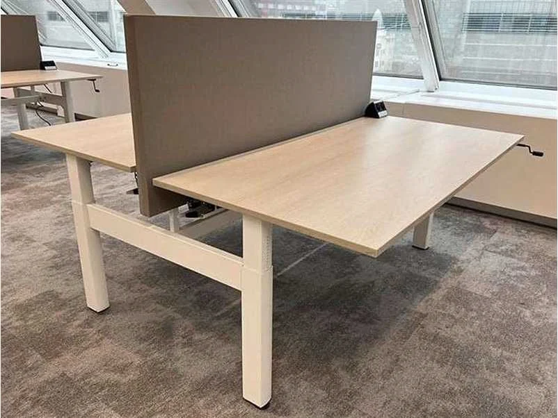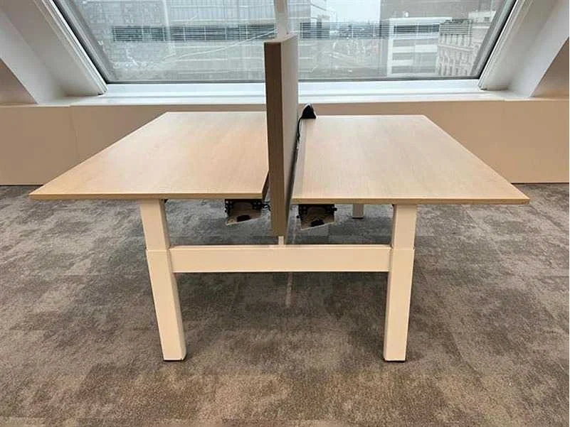 AHREND Four Two duo workbench, afm. B160xD170xH62-90, licht eiken melamine bovenblad, wit metalen H-poot, manueel in hoogte verstelbaar, lichte gebruikssporen, reeds gedemonteerd Nee Merk: Ahrend Type: Four Two Kleur: licht eik/wit Gewicht: 80kg Breedte: 160cm Hoogte: 62-82cm Materiaal: melamine Diepte: 160cm