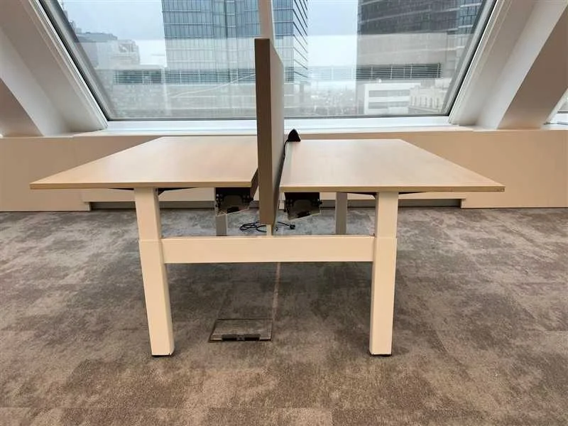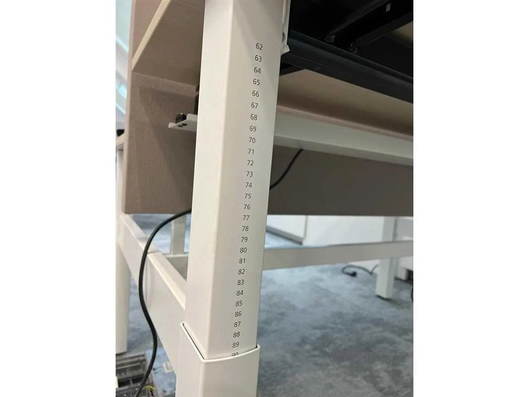 AHREND Four Two duo workbench, afm. B160xD170xH62-90, licht eiken melamine bovenblad, wit metalen H-poot, manueel in hoogte verstelbaar, lichte gebruikssporen, reeds gedemonteerd Nee Merk: Ahrend Type: Four Two Kleur: licht eik/wit Gewicht: 80kg Breedte: 160cm Hoogte: 62-82cm Materiaal: melamine Diepte: 160cm