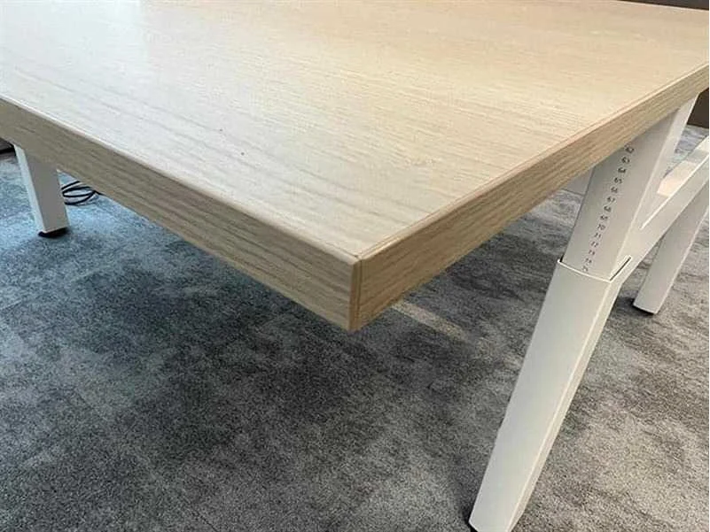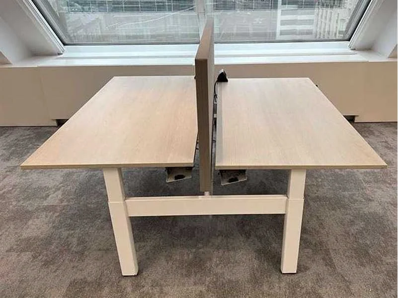 AHREND Four Two duo workbench, afm. B160xD170xH62-90, licht eiken melamine bovenblad, wit metalen H-poot, manueel in hoogte verstelbaar, lichte gebruikssporen, reeds gedemonteerd Nee Merk: Ahrend Type: Four Two Kleur: licht eik/wit Gewicht: 80kg Breedte: 160cm Hoogte: 62-82cm Materiaal: melamine Diepte: 160cm