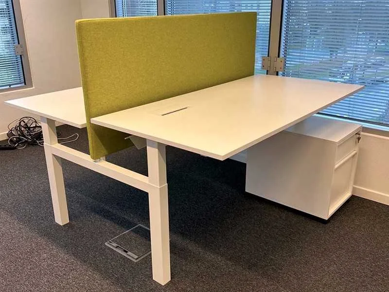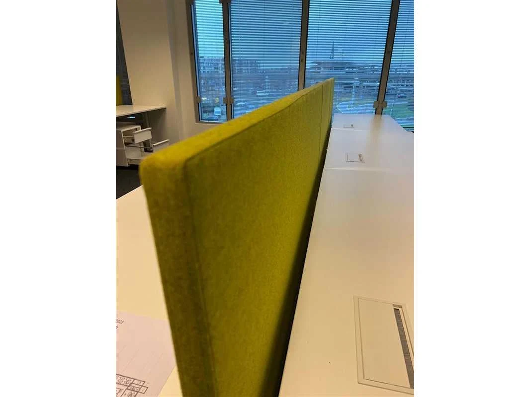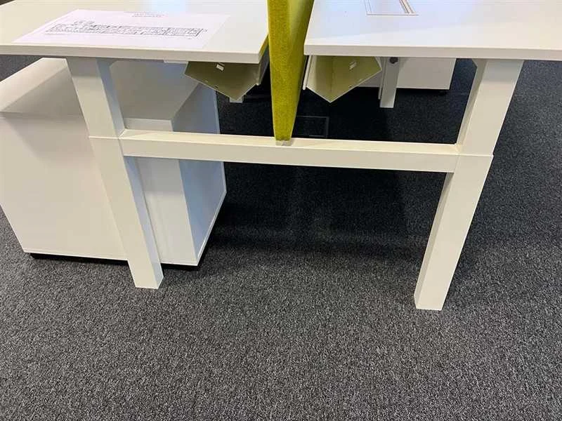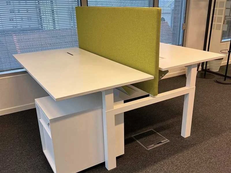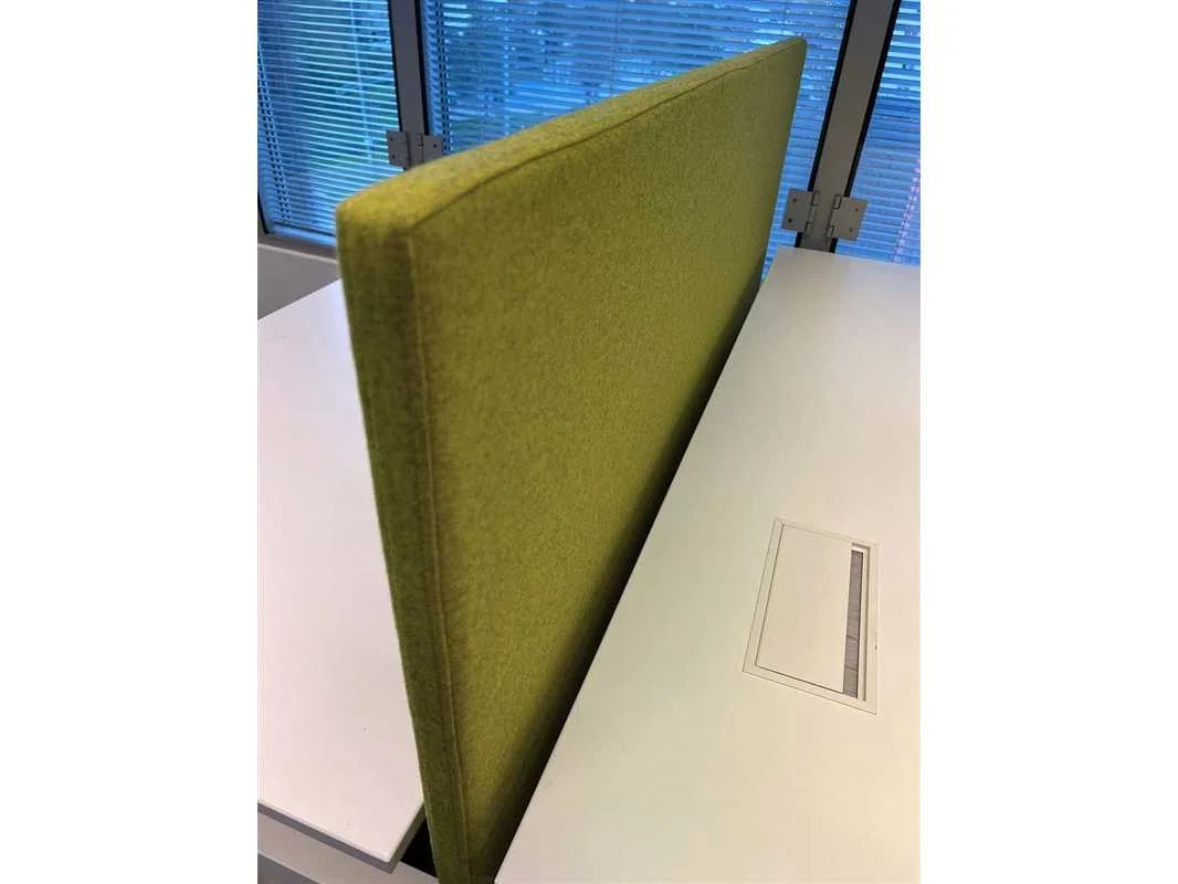 2X OSMOZ Feelgood dubbele workbench met groene tussenwand, afm. B160xD160xH65-80, wit melamine bovenblad, wit metalen H-poot, hoogte bij plaatsing instelbaar, zeer lichte gebruikssporen, zonder ladenblokken No Merk: OZMOZ Type: 2p Workbench Model: Feelgood Kleur: Wit / Groen Gewicht: 150kg Breedte: 160cm Hoogte: 65-80cm Materiaal: Melamine