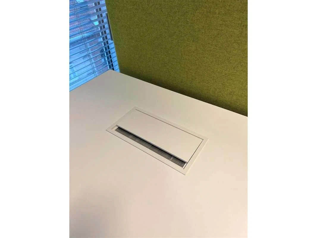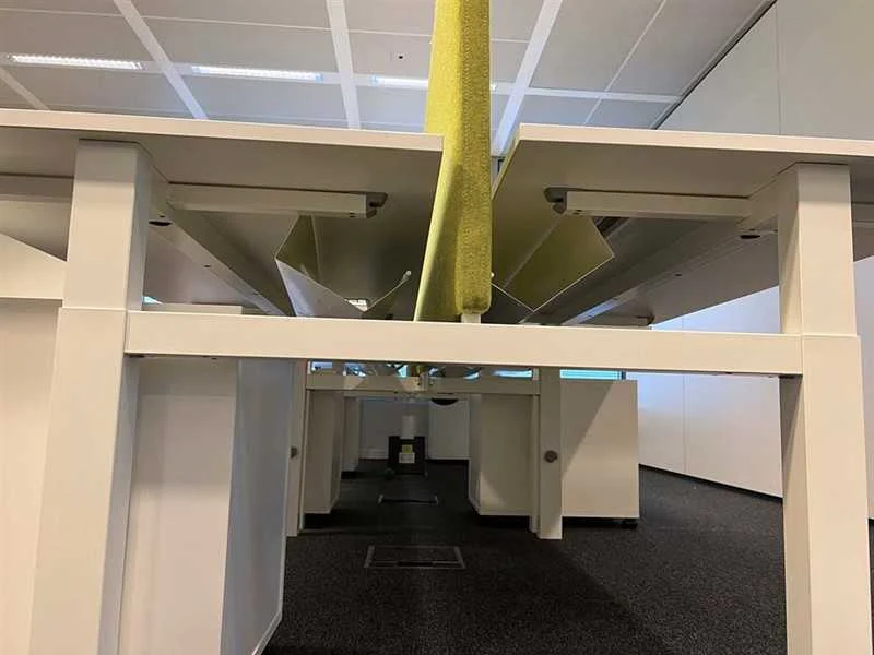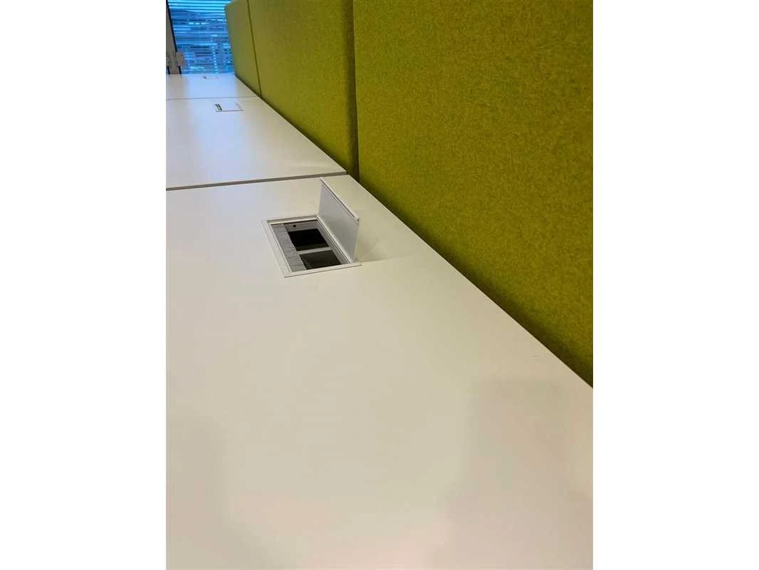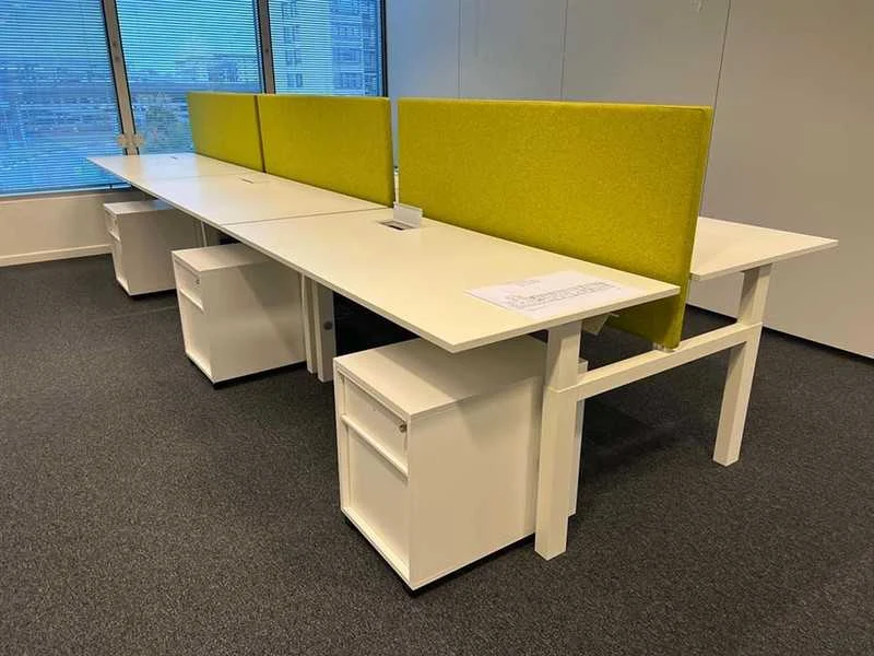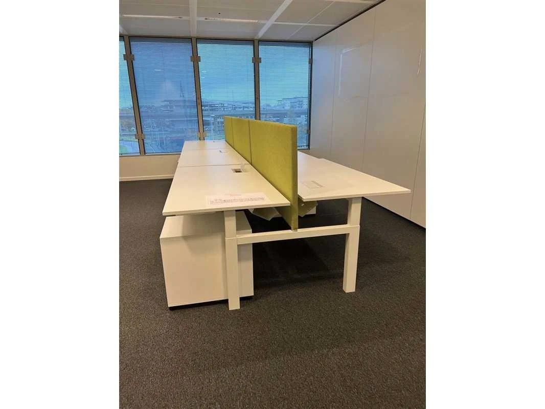 2X OSMOZ Feelgood dubbele workbench met groene tussenwand, afm. B160xD160xH65-80, wit melamine bovenblad, wit metalen H-poot, hoogte bij plaatsing instelbaar, zeer lichte gebruikssporen, zonder ladenblokken No Merk: OZMOZ Type: 2p Workbench Model: Feelgood Kleur: Wit / Groen Gewicht: 150kg Breedte: 160cm Hoogte: 65-80cm Materiaal: Melamine