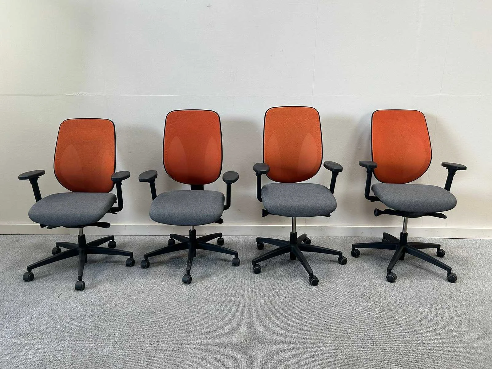 4x bureaustoel, GIROFLEX, type 353, sommige pompen werken niet zo goed, gebruikssporen mogelijk (V0301/V0303) Nee Merk: GIROFLEX Type: 353 Kleur: Oranje / Grijs Gewicht: 75kg Materiaal: Stof / Mesh