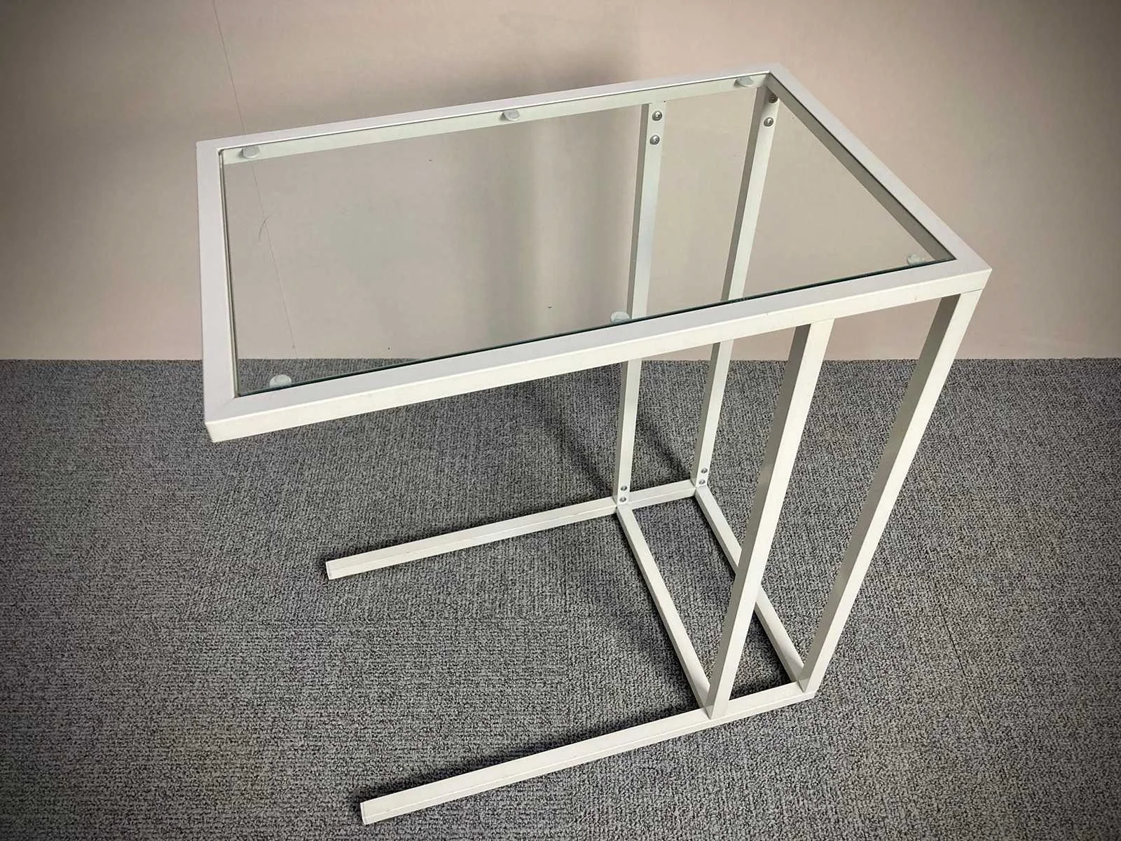 Kleine witte bijzettafeltj met glazen top, met gebruiksporen Nee Model: bijzettafel Kleur: Wit Materiaal: Metaal / Glas
