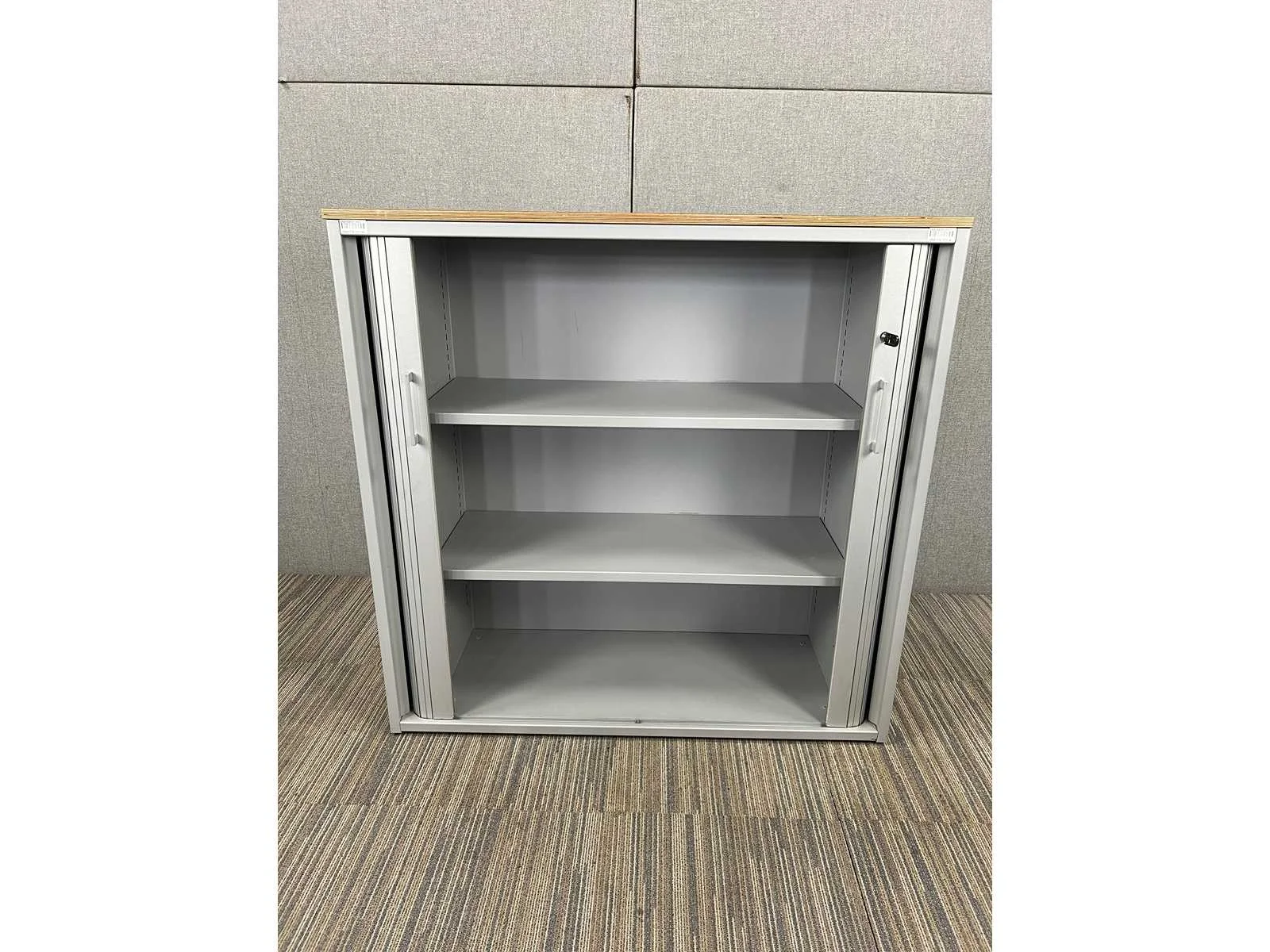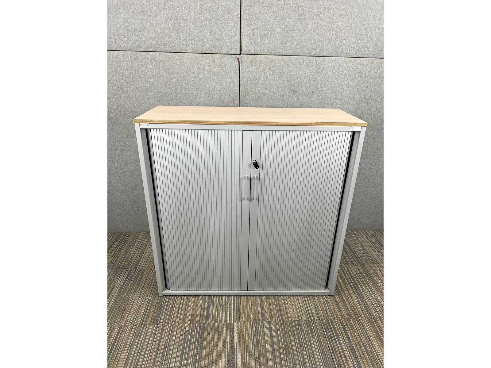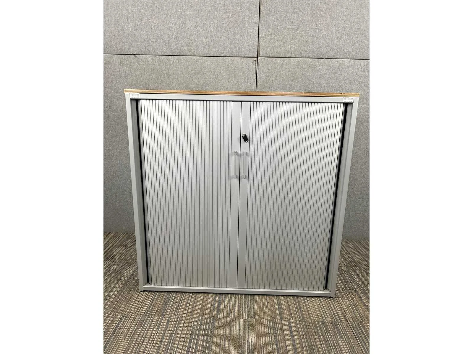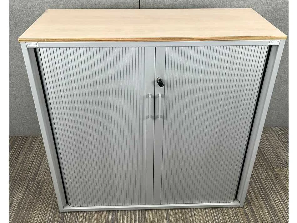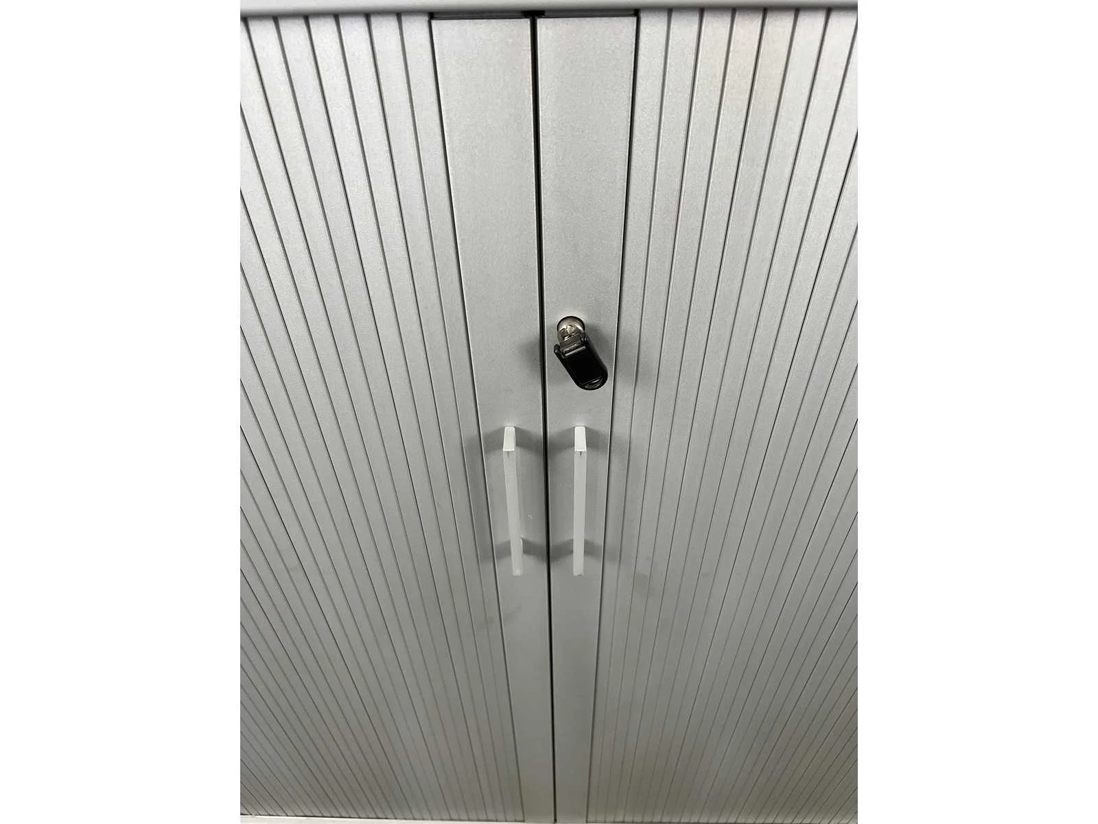 DROMEAS halfhoge vertikale roldeurkast, eikfineer topblad. Grijs metaal, gebruikssporen mogelijk, sleutel niet gegarandeerd No Merk: DROMEAS Type: H130 Gewicht: 200kg Breedte: 120cm Hoogte: 130cm Materiaal: Metaal Diepte: 44cm