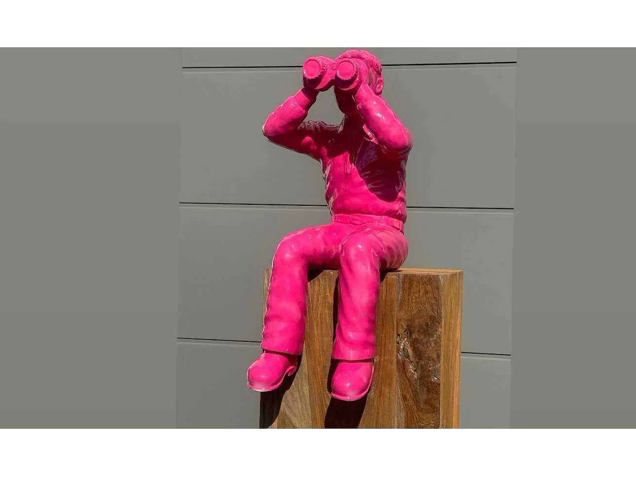 Man met Verrekijker zit Roze H70cm Polystone / Polyester No Hoogte: 70 Leveringsvoorwaarden: Niet gefundeerd - onverpakt