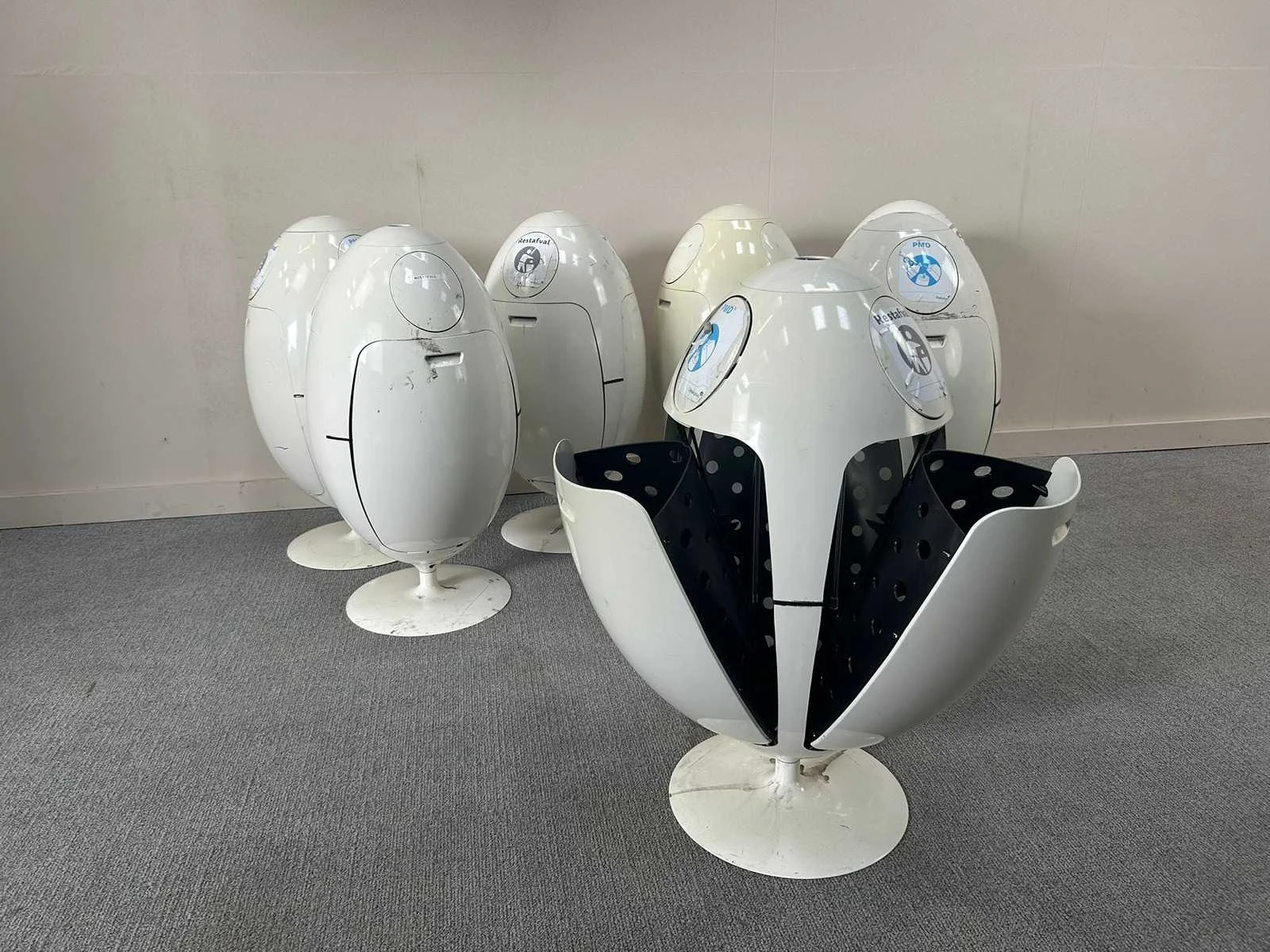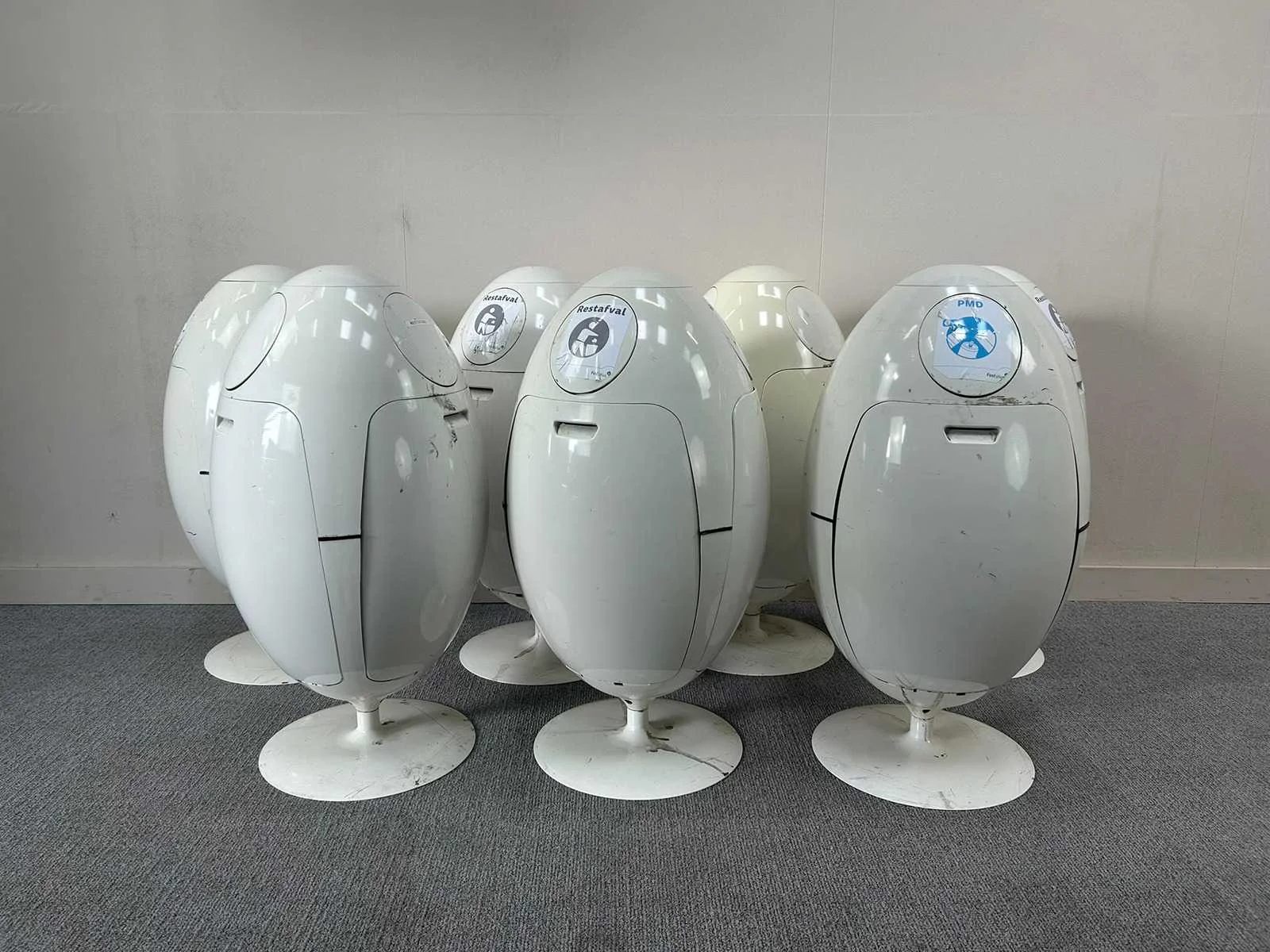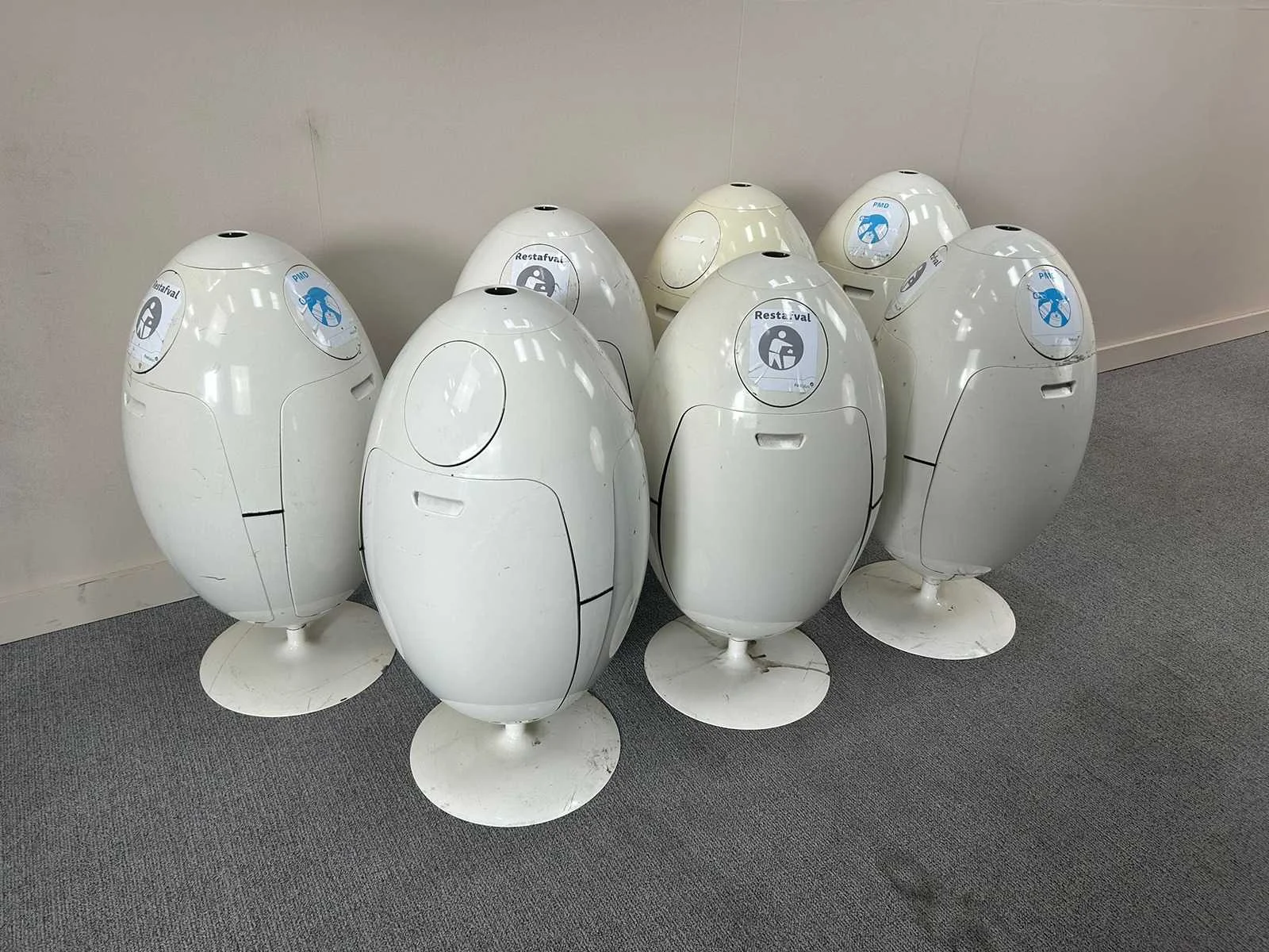 Een set van 7 "ei"-vormige afvalbakken. Met gebruikssporen, staat kan variëren per item. Nee Product type: "ei"-vormige afvalbakken Kleur: Wit Gewicht: 50kg Materiaal: kunststof