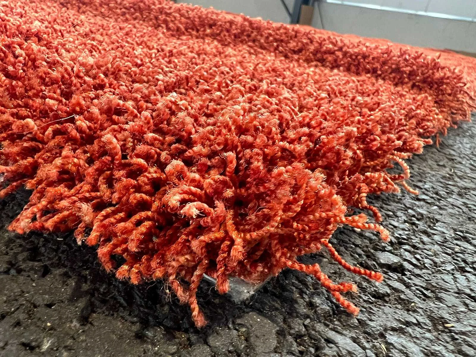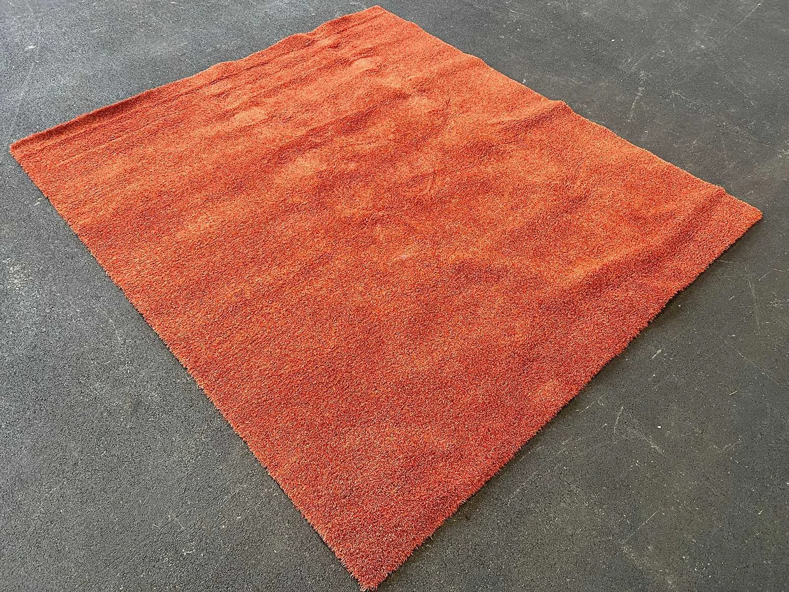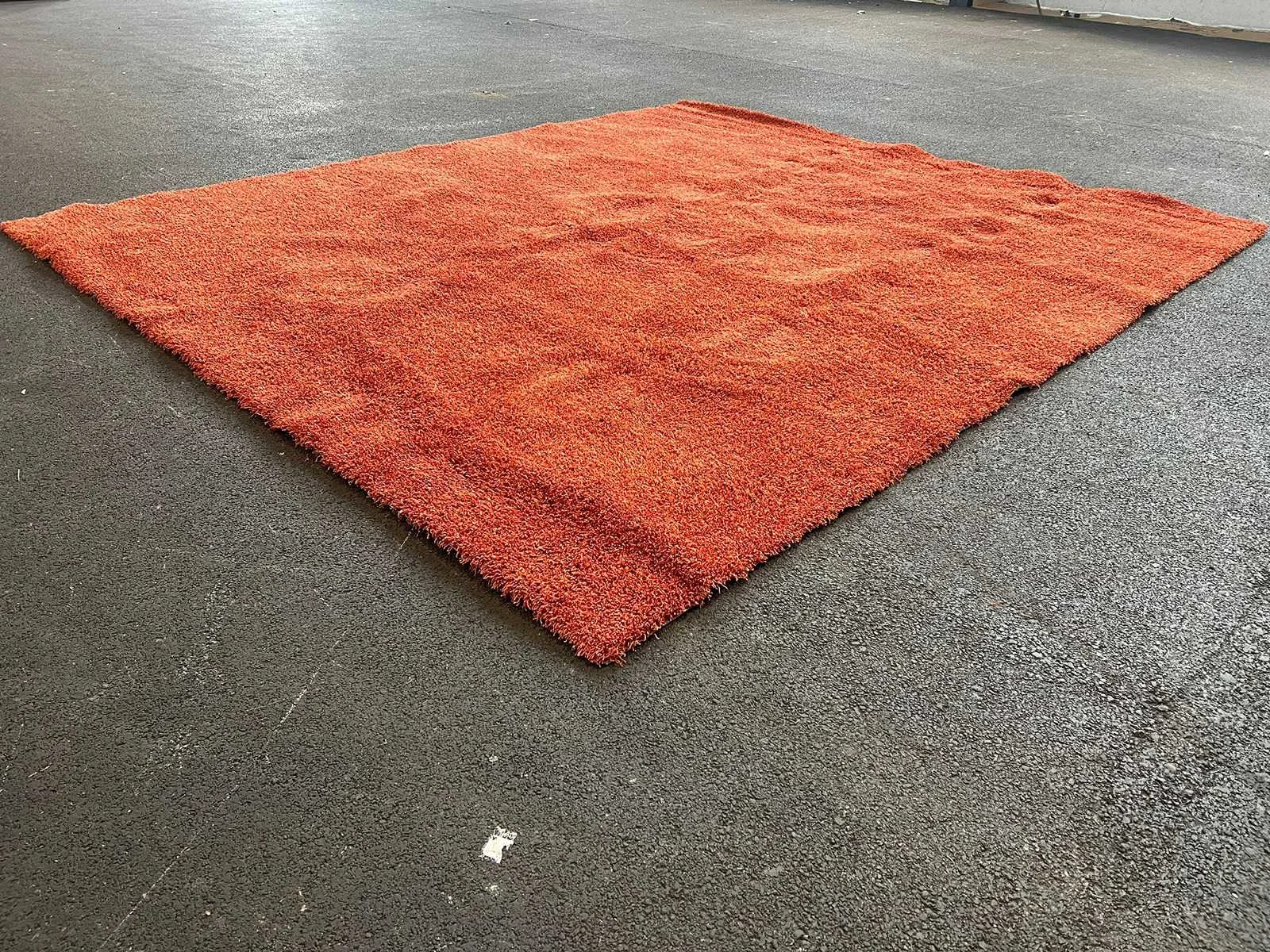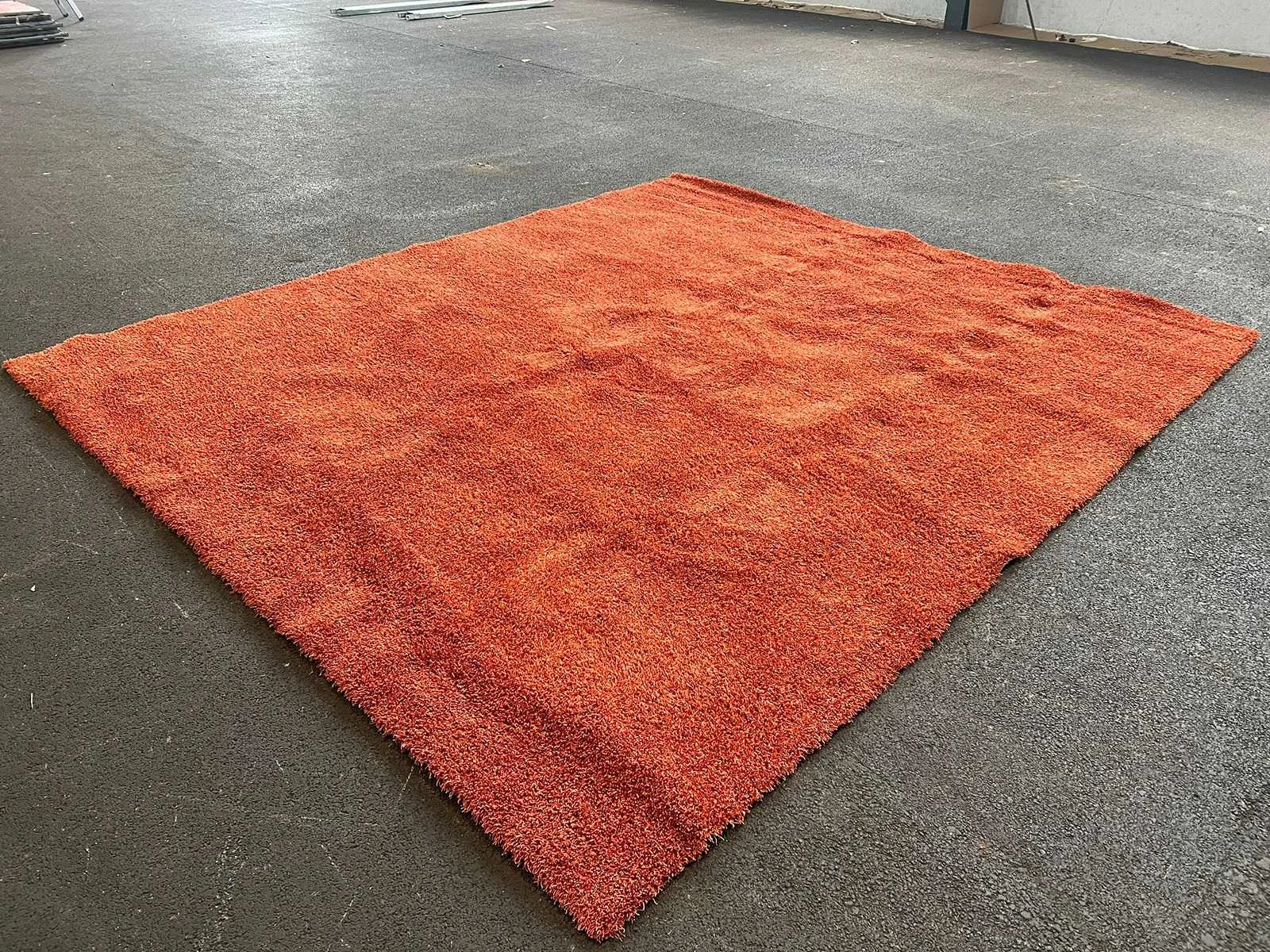 Oranje vilt vloertapijt, met gebruikssporen. Nee Merk: EGE Product type: Vloertapijt Kleur: Oranje Gewicht: 15kg Lengte: 300cm Breedte: 340cm Materiaal: Vilt