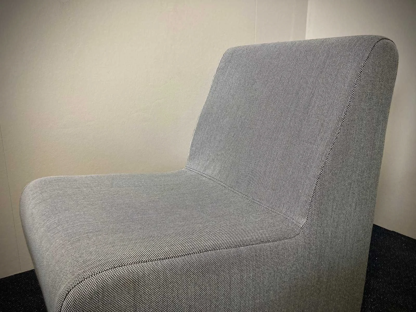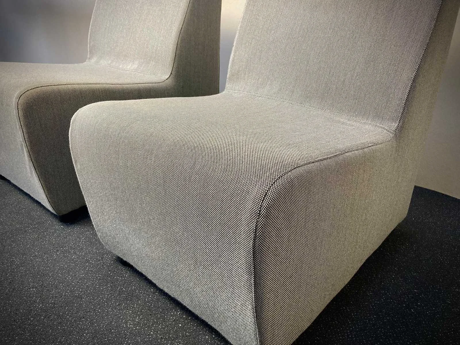 Grijze lage zitbanken , kleur grijs, textiel, gebruikssporen mogelijk Nee Kleur: grijs Materiaal: textiel