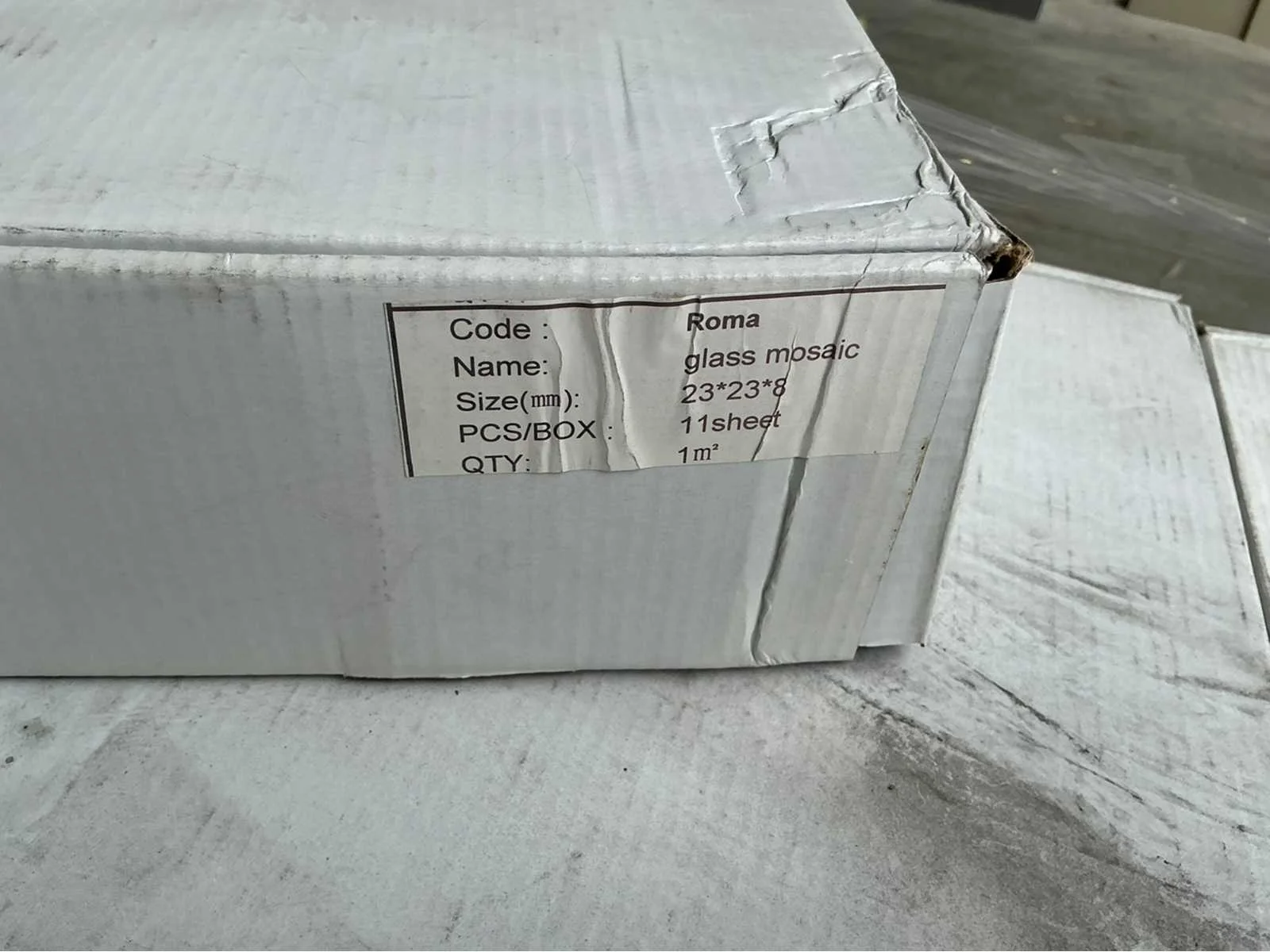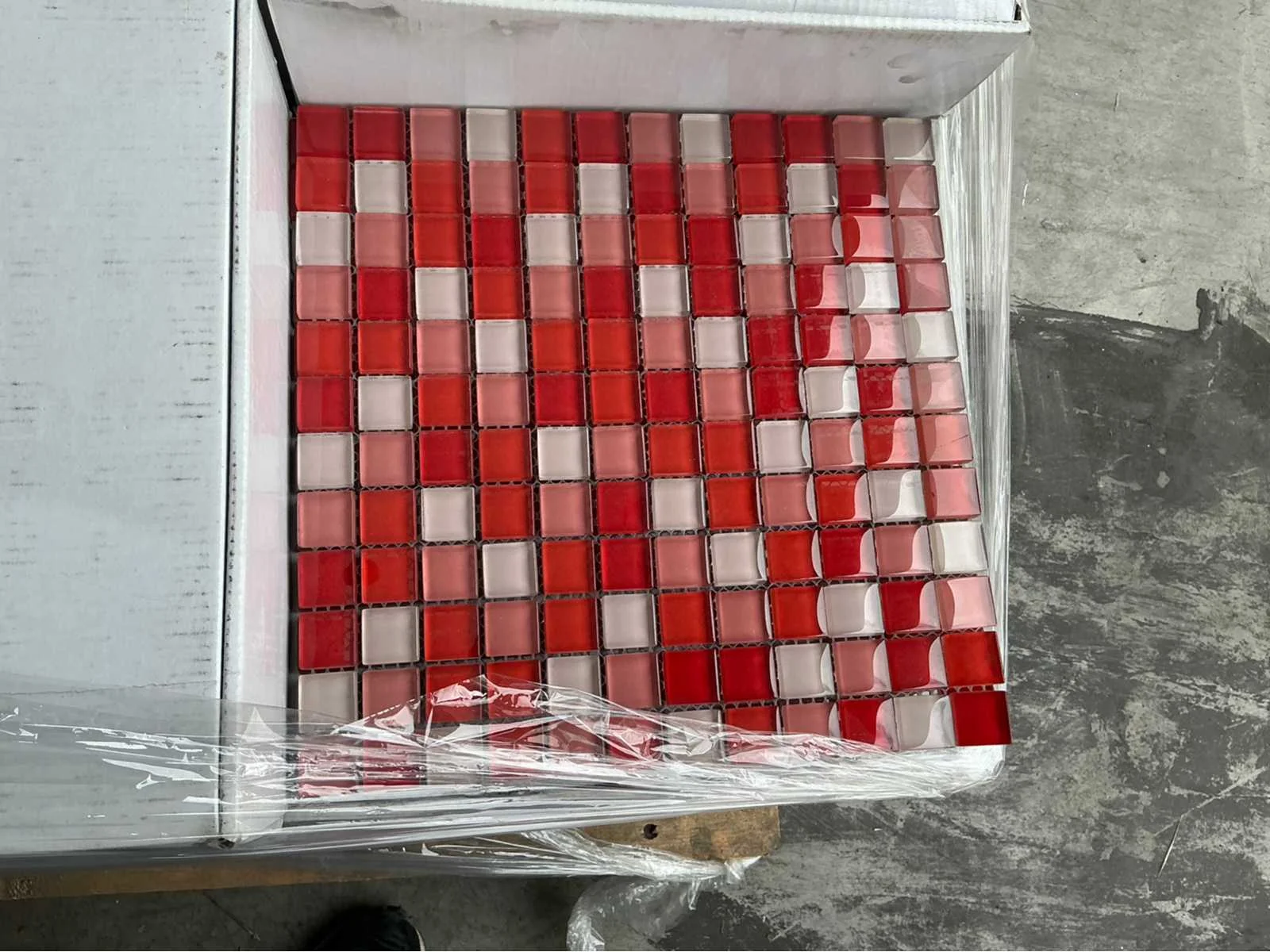 Nee Kleur: Rood Lengte: 23cm Breedte: 23cm Materiaal: Glass Mosaïc Dikte: 8mm Aantal m² per verpakking: 1m² Aantal pakken: 32 Totaal oppervlakte: 32m²