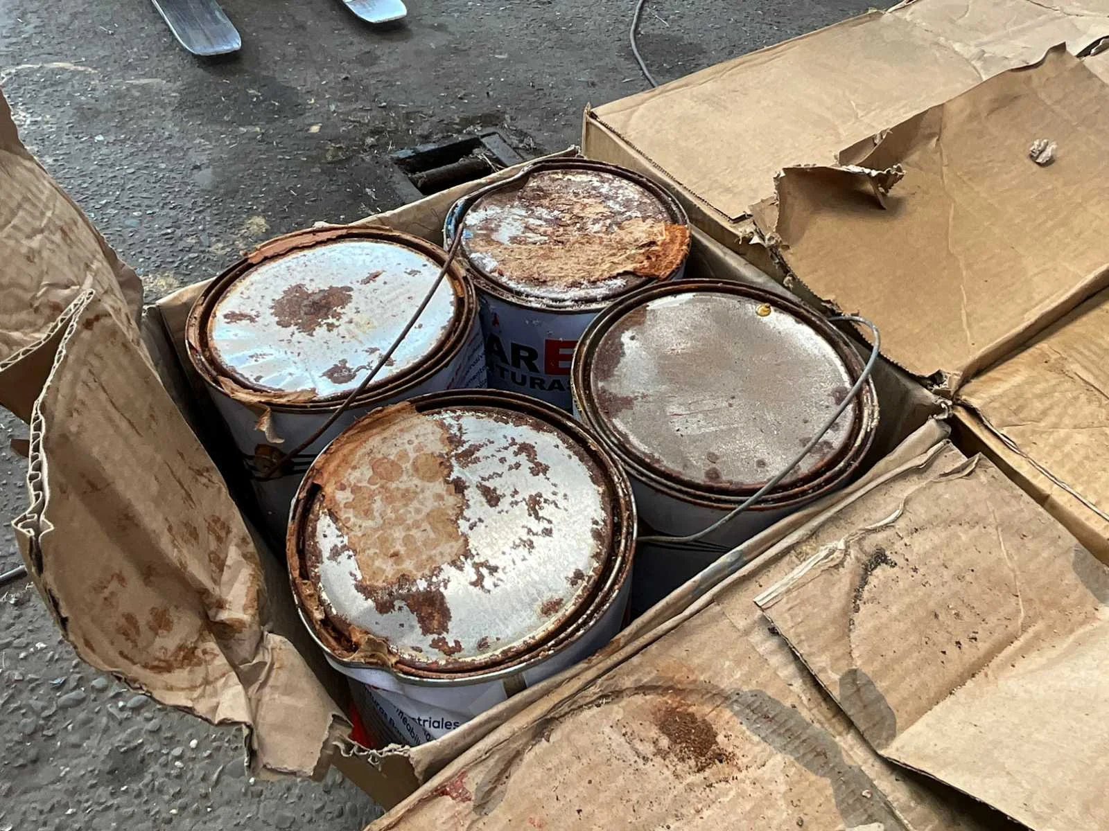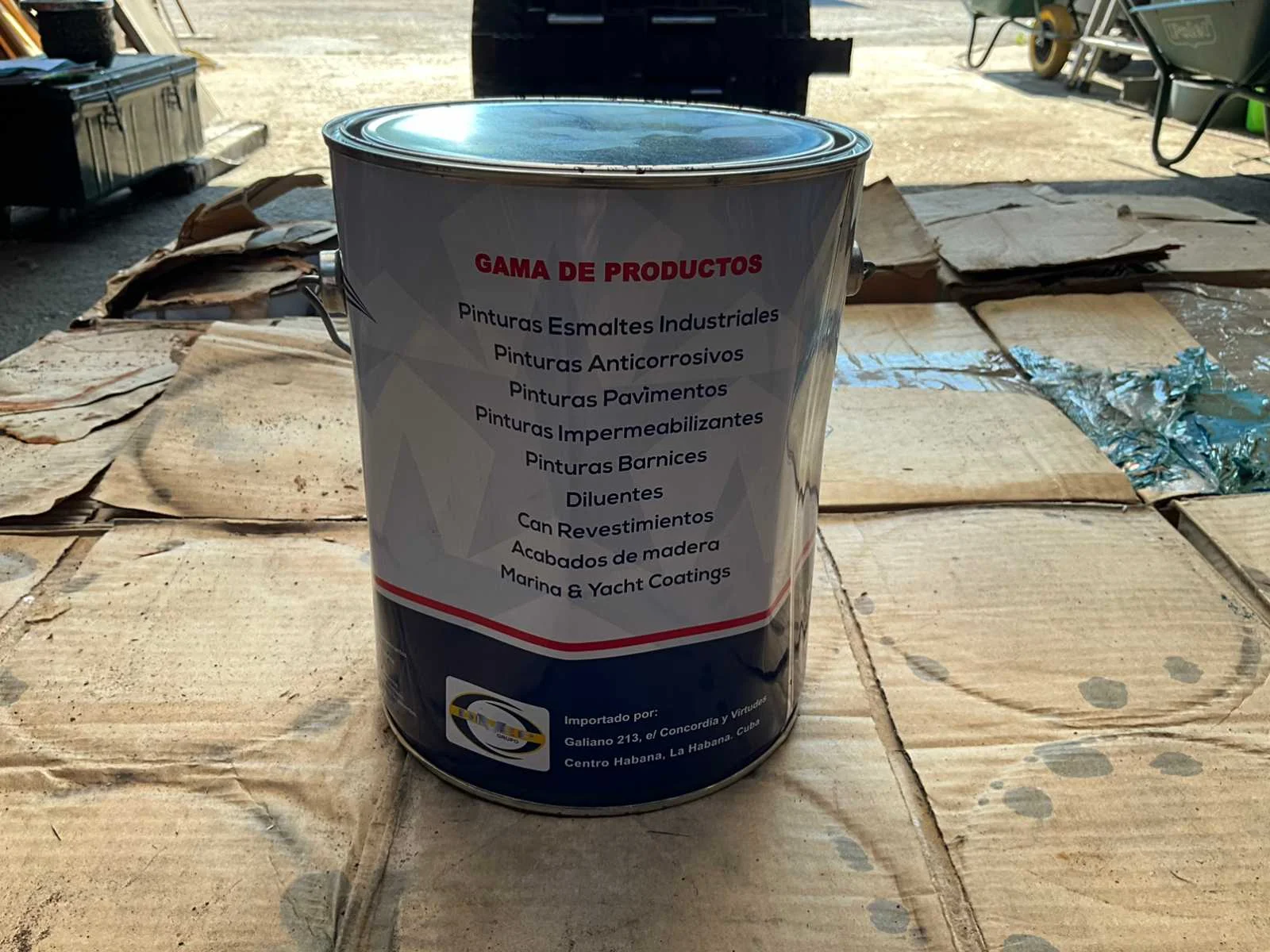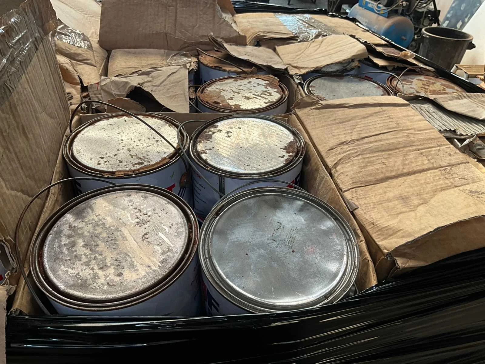 180 blikken op 1 pallet. Per blik zit er 4L in. Diverse ral kleuren. Bij interesse naar bepaalde kleuren kan dit geregeld worden bij een verkoop. Nu staan alle kleuren namelijk nog door elkaar. De verfblikken staan er al enige tijd hierdoor kan de buitenkant wat geroest of gedeukt zijn. Zie foto van de kleuren. Nee Merk: FarEast Pinturas Kleur: Divers