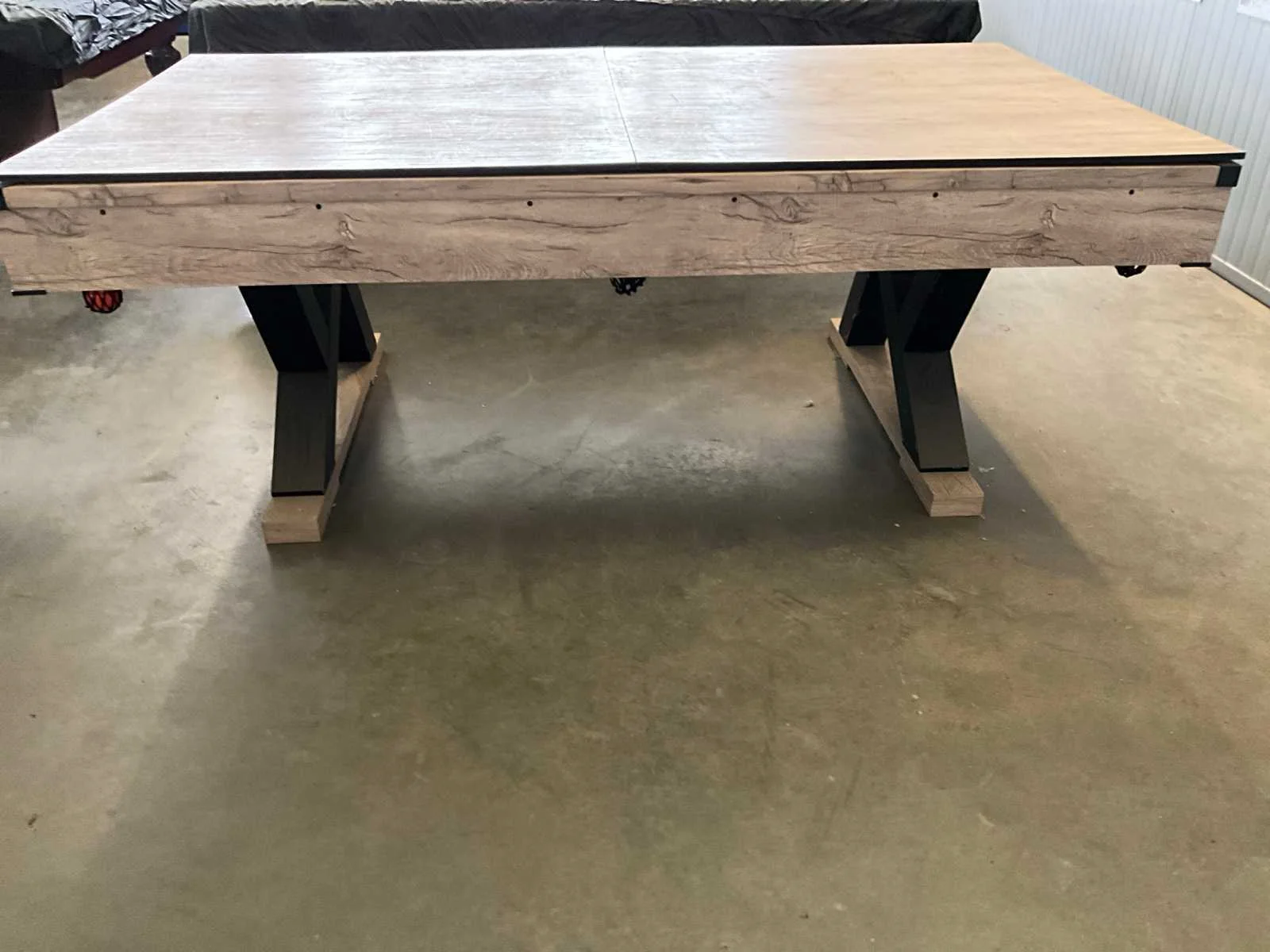 Nieuw in de verpakking (verpakking heeft afmeting 222x128x23, 135kg) enkel poten te monteren - speeloppervlak 192x95cm - afwerking in AX Resin lichte nerfstructuur - hoeken bovenaan afgewerkt met kunststof - competitiebanden K66 - laken: ultradun superlang cloth - salonstijl dropockets - verstelbare poten - 2 delige afdekplaat met 1 zijde tafeltennis - inclusief 2 keus van 1.46m, set ballen, 2 krijtjes, driehoek, ping-pong netje + bevestigingsmateriaal, 2 pingpongballetjes en 2 palletjes. Kan mee geladen worden door verkoper. Nee Lengte: 214 Breedte: 121 Hoogte: 79