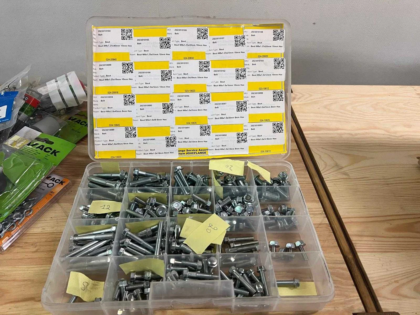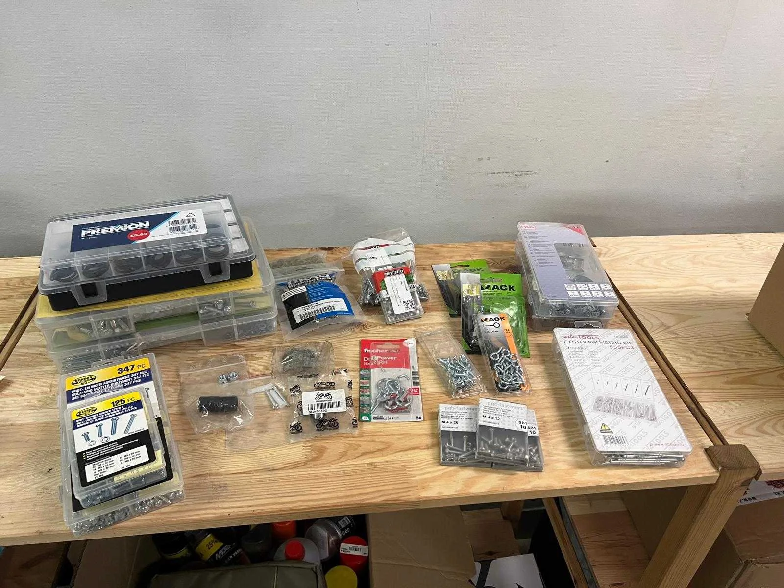 Groot assortiment bevestigingsmateriaal en ijzerwaren, inclusief verschillende sets met vijzen, moeren, pluggen, haken en bevestigingssystemen. Geschikt voor algemene montage en klussen. Sommige verpakkingen zijn nog volledig nieuw en andere zijn gebruikt. Inhoud van deze kavel: - Set PREMION bevestigingsmateriaal in opbergbox - Set metaalwaren in transparante sorteerbox - Set vijzen en moeren - Set schroeven en pluggen - Diverse haken en oogbouten (MACK) - Fischer DuoPower pluggen - Zinkmetaal bouten en moeren (diverse maten) - Staalankers en bevestigingshaken - GRASS metric kit Nee