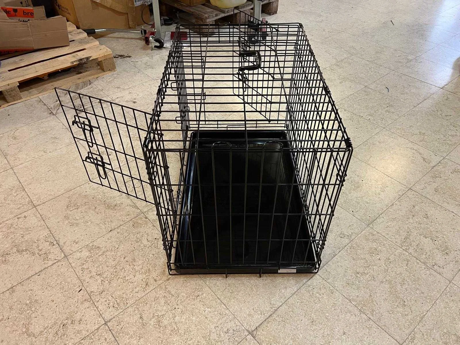 Stevige metalen hondenbench van Duvo+ Topline, voorzien van twee deuren (voor- en zij-ingang) met veiligheidssluitingen en uitneembare kunststof lekbak. Handig inklapbaar voor transport of opslag. In goede gebruikte staat. Nee Merk: Duvo+ Kleur: Zwart Lengte: 77cm Breedte: 48cm Hoogte: 54cm Materiaal: Metaal (staal) met kunststof bodemlade