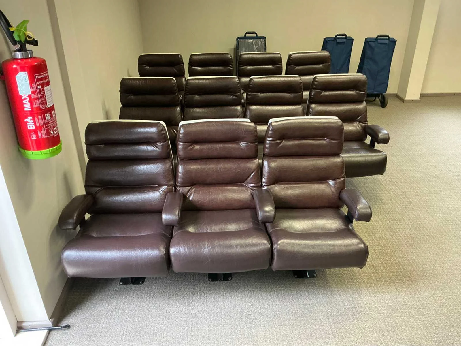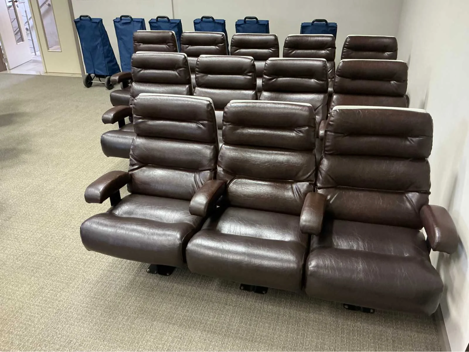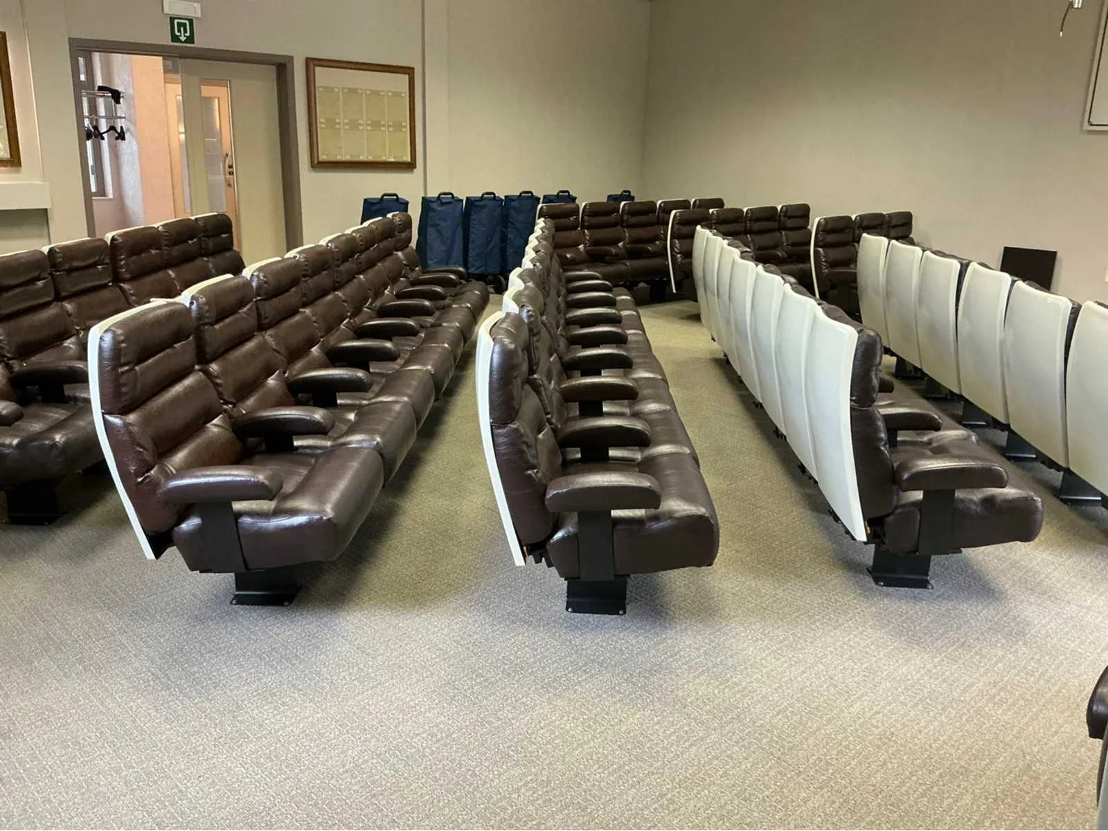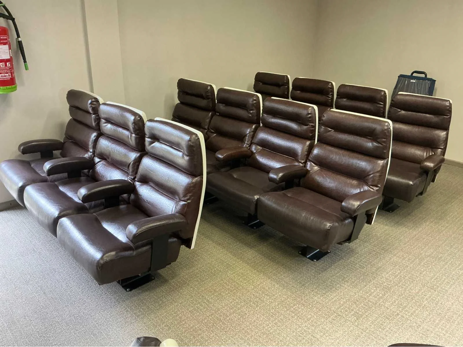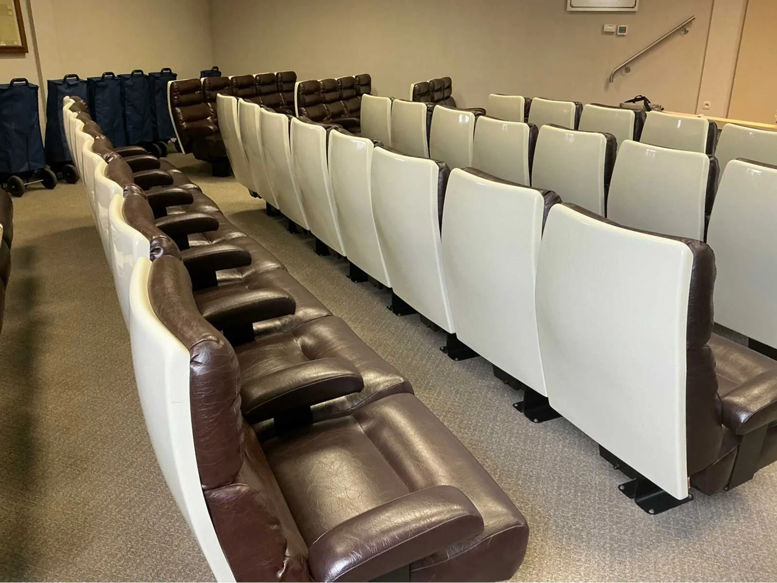 Dit lot bestaan uit 58 theaterstoelen / bioscoopstoelen / cinemastoelen zijn zowel verder aan elkaar te maken voor een lange brede rij te vormen of per 1 te plaatsen en naar mate mogelijk. Bevinden zich in goede en gebruikte staat en zitten behoorlijke comfortabel. De opstelling bestaat uit: 2 rij van 3, 3 rij van 4, 1 rij van 5, 2 rij van 6, 1 rij van 7, 2 rij van 8. Nee Kleur: Bruin Breedte: 60 Materiaal: Leder