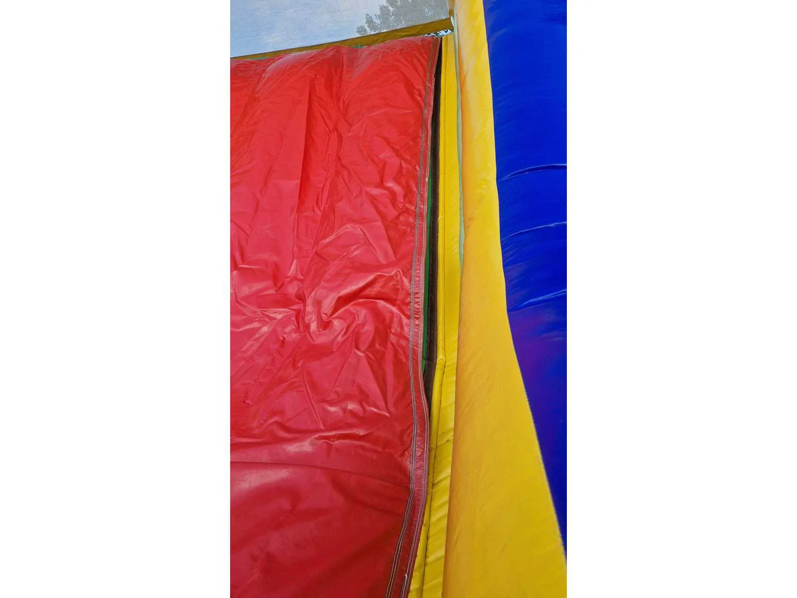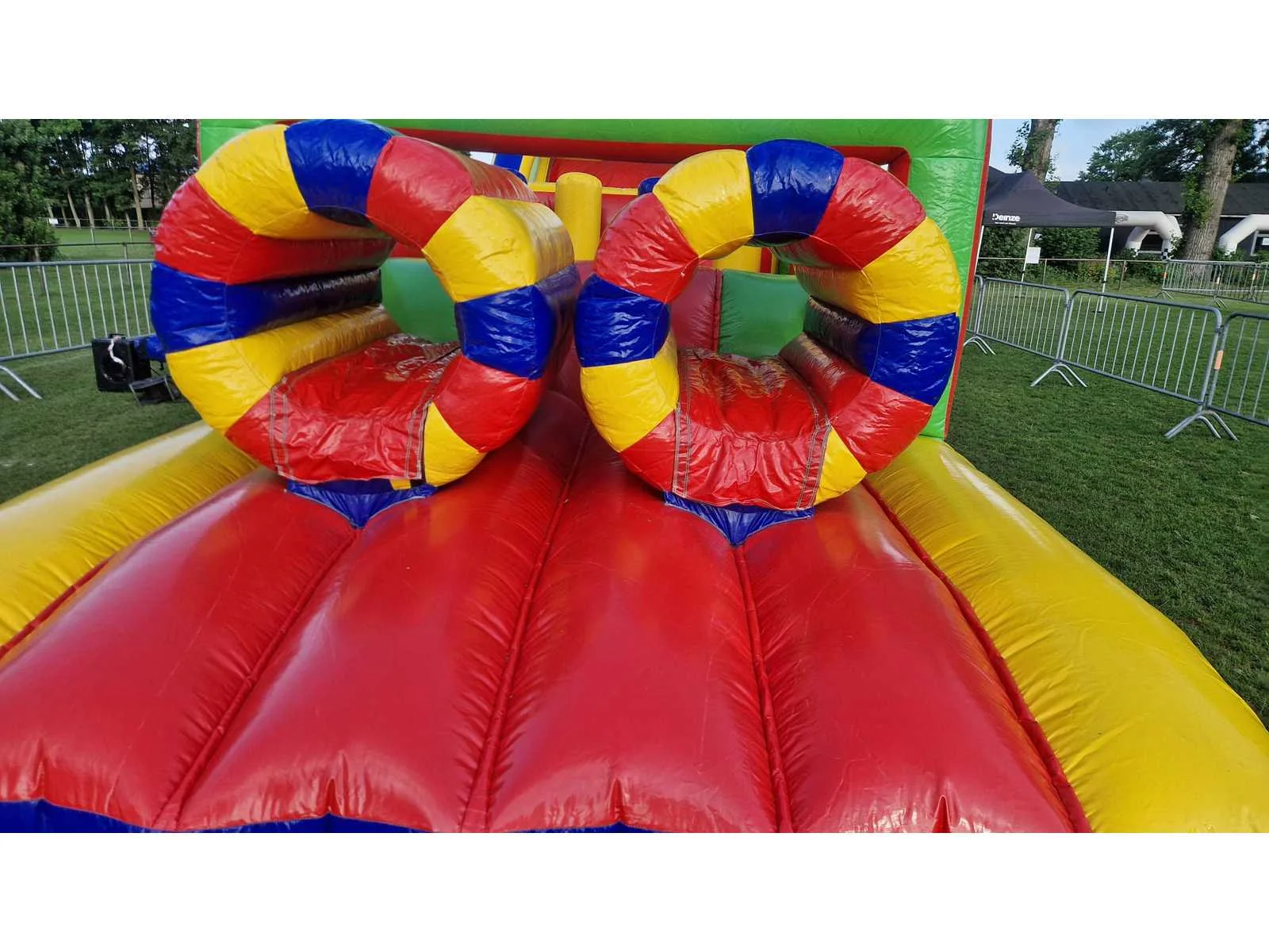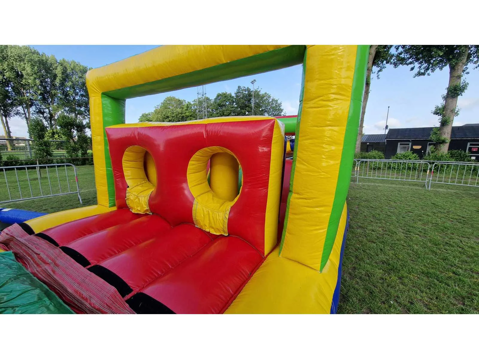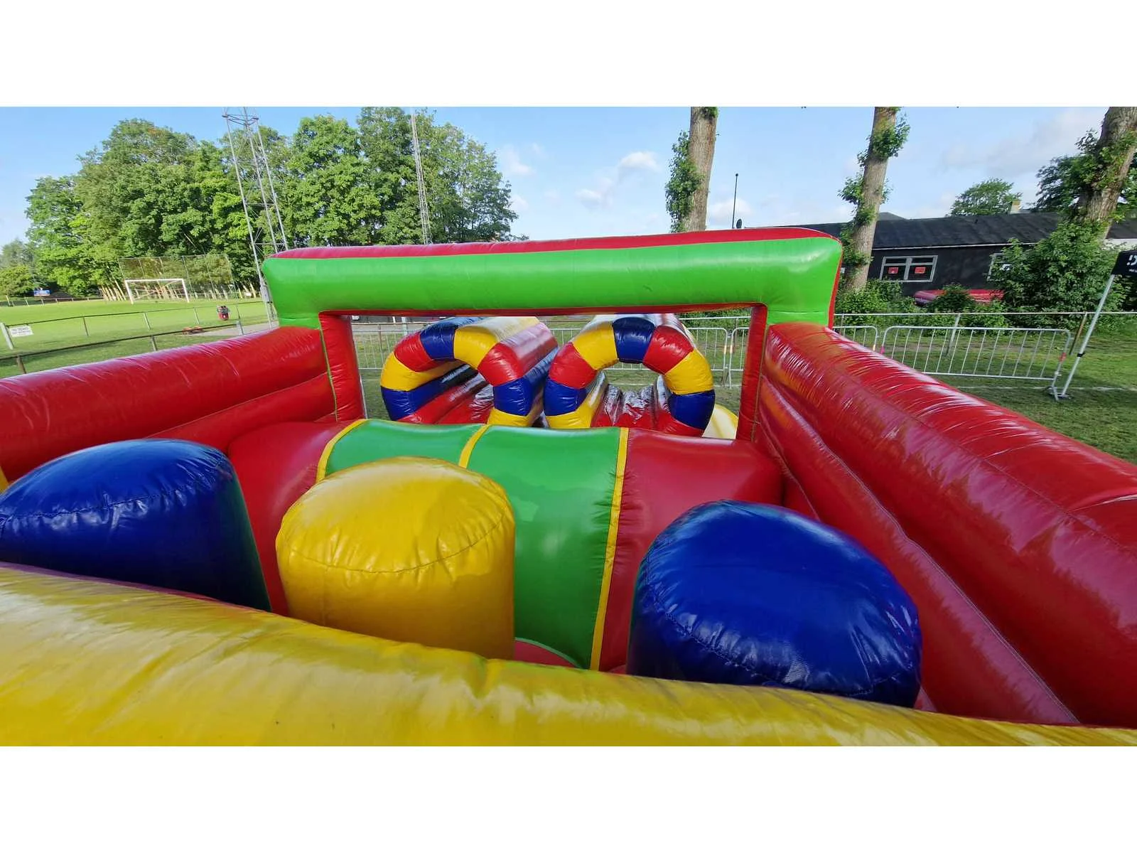 Bestaat uit 3 delen <gr> 3 blowers <gr> 6 haringen <gr> velcro moet vernieuwd worden <gr> beschikt niet over een EN-14960 certificaat Nee Lengte: 2100cm Breedte: 400cm Hoogte: 400cm