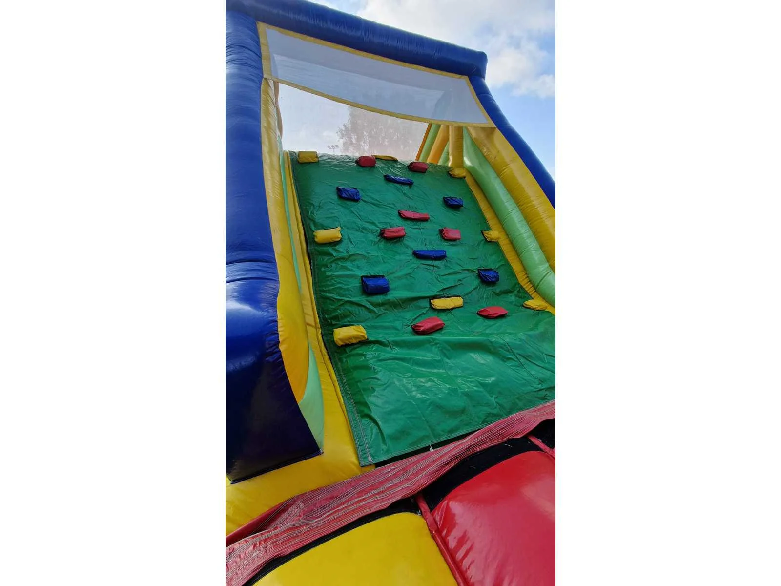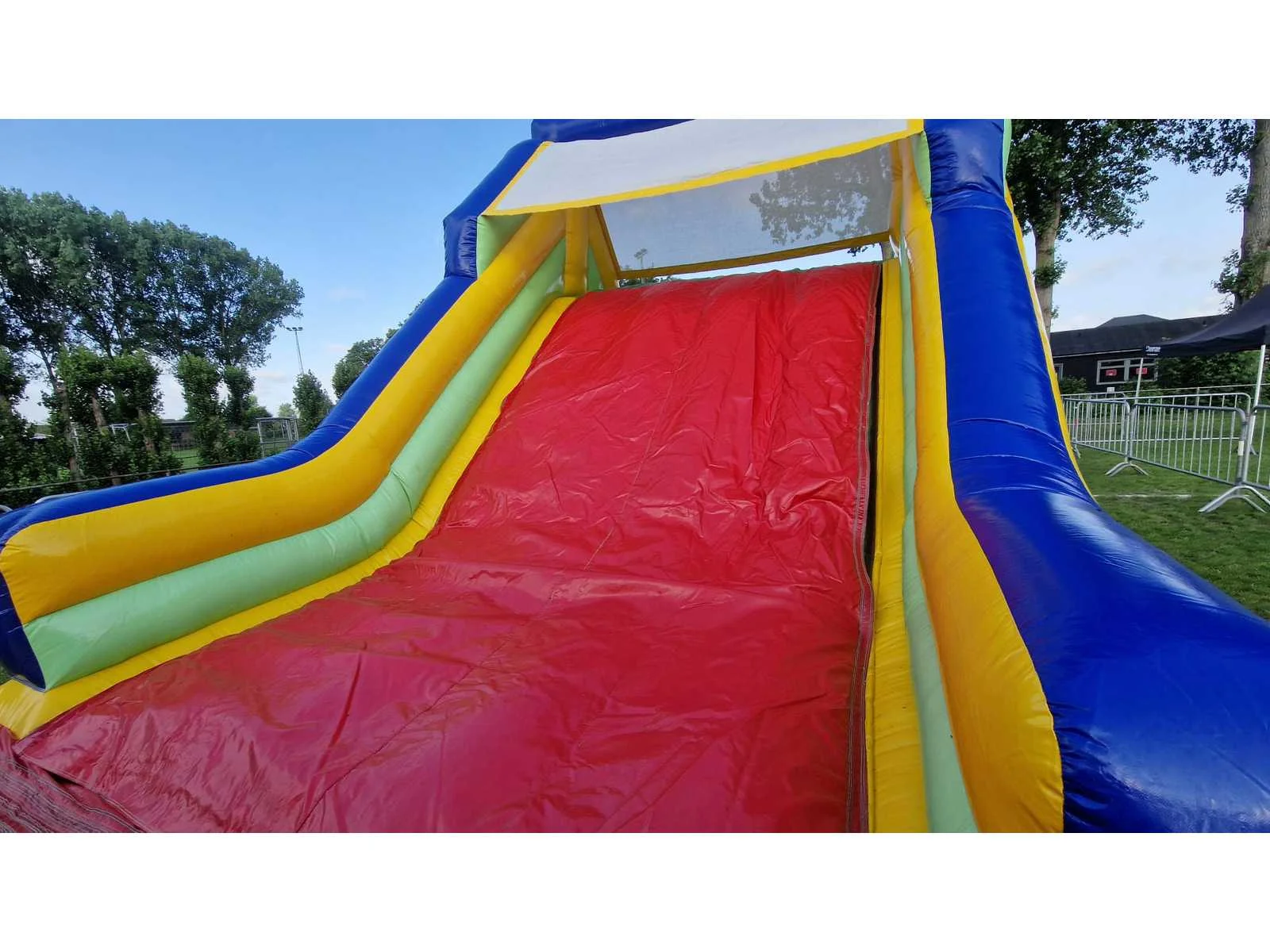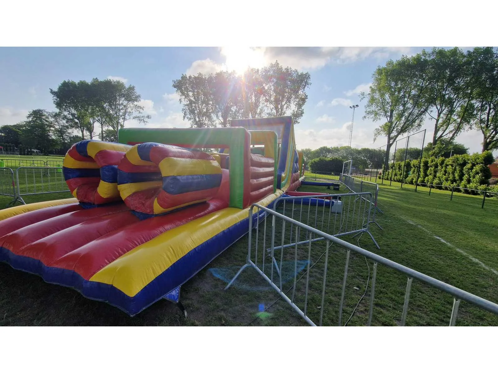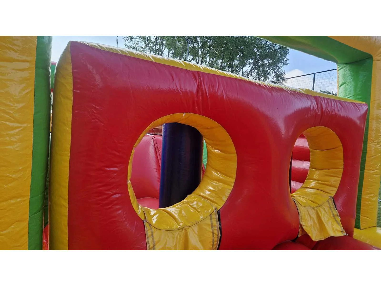 Bestaat uit 3 delen <gr> 3 blowers <gr> 6 haringen <gr> velcro moet vernieuwd worden <gr> beschikt niet over een EN-14960 certificaat Nee Lengte: 2100cm Breedte: 400cm Hoogte: 400cm
