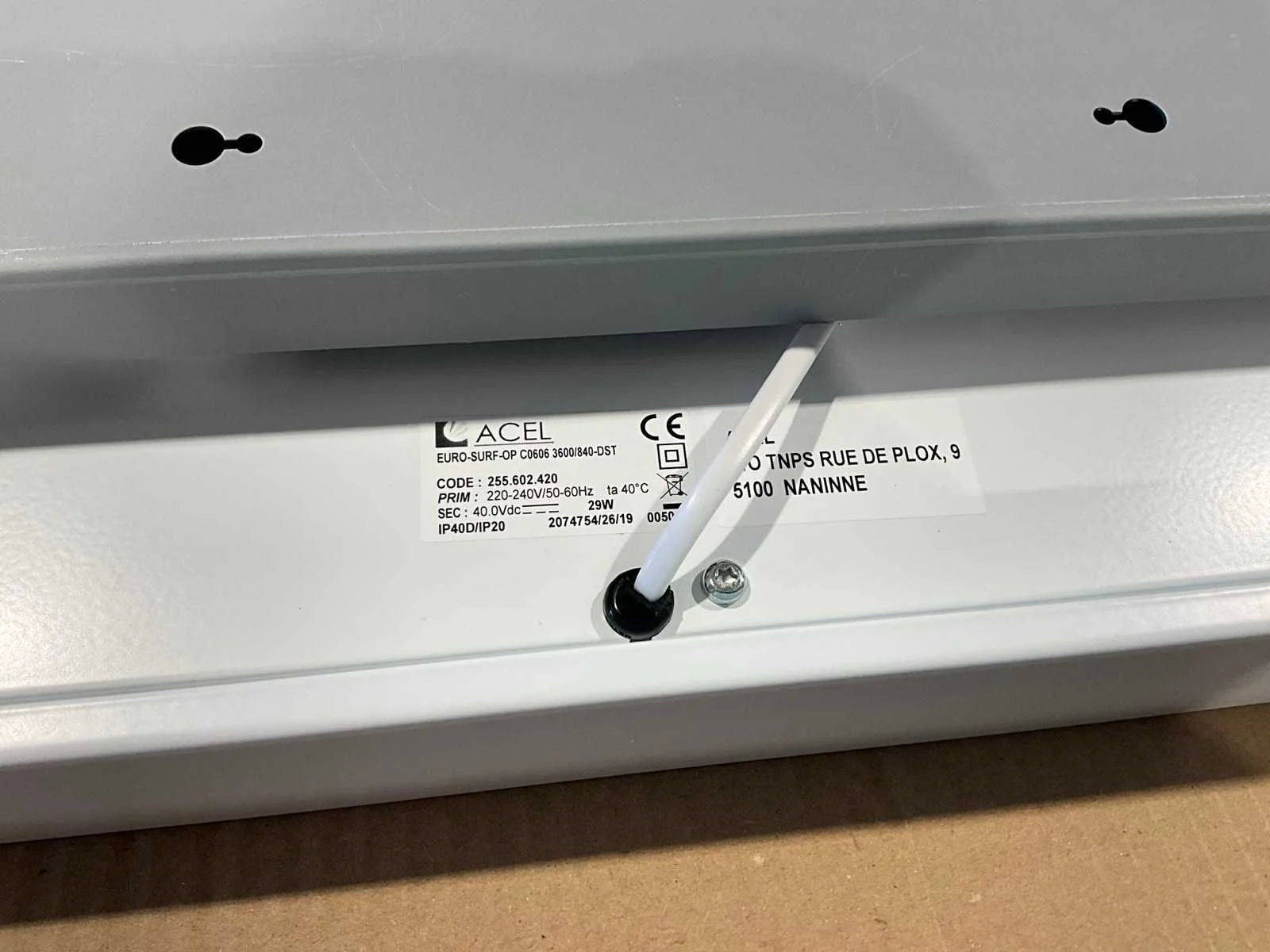 Set LED-paneel met frame voor oppervlaktebevestiging. Nieuw Vermogen: 29W – 3600 lm Kleurtemperatuur: 4000K (neutraal wit) Lichtkwaliteit: CRI 80, 3 SDCM Levensduur: 70.000 uur (L80B10) Beschermingsklasse: IP40 – IK06 Driver inbegrepen: niet-dimbaar (DST 700mA) Fabricage gemaakt in Europa Staat: 51 - Individuele doos - 1 pallet No Merk: ACEL Model: Eurosurf