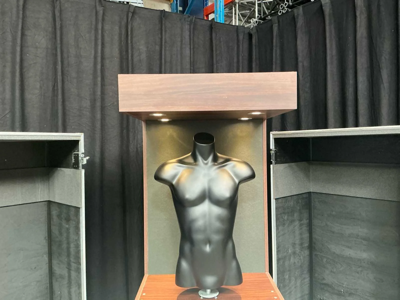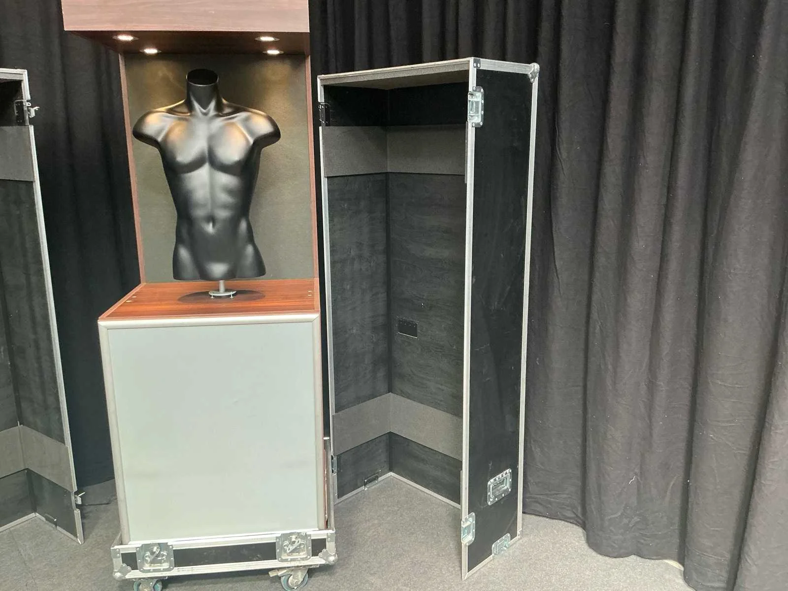 Paspop met kastinrichting. Het lot bevat ook de flightcase voor het vervoeren van de paspop. Nee Kleur: Bruin Heren: true